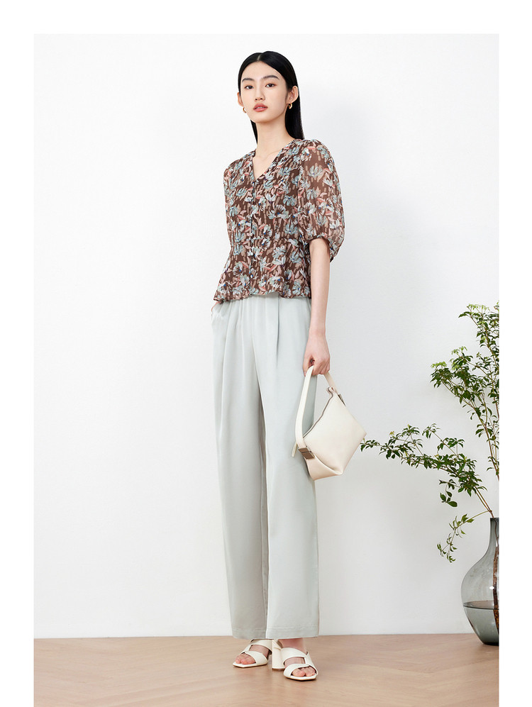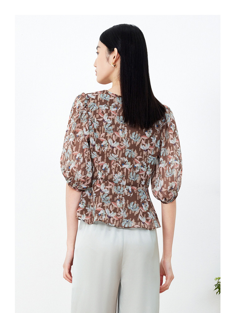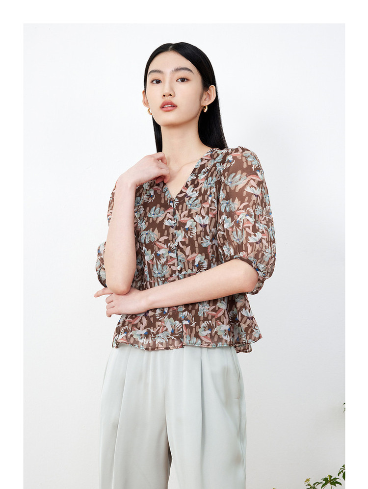 玖姿旗下安娜蔻系列印花雪纺衬衫女装夏季V领泡泡袖轻盈感上衣 086028