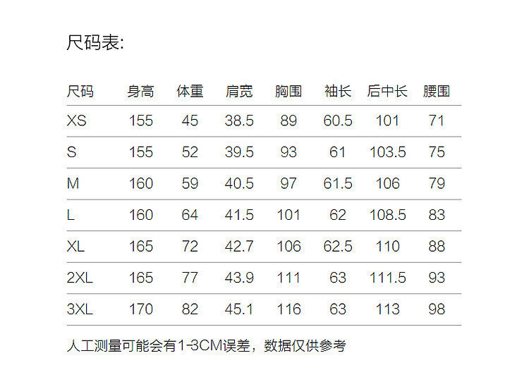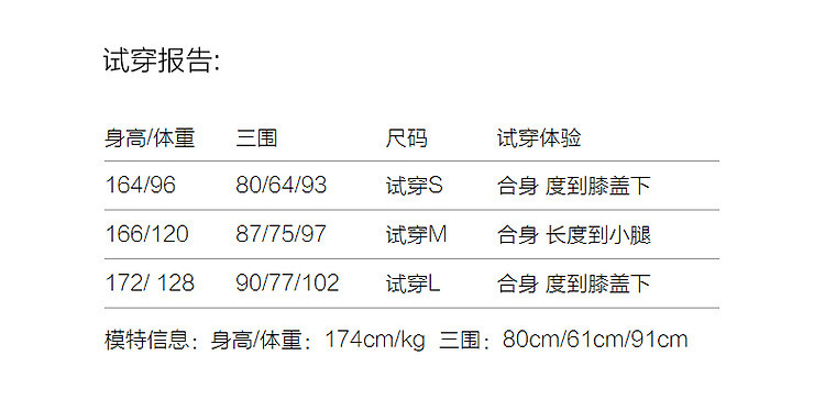 | 尺码 | 裙长(cm) | 肩宽(cm) | 腰围(cm) | 袖长(cm) | 胸围(cm) | 号型 |