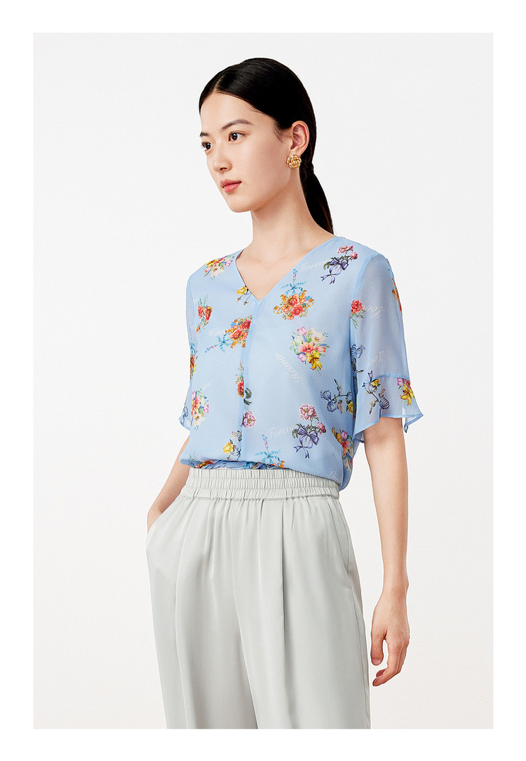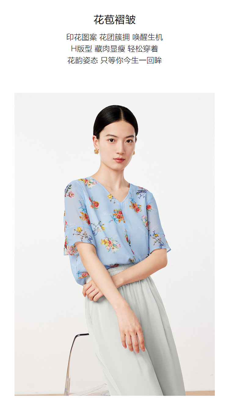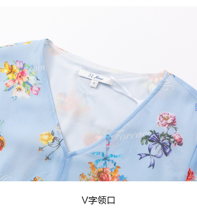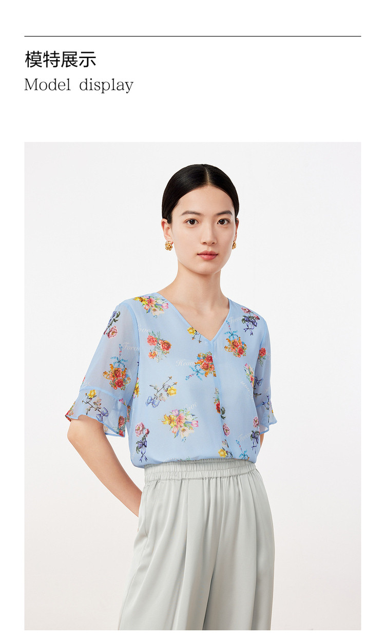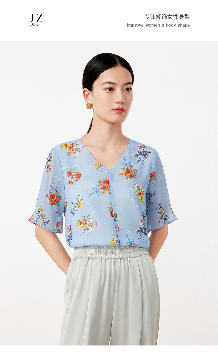 商品名称:玖姿夏季花卉点缀时尚V领桑蚕丝女式T恤 519628