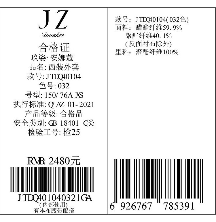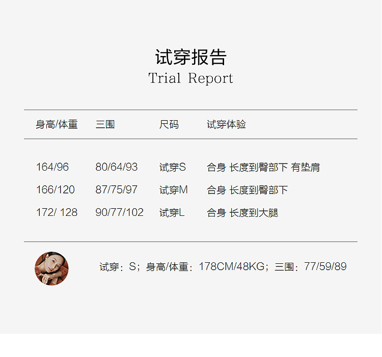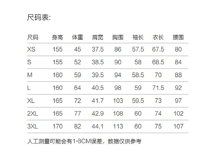 | 尺码 | 衣长(cm) | 肩宽(cm) | 腰围(cm) | 袖长(cm) | 胸围(cm) | 号型 |