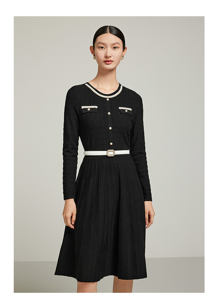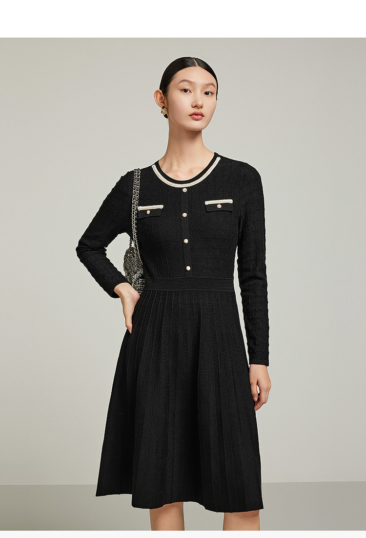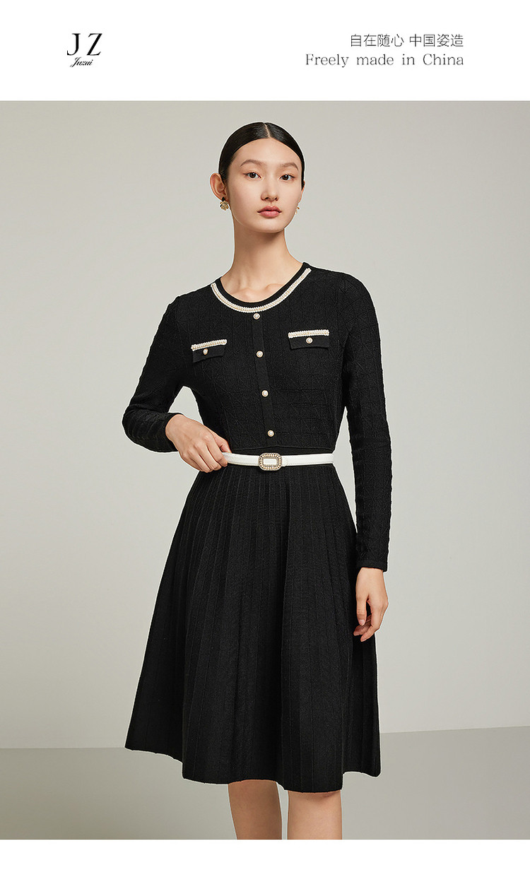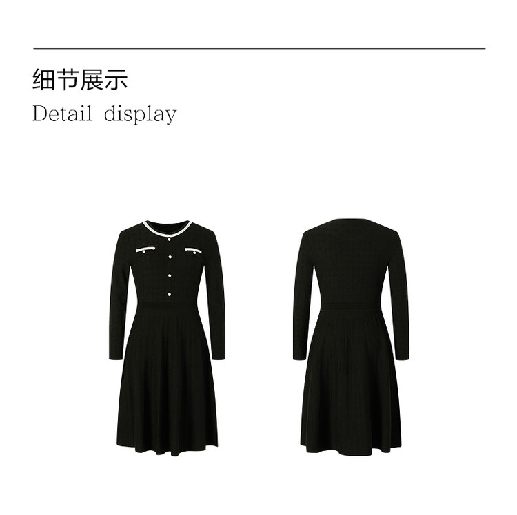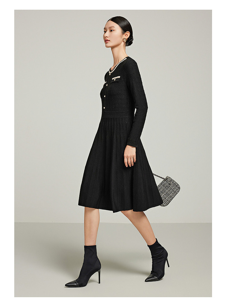 商品名称:小香风复古小黑裙女装冬季条纹肌理羊毛连衣裙 477324
