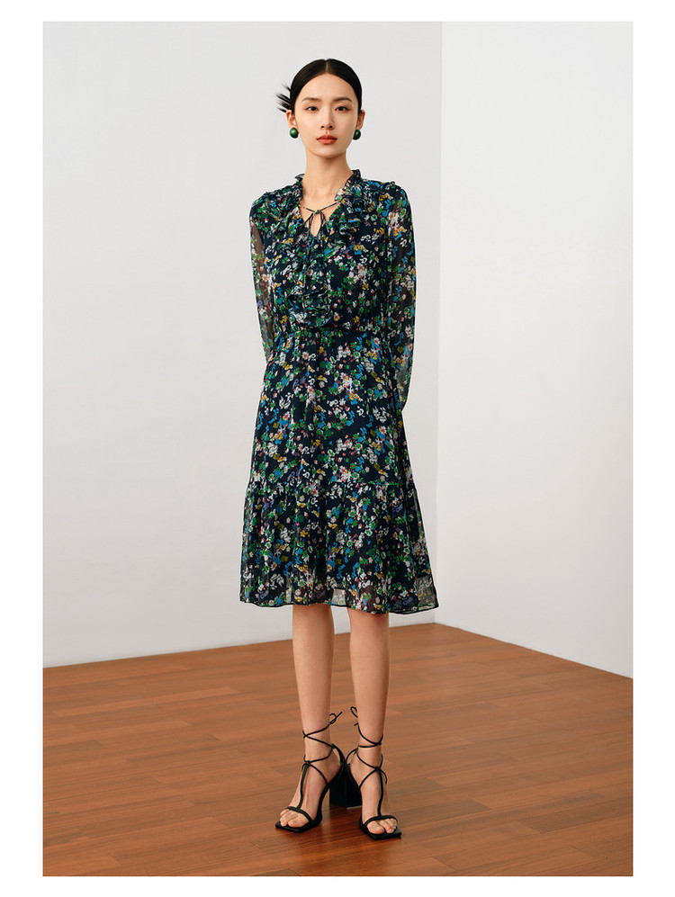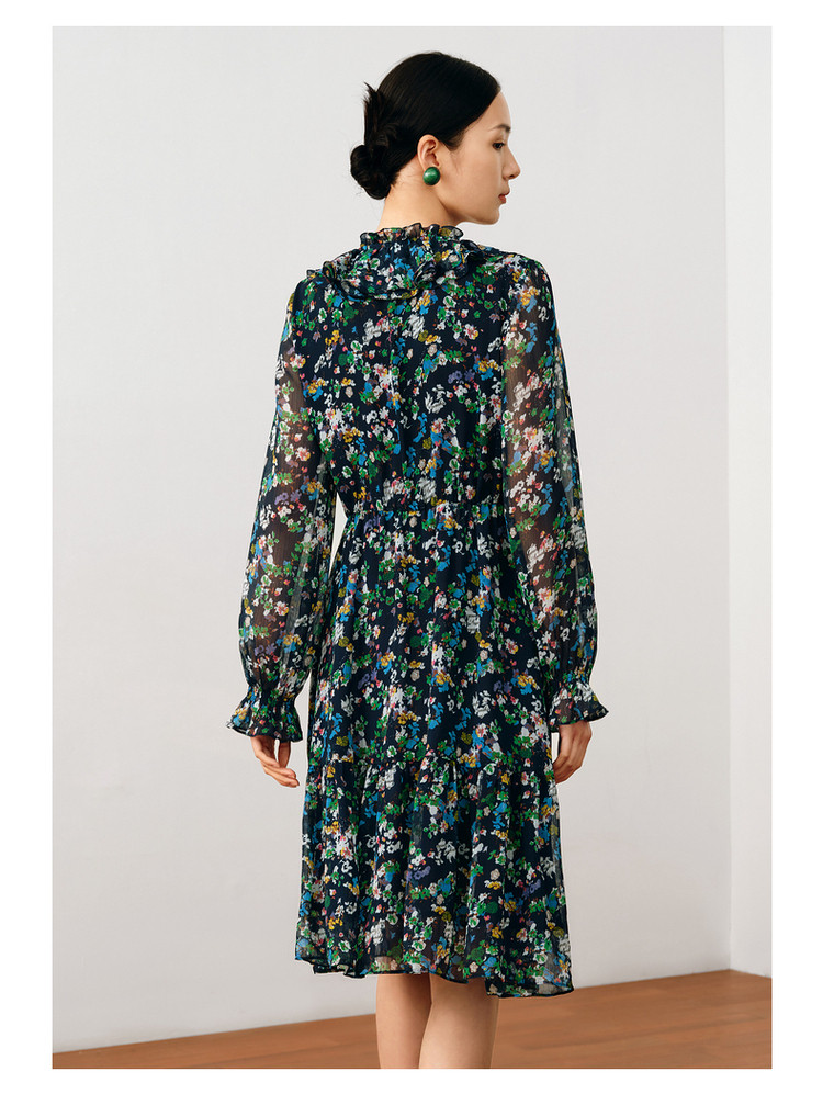 玖姿旗下安娜蔻系列波普风碎花X型雪纺印花浪漫优雅连衣裙女秋季 611980
