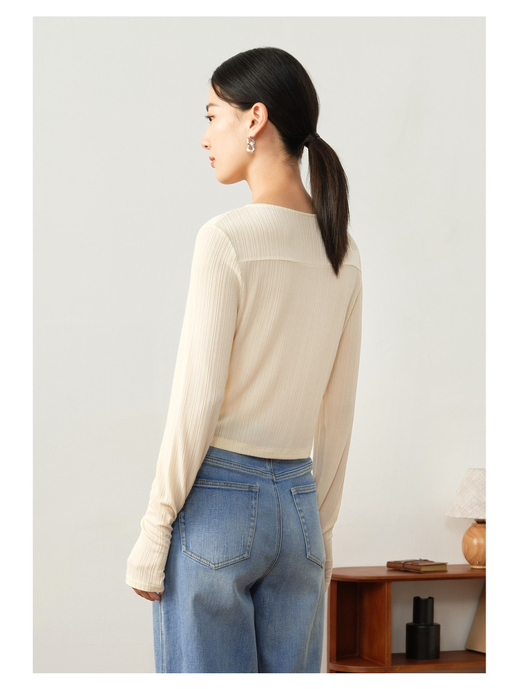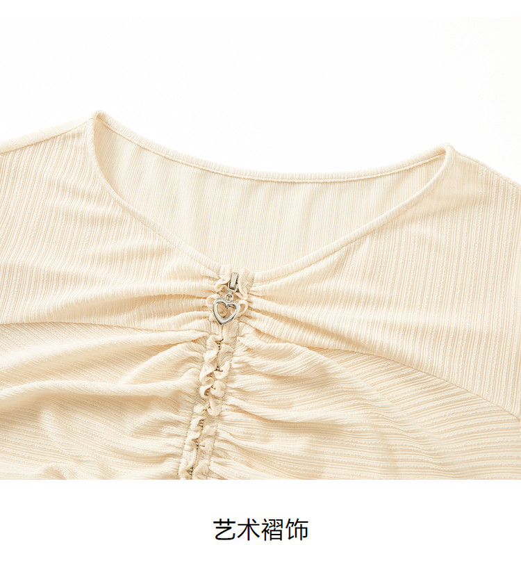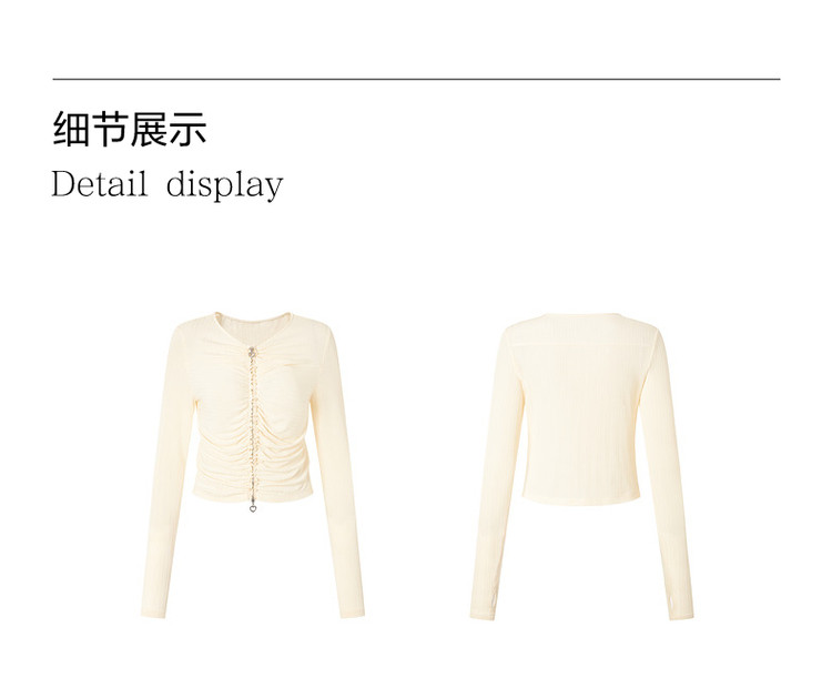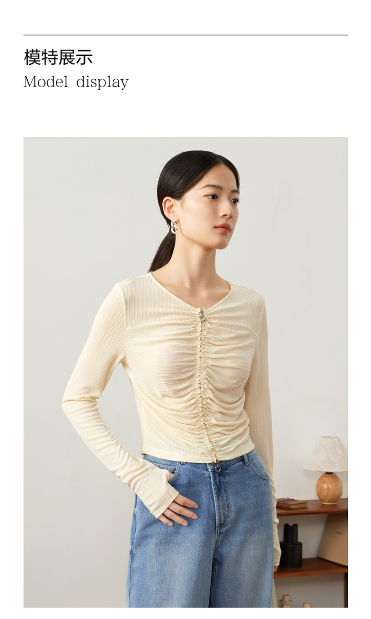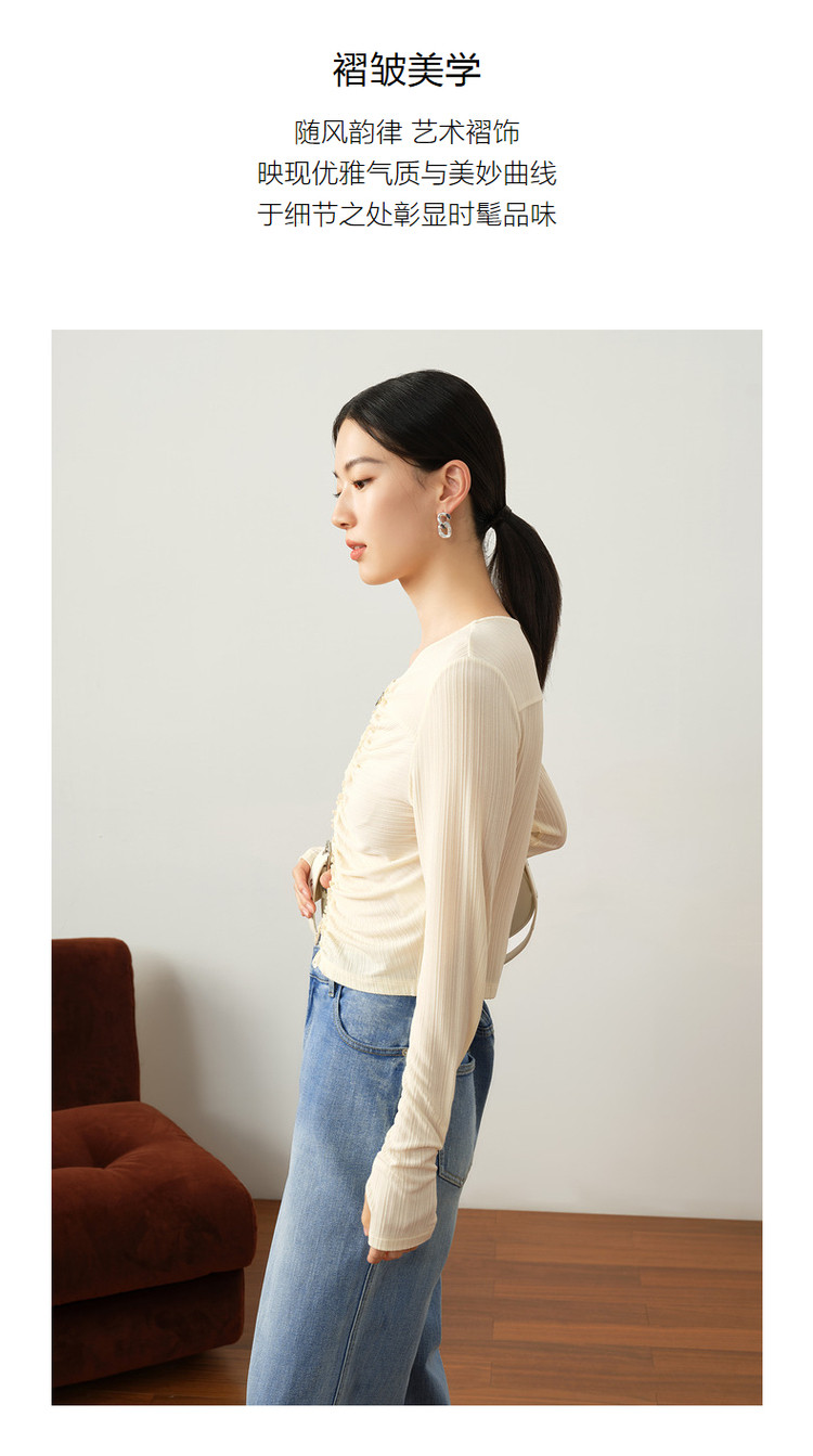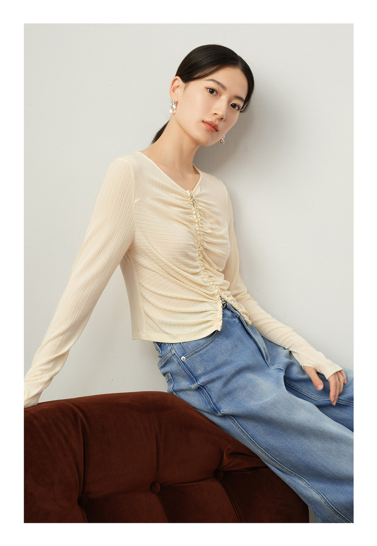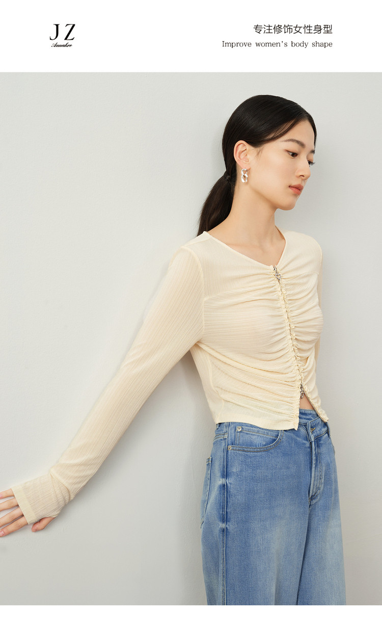 玖姿旗下安娜蔻系列休闲褶皱修身醋酸针织长袖衬衫女秋季 514252
