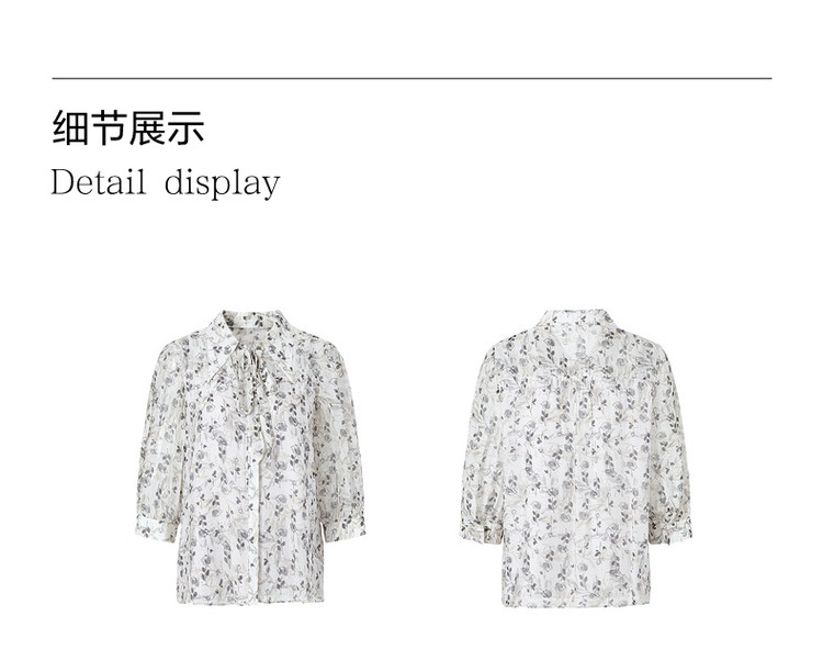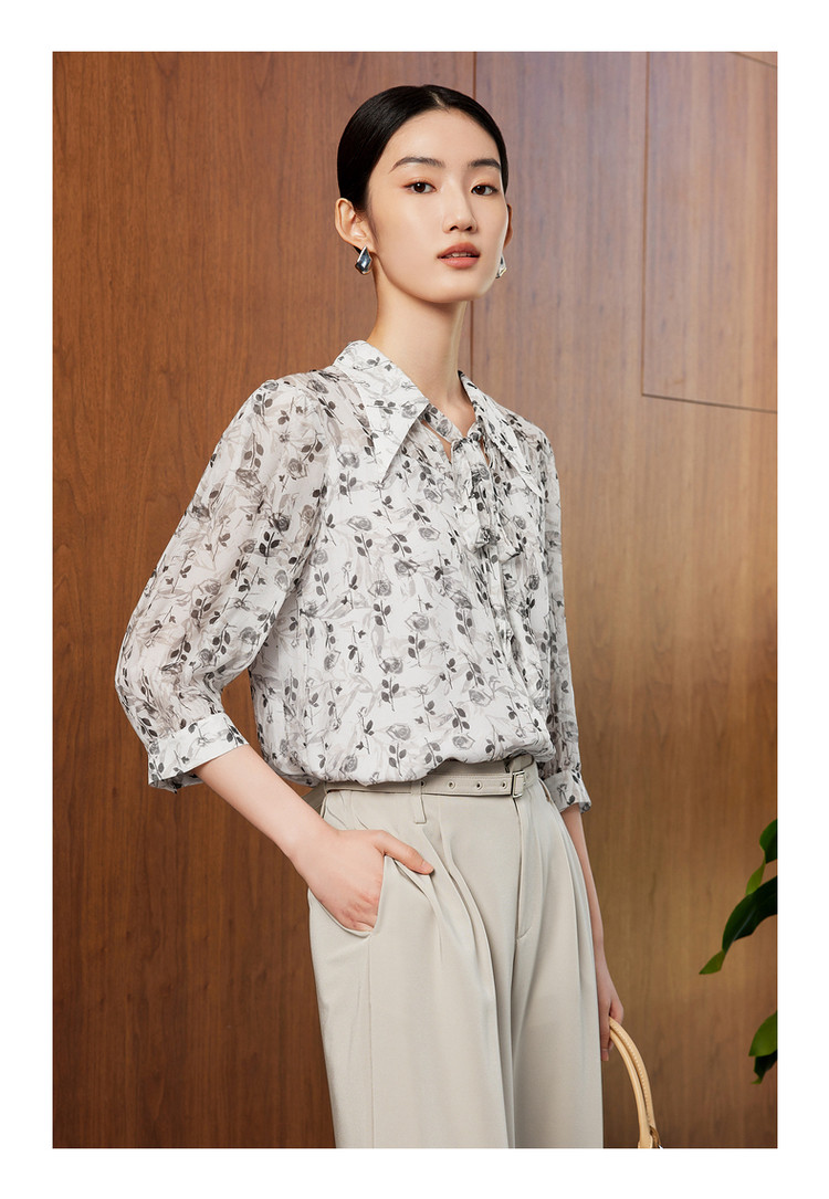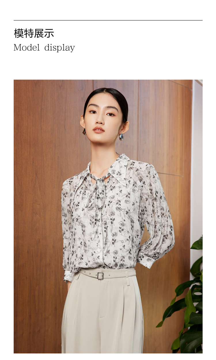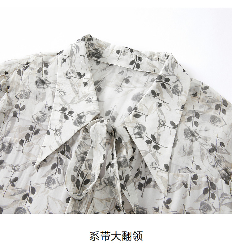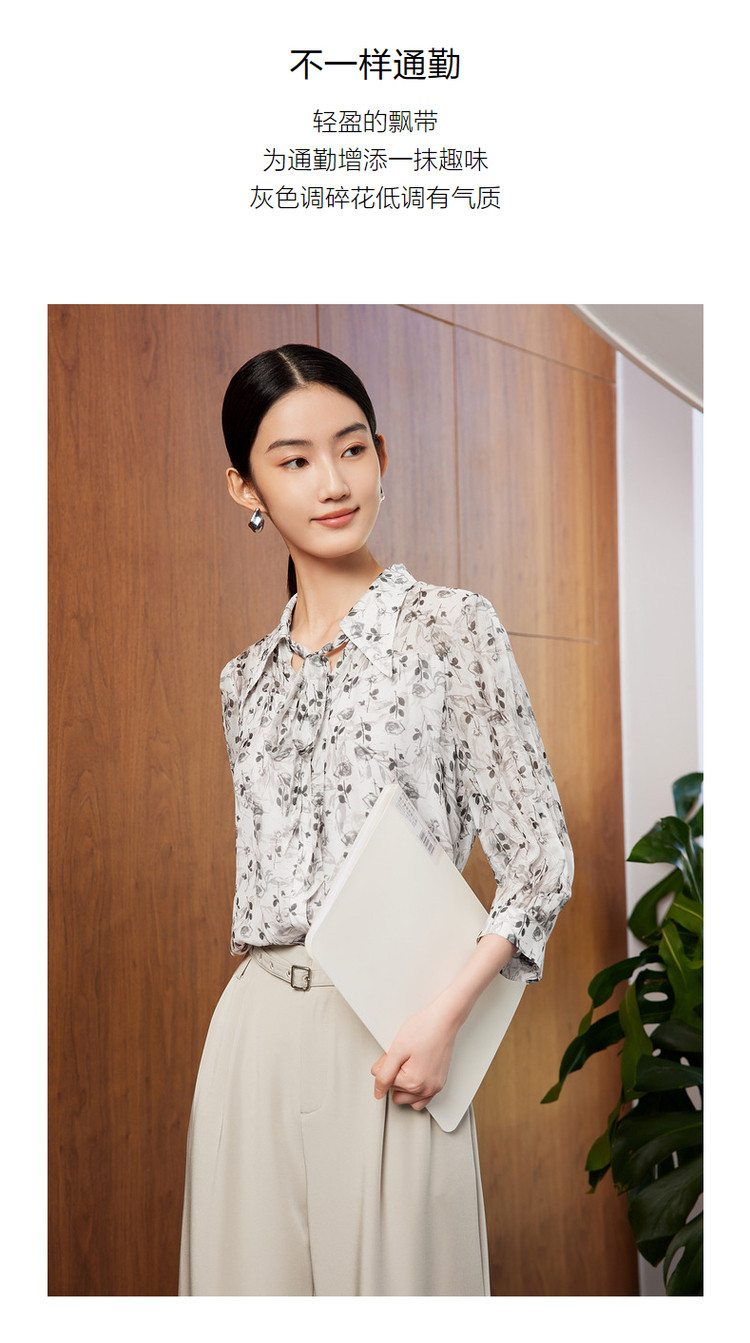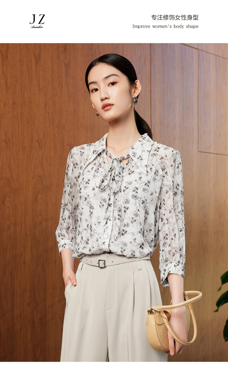商品名称:玖姿旗下安娜蔻系列直筒女装夏季通勤印花飘带桑蚕丝上衣 222732