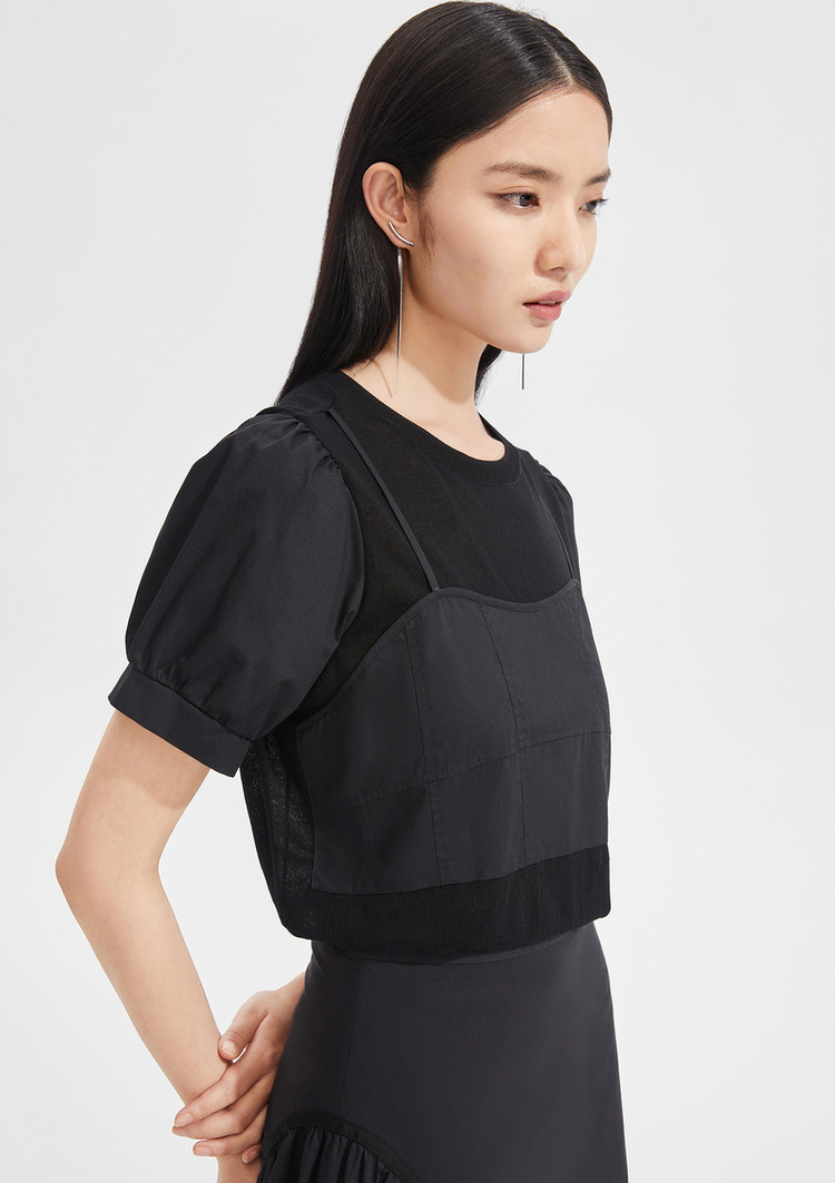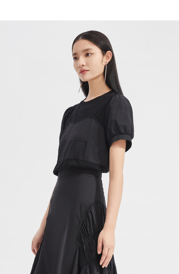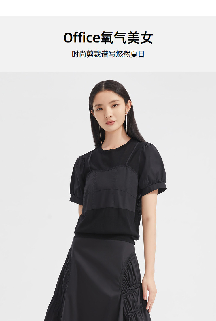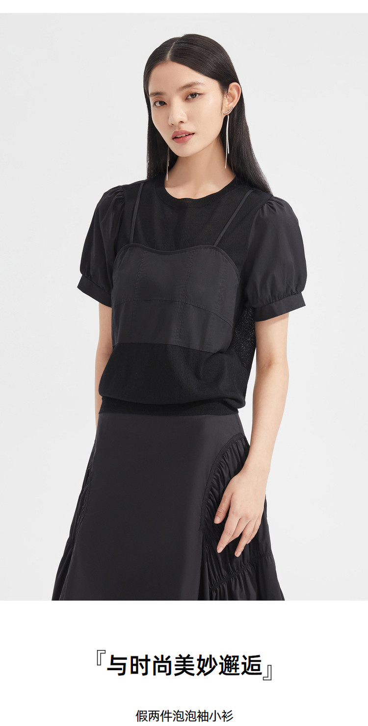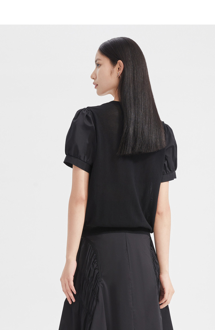 JZ玖姿夏季时尚法式拼接泡泡袖简约圆领女式针织衫 701580