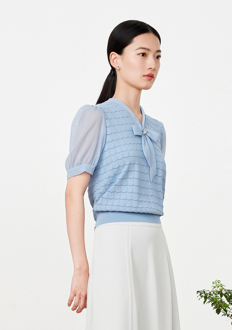 玖姿旗下安娜蔻系列夏季气质V领泡泡袖女式短袖针织衫 469196