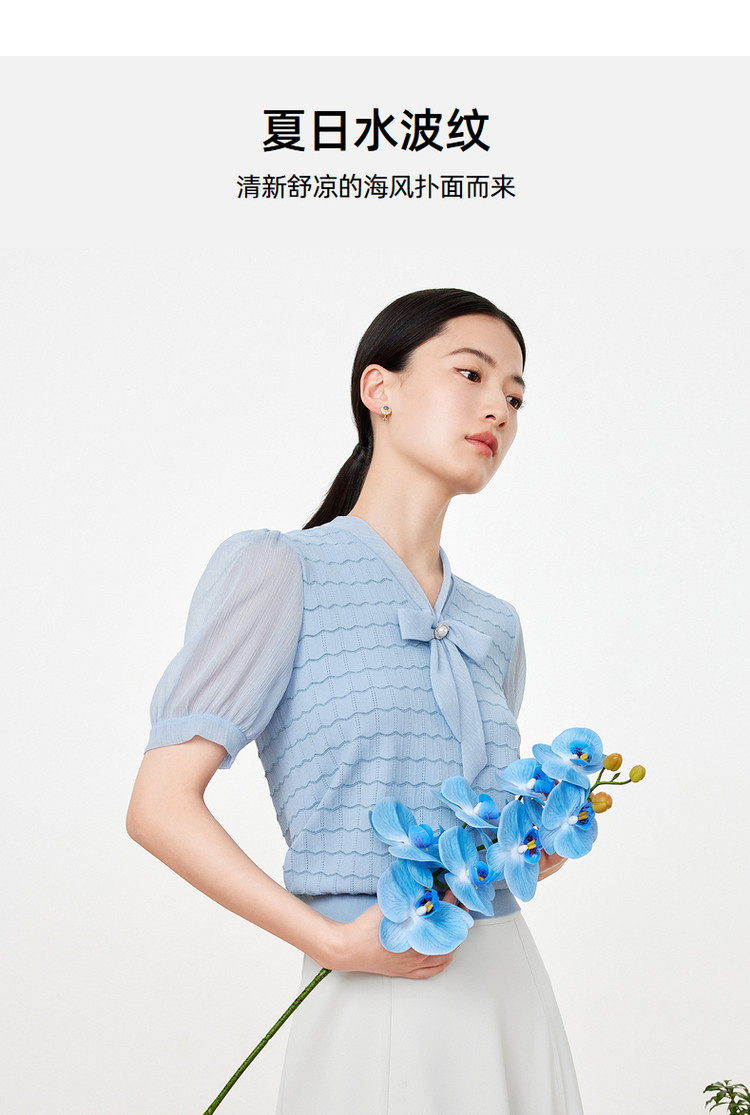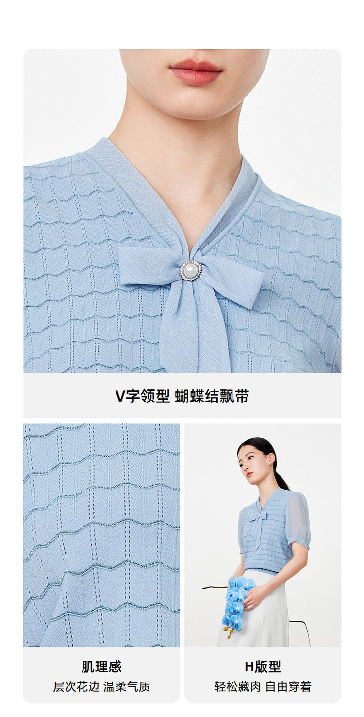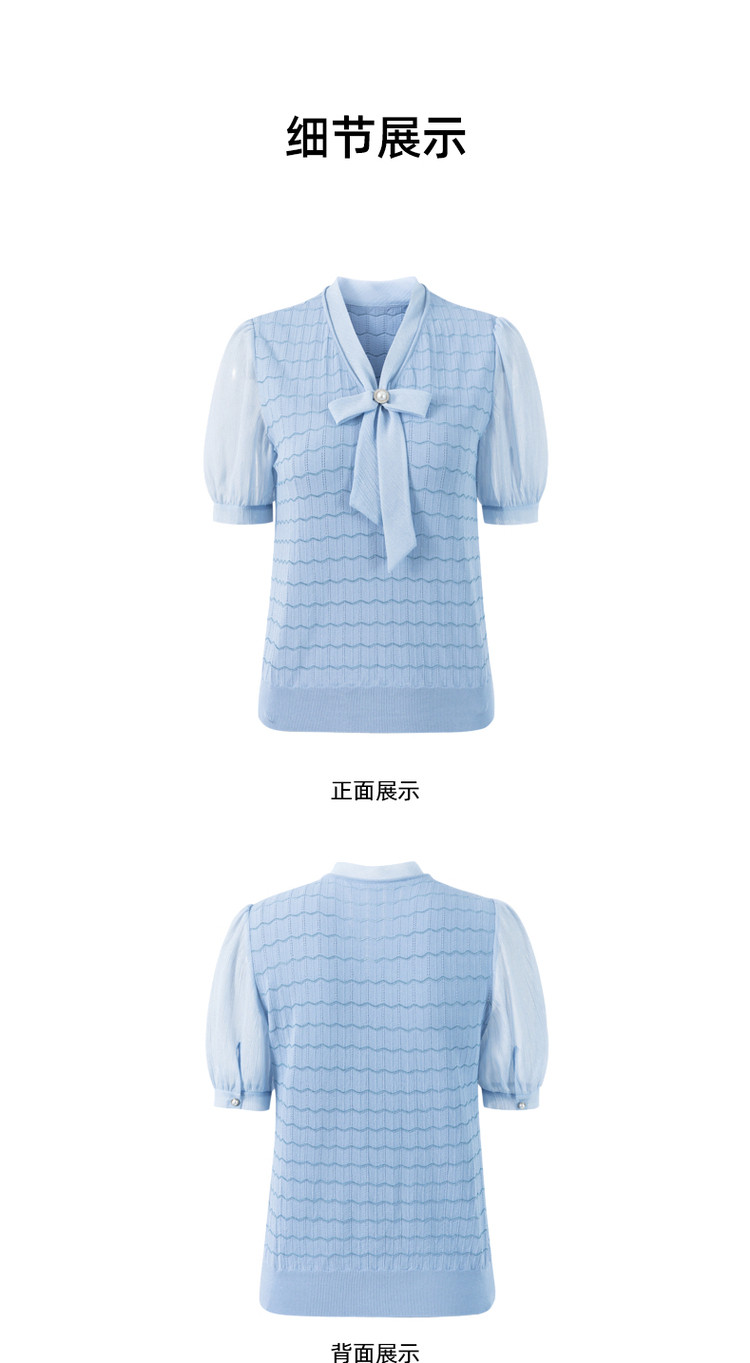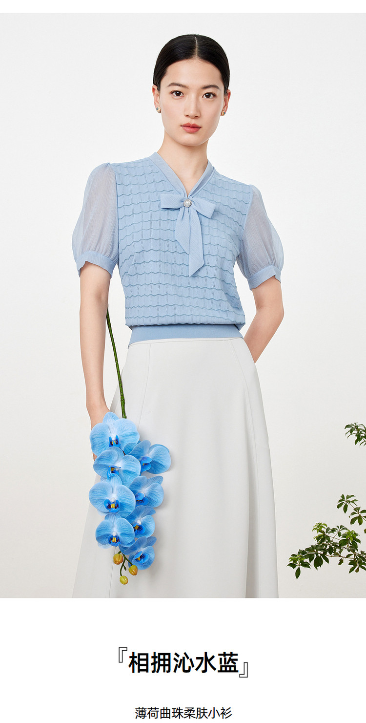 商品名称:玖姿旗下安娜蔻系列夏季气质V领泡泡袖女式短袖针织衫 469196