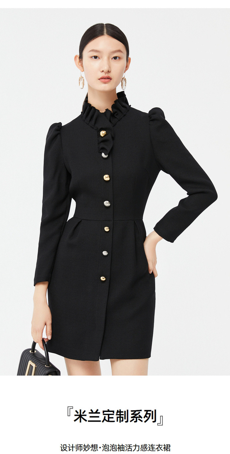 玖姿时尚商场同款春季泡泡袖荷叶边立领收腰连衣裙 371596
