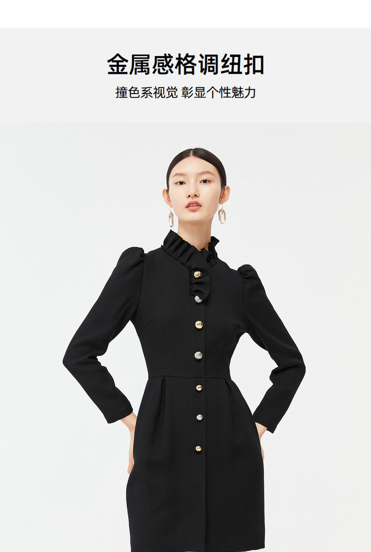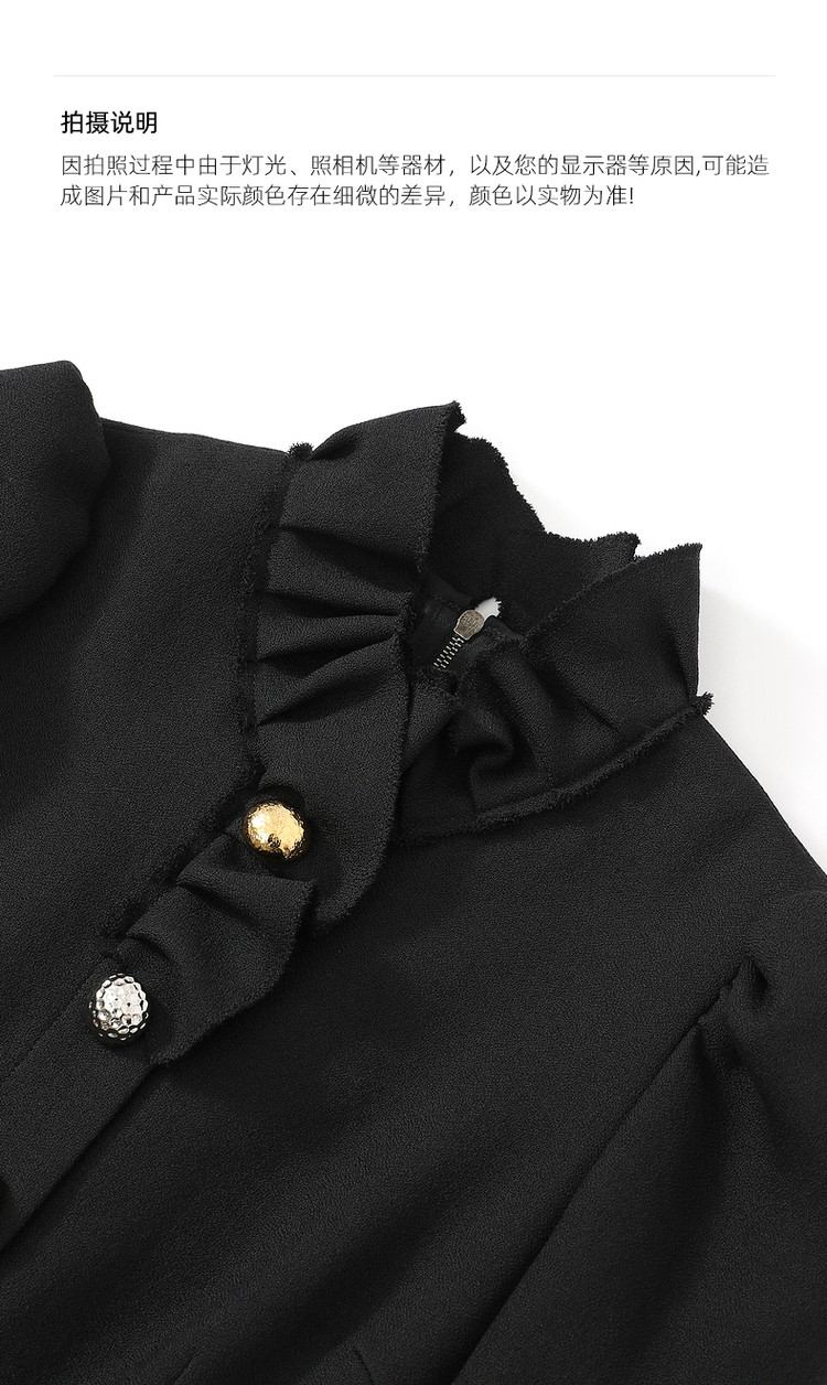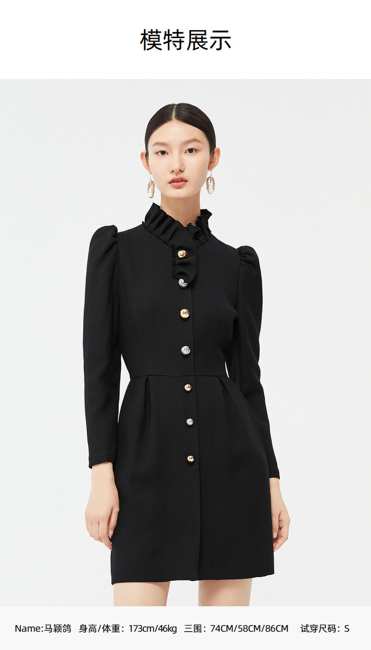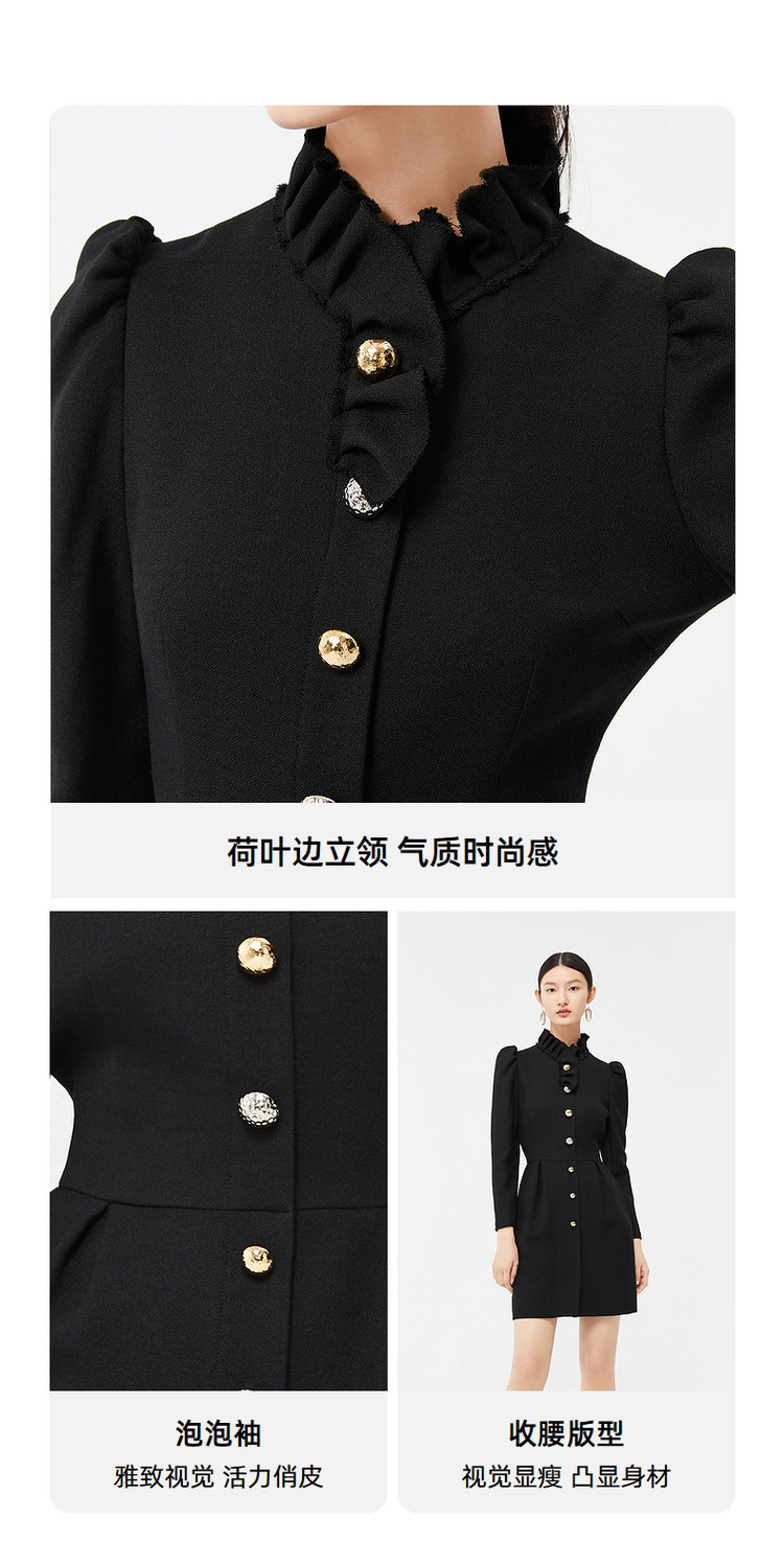 商品名称:玖姿时尚商场同款春季泡泡袖荷叶边立领收腰连衣裙 371596