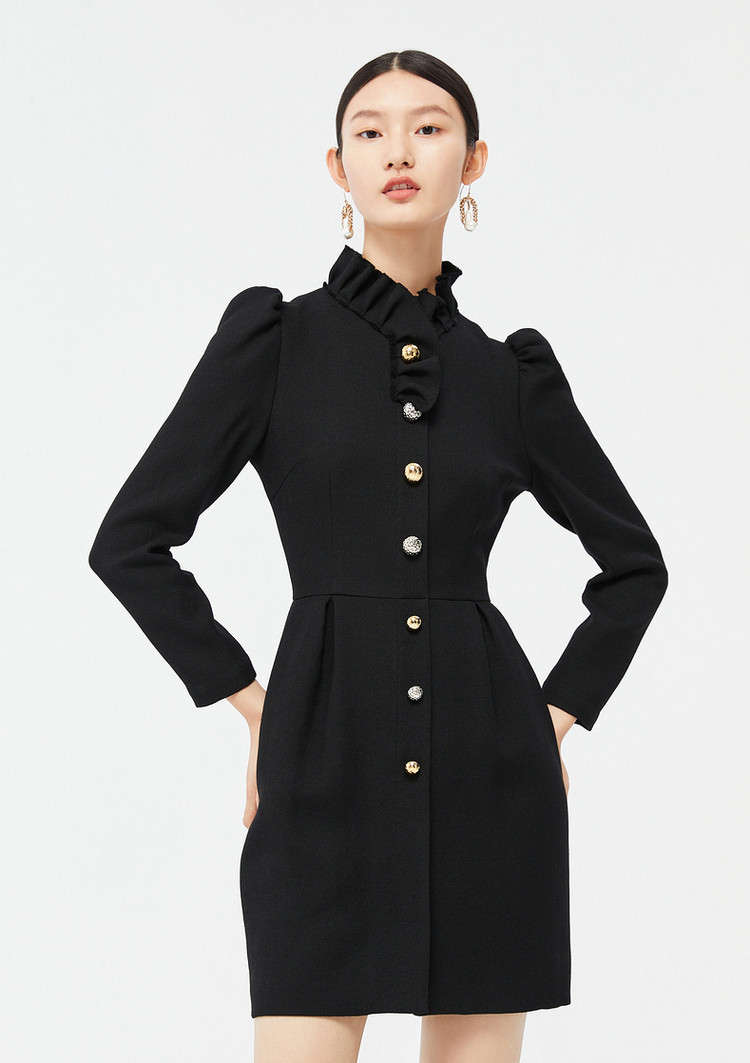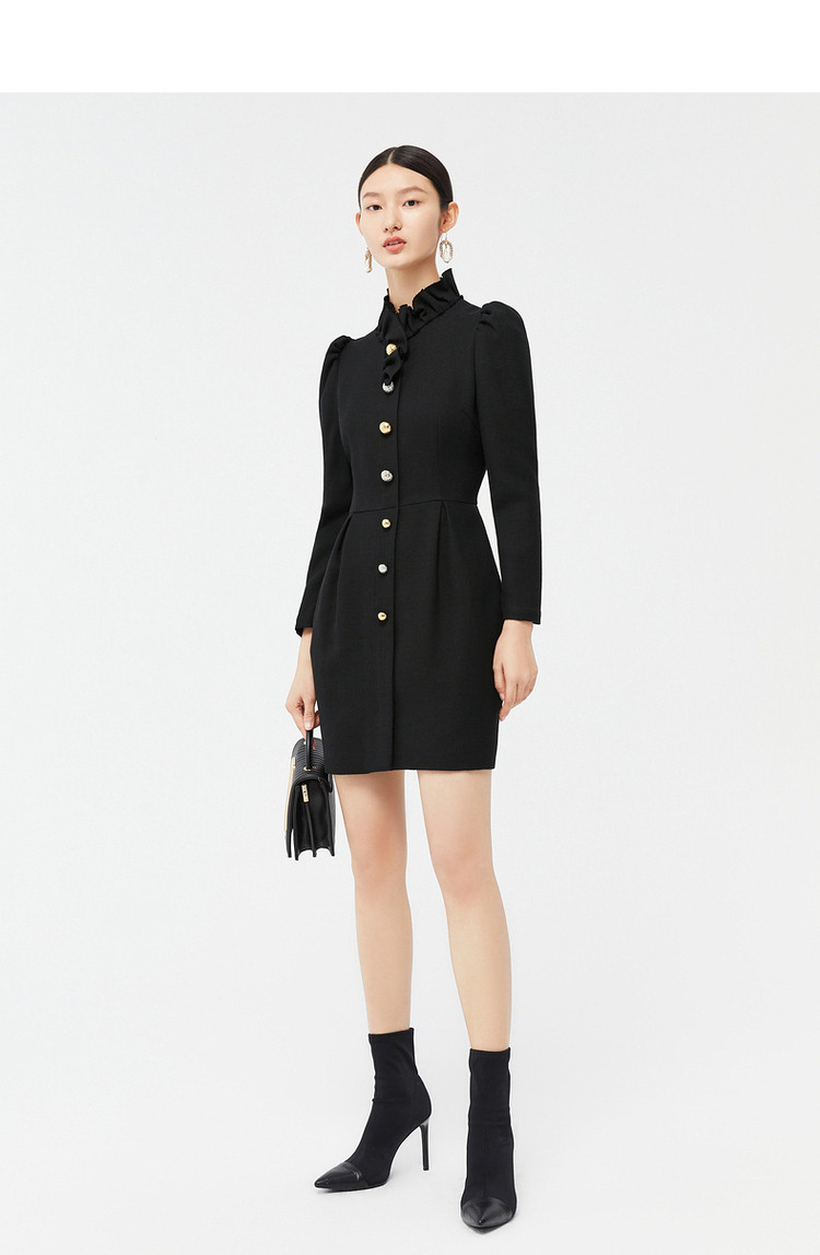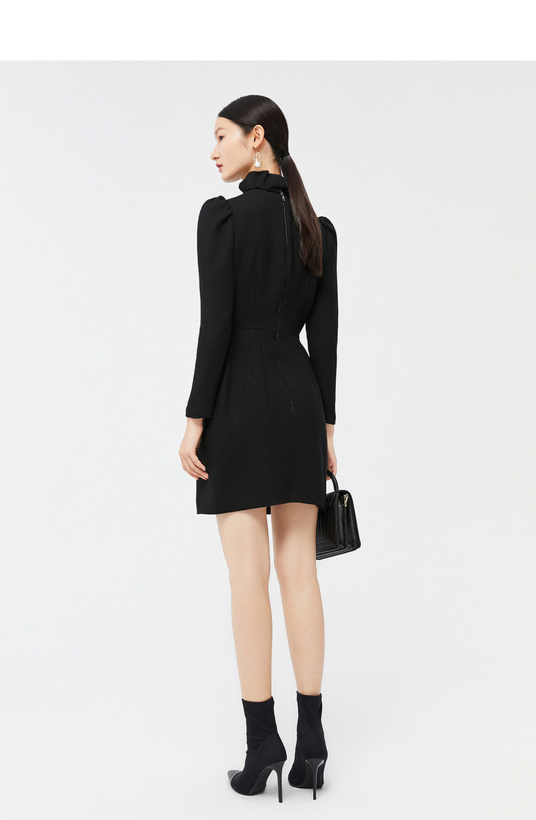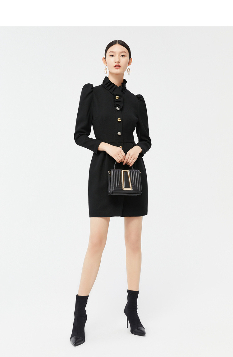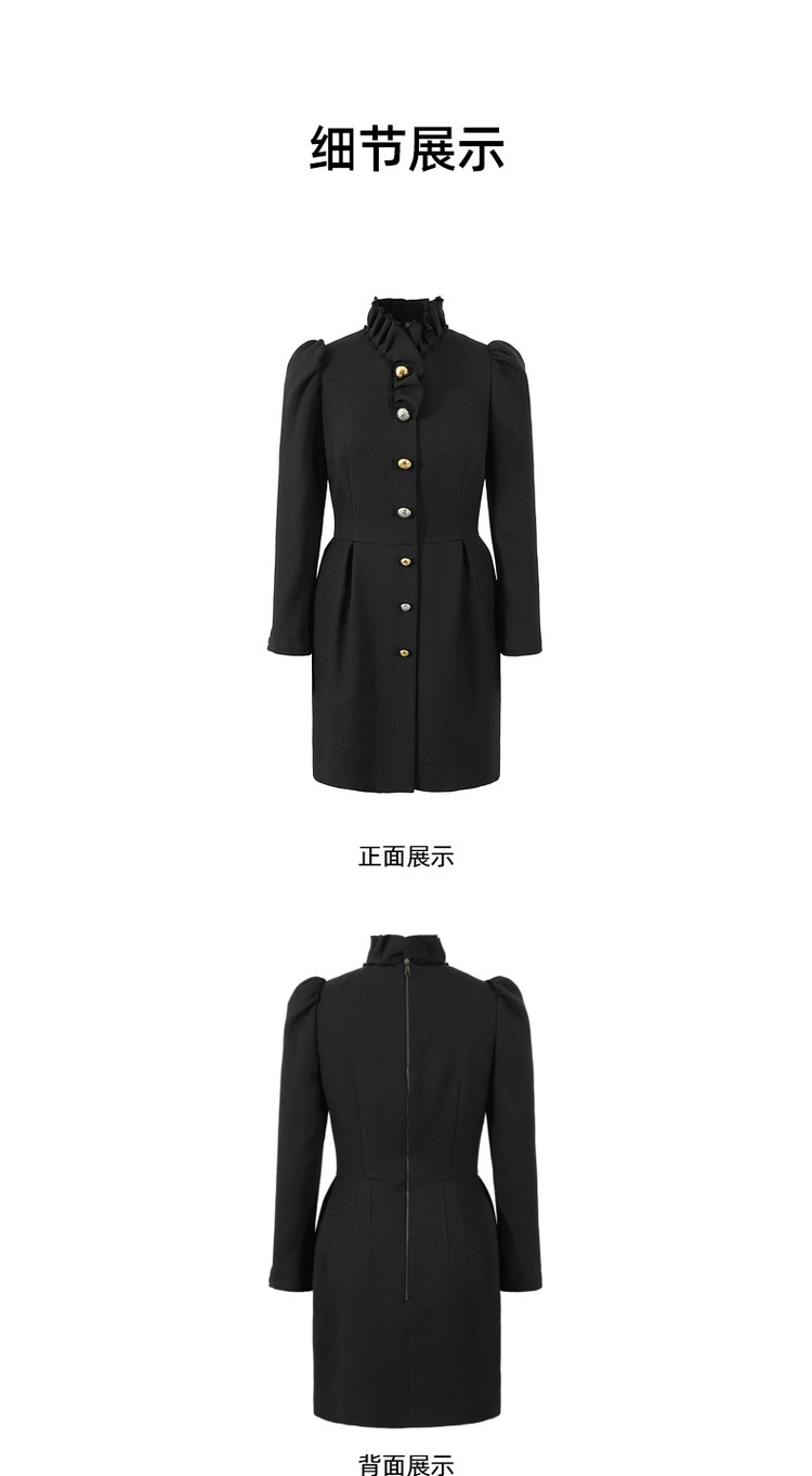 商品名称:玖姿时尚商场同款春季泡泡袖荷叶边立领收腰连衣裙 371596