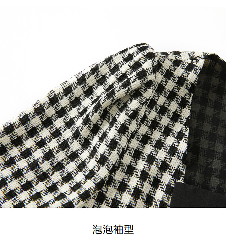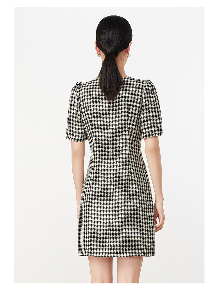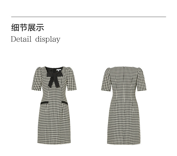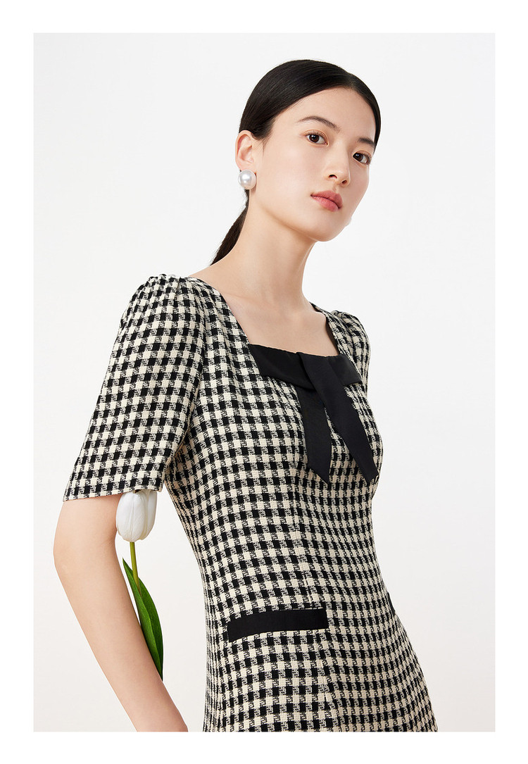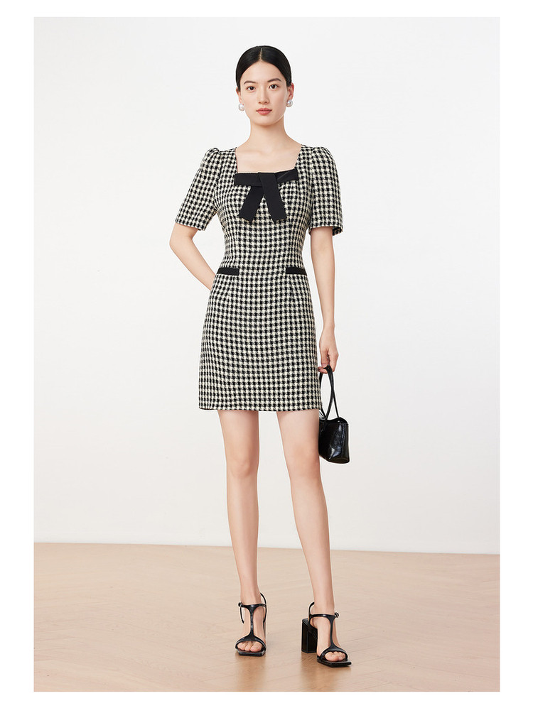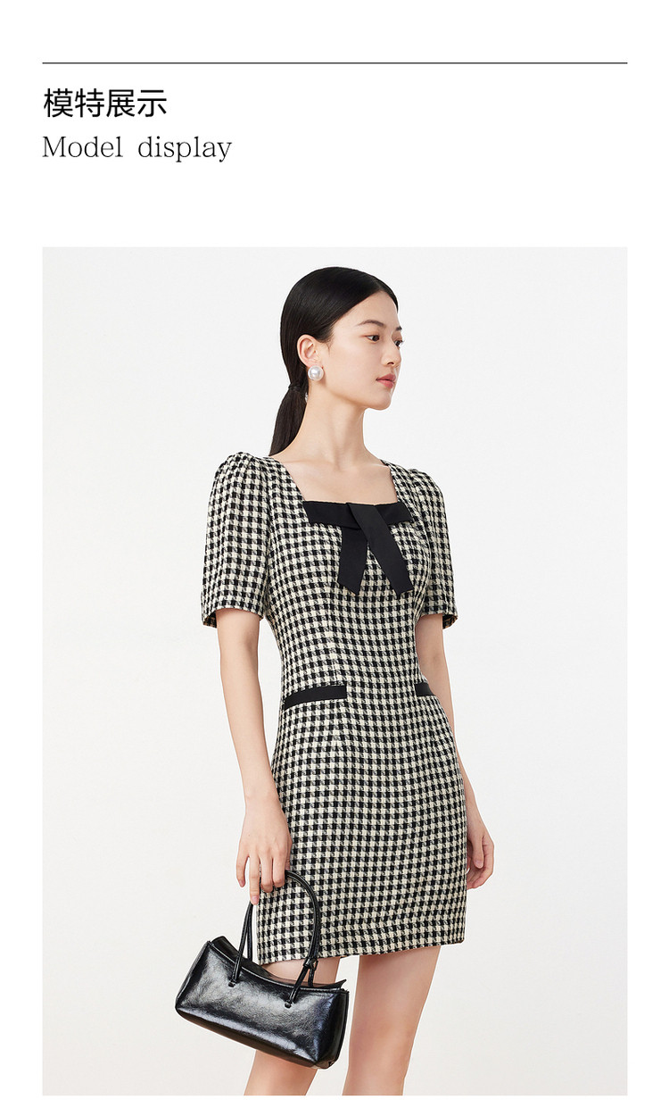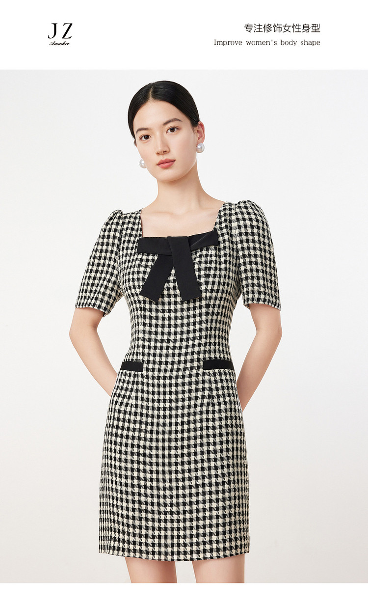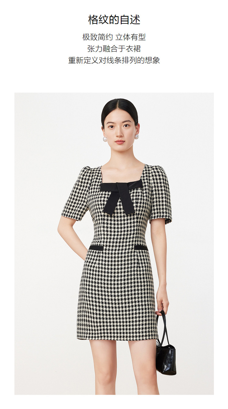 商品名称:玖姿旗下安娜蔻系列洋气小香风方领蝴蝶结肌理格纹连衣裙夏季 069260