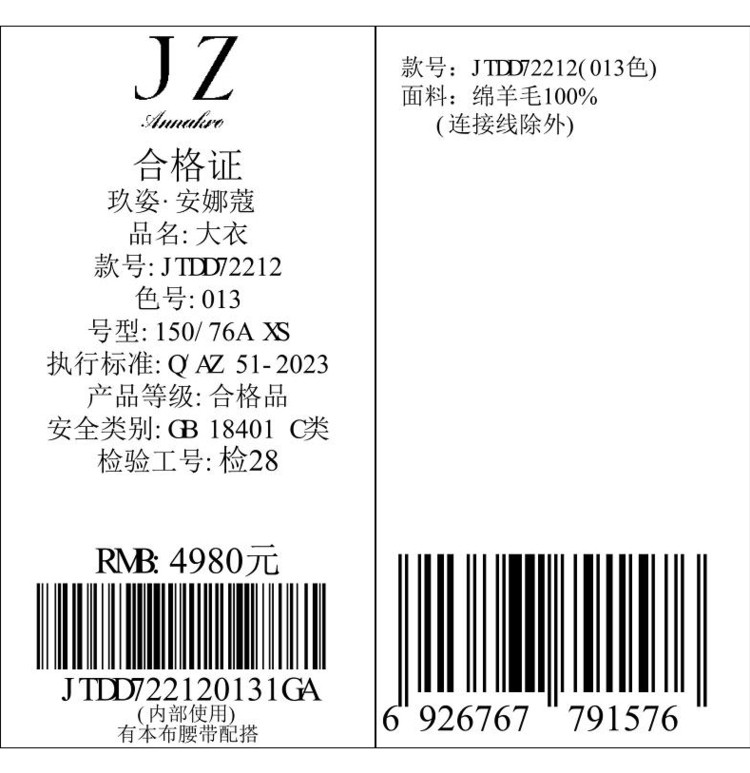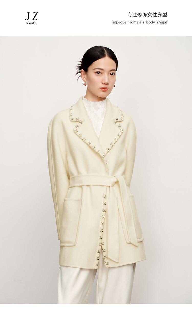 商品名称:玖姿旗下安娜蔻系列优雅通勤双面呢中长羊毛大衣女冬季 694540
