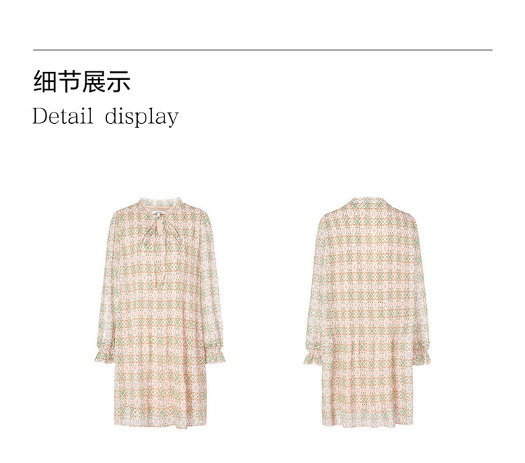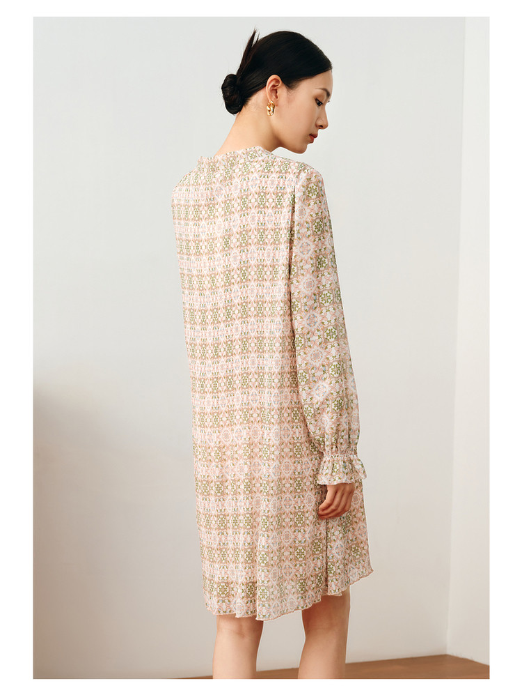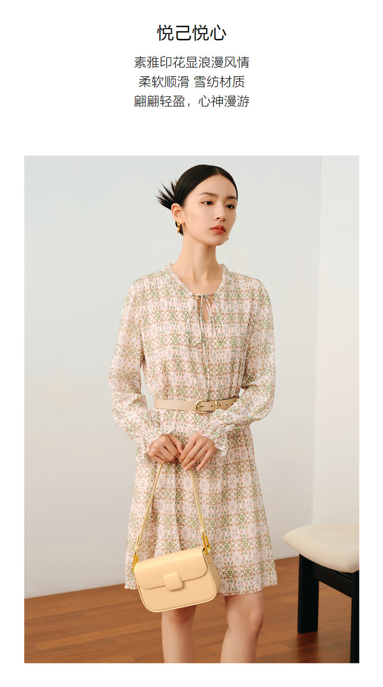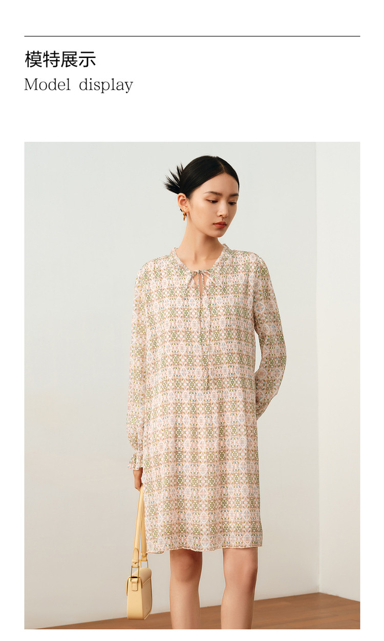 商品名称:玖姿旗下安娜蔻系列休闲压褶直筒雪纺印花连衣裙女秋季 051468