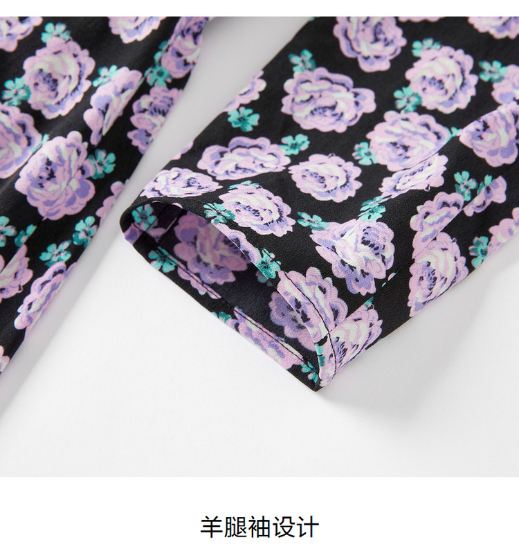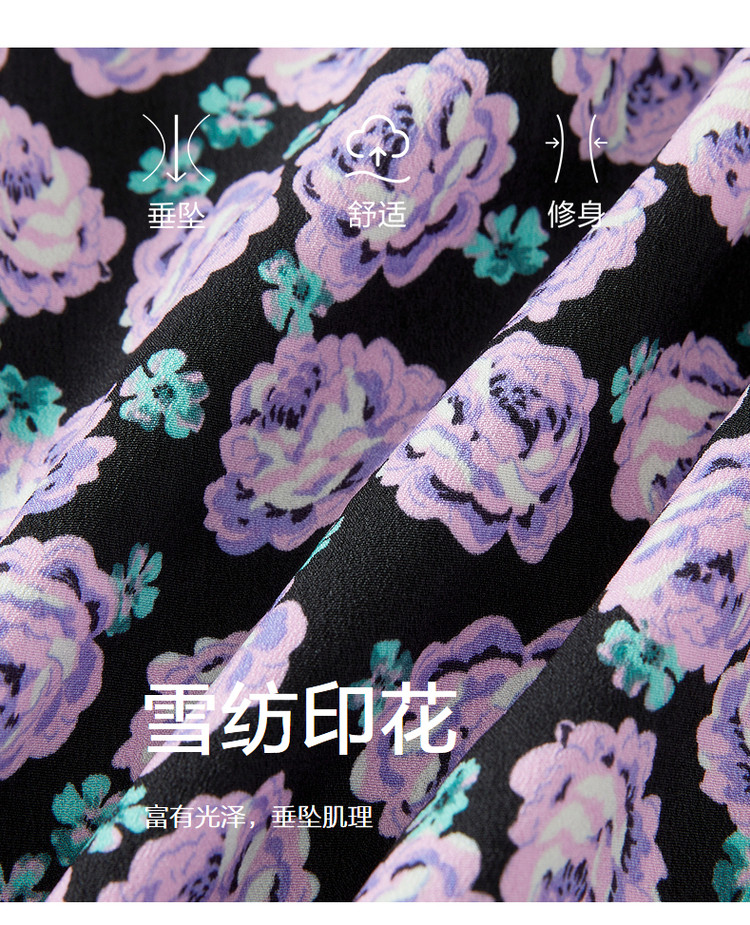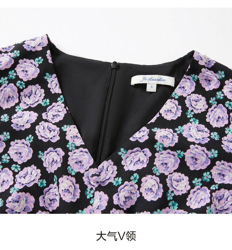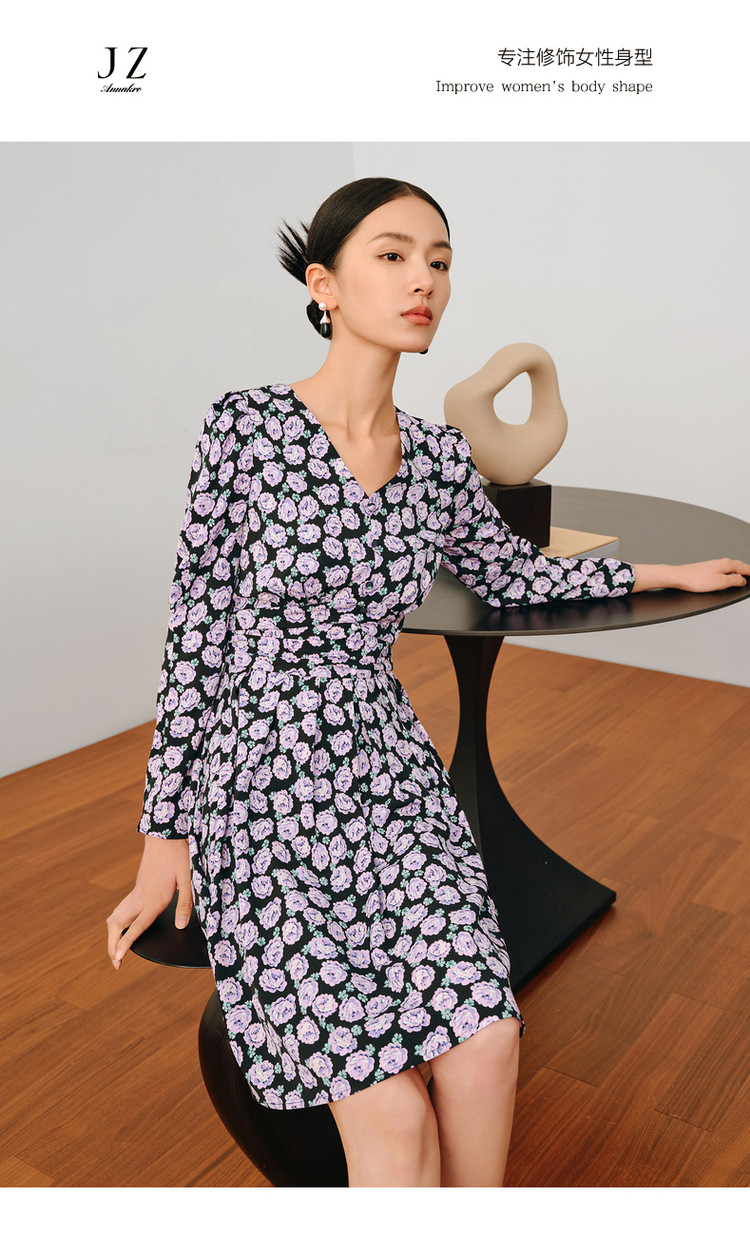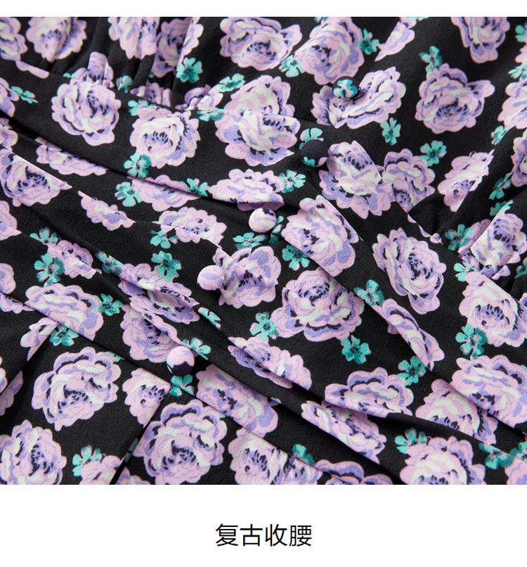 商品名称:玖姿旗下安娜蔻系列复古V领雪纺印花收腰连衣裙女秋季 730188