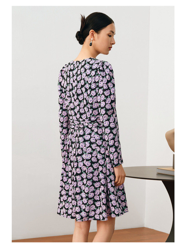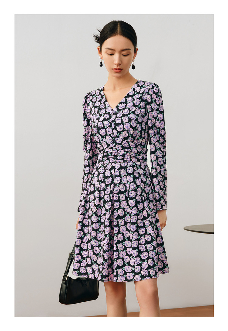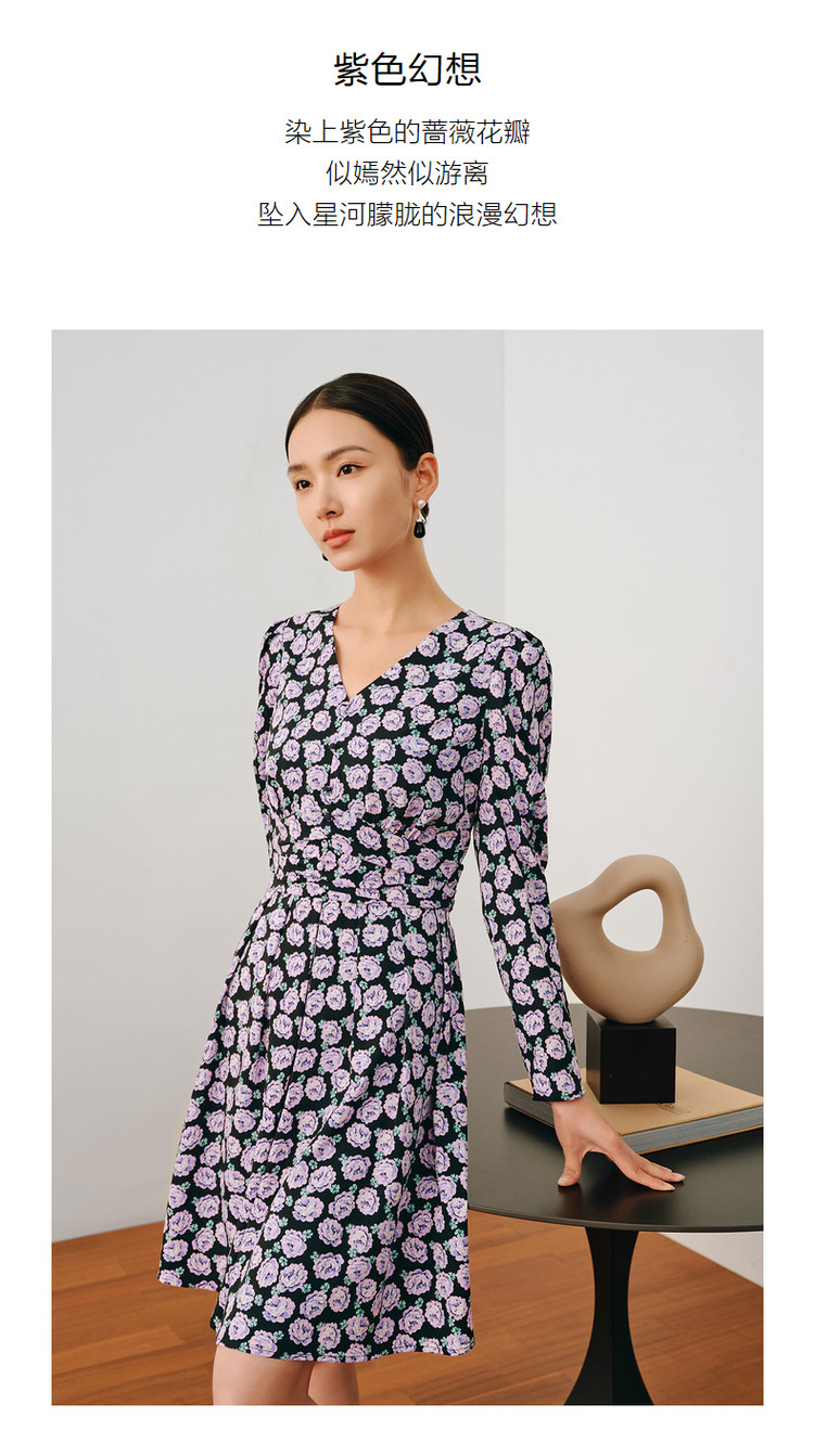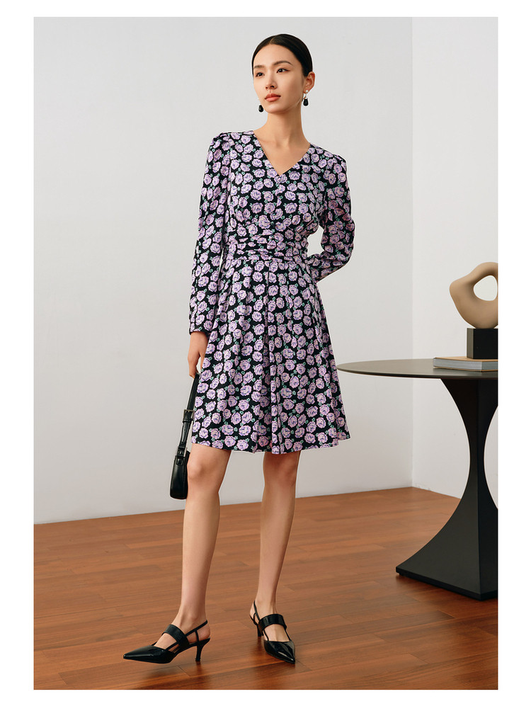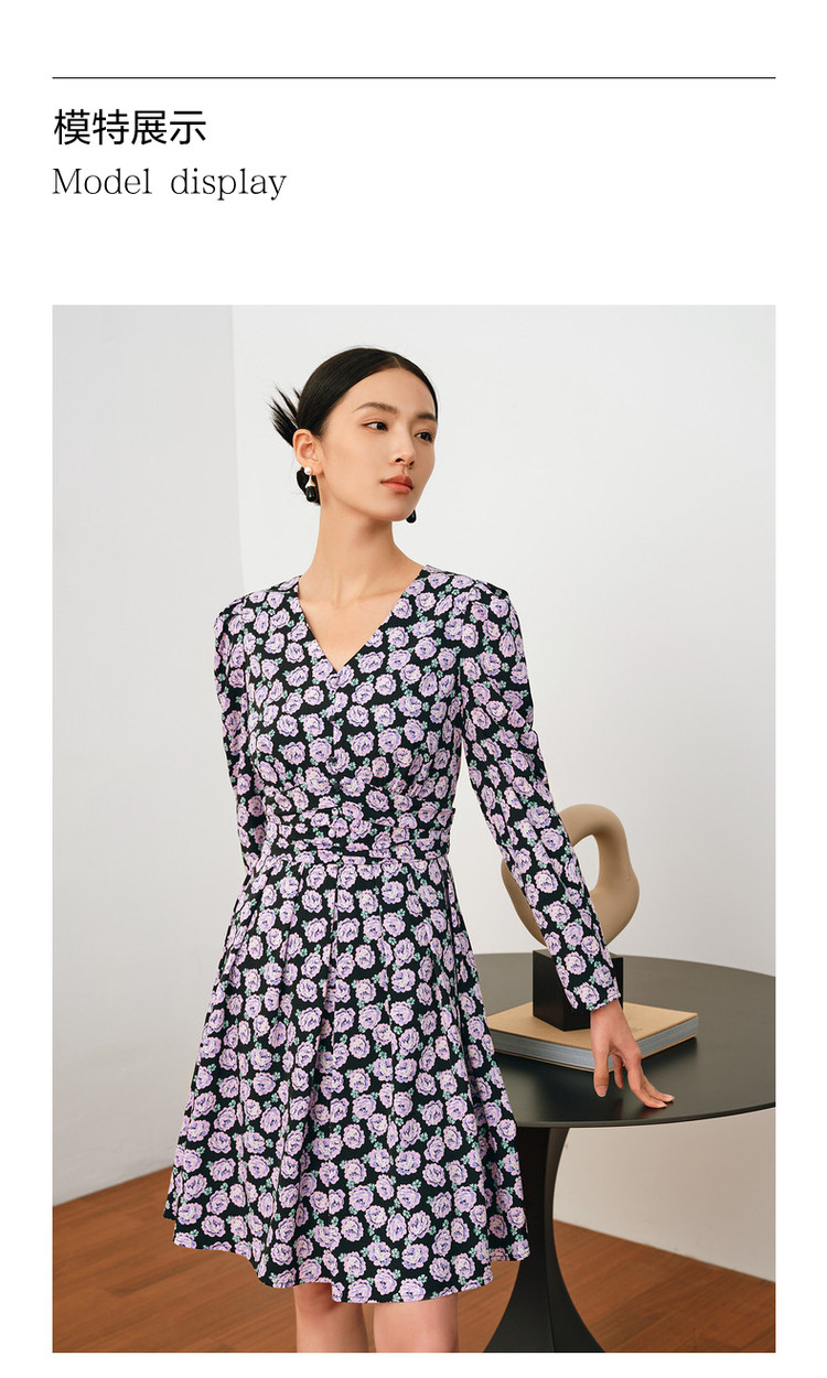 商品名称:玖姿旗下安娜蔻系列复古V领雪纺印花收腰连衣裙女秋季 730188
