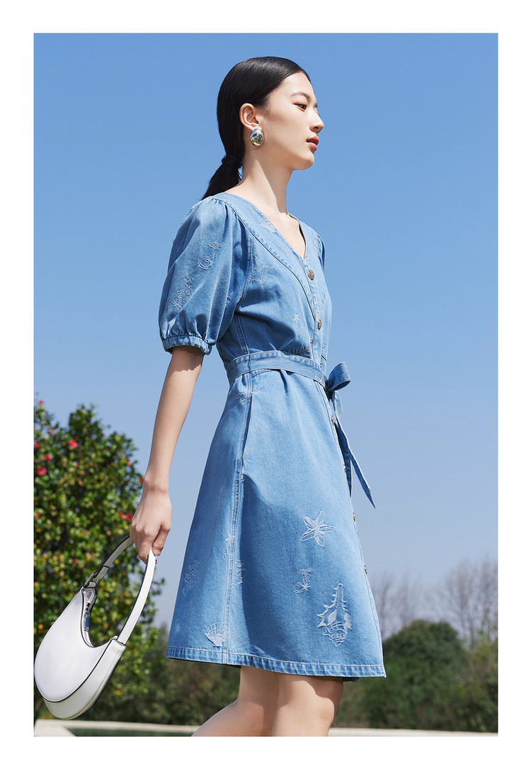 玖姿旗下安娜蔻系列中长连衣裙女装夏季V领含莱赛尔提花裙子 144972