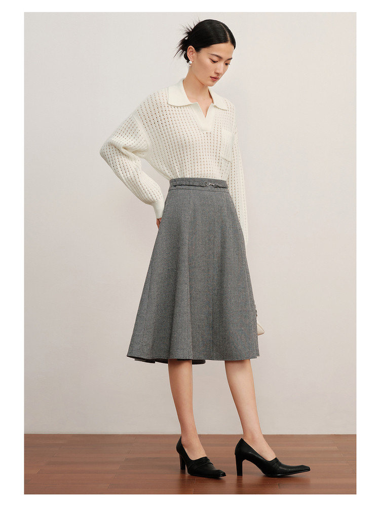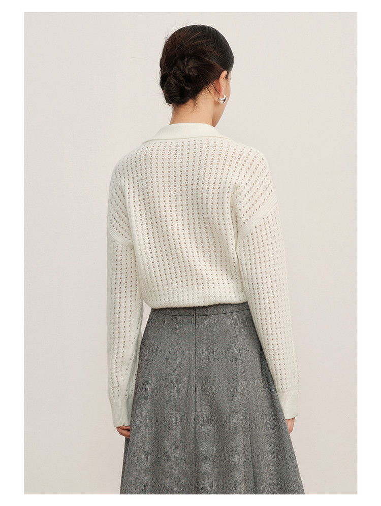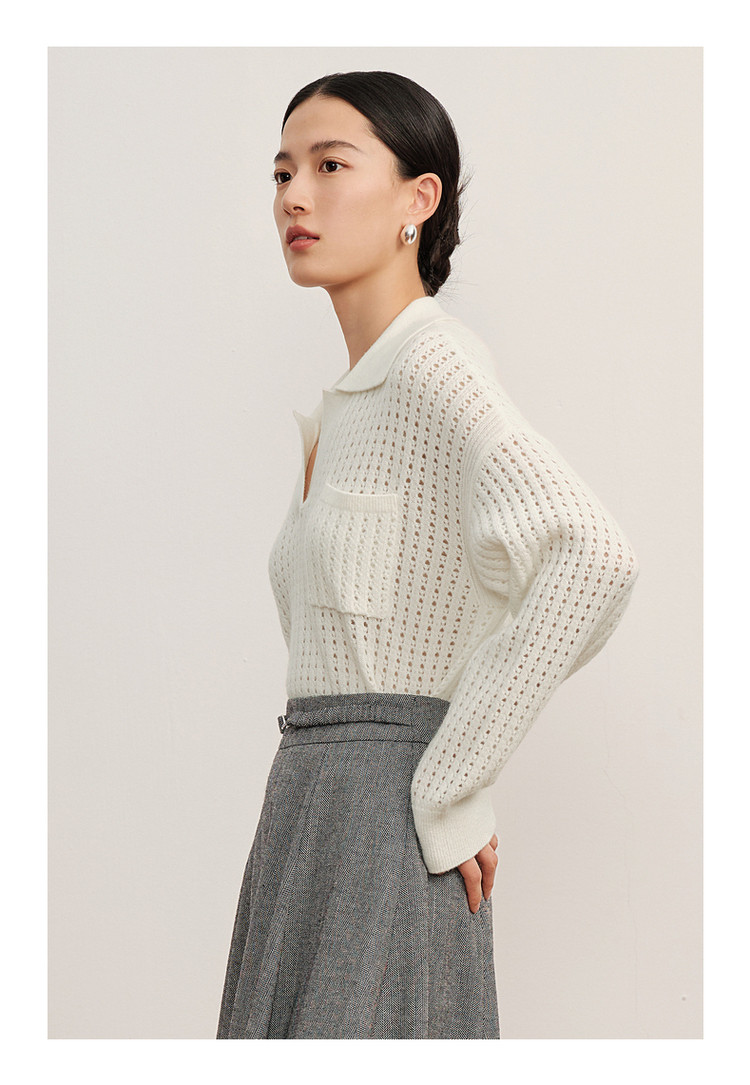 玖姿旗下安娜蔻系列翻领镂空羊毛针织衫女冬季 300492