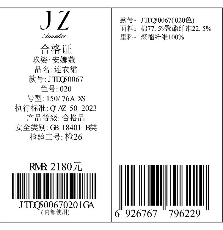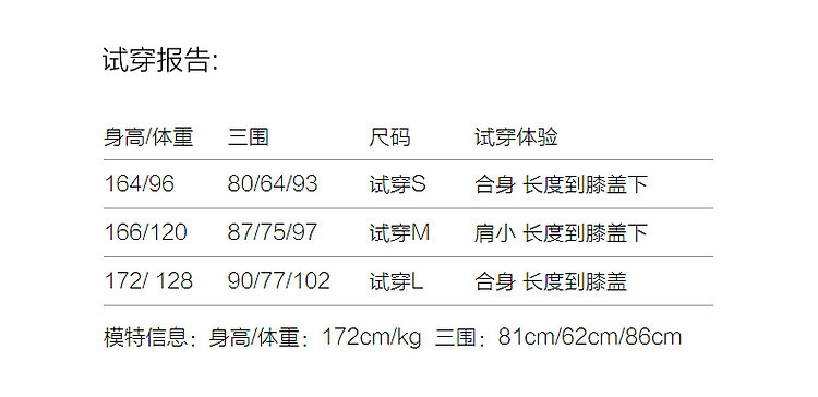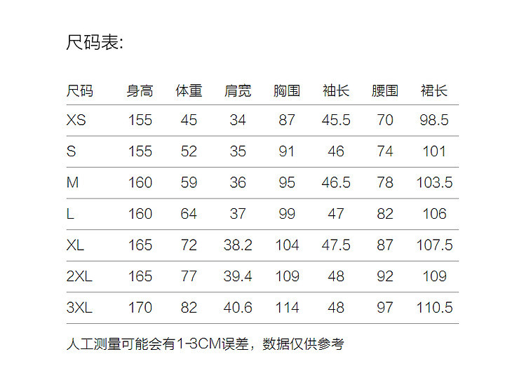 | 尺码 | 裙长(cm) | 肩宽(cm) | 腰围(cm) | 袖长(cm) | 胸围(cm) | 号型 |