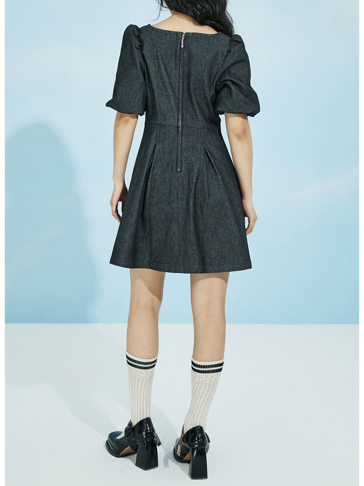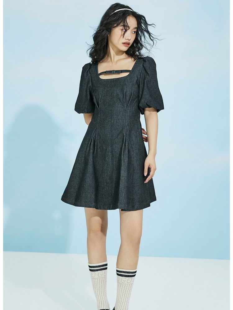 【福利款】夏季镂空捏褶泡泡袖牛仔法式连衣裙女 577626