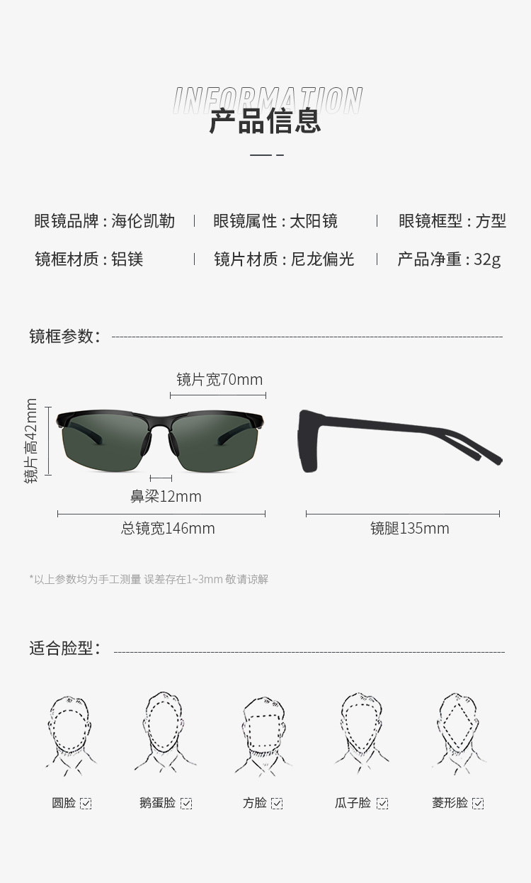 镜面宽度:146mm;镜片高度:42mm;鼻距:12mm