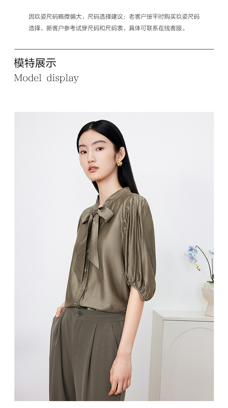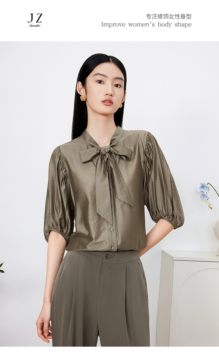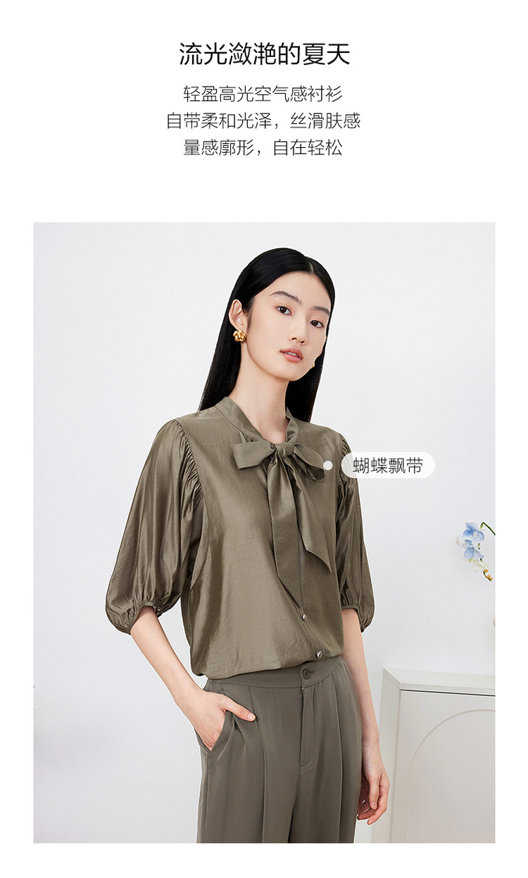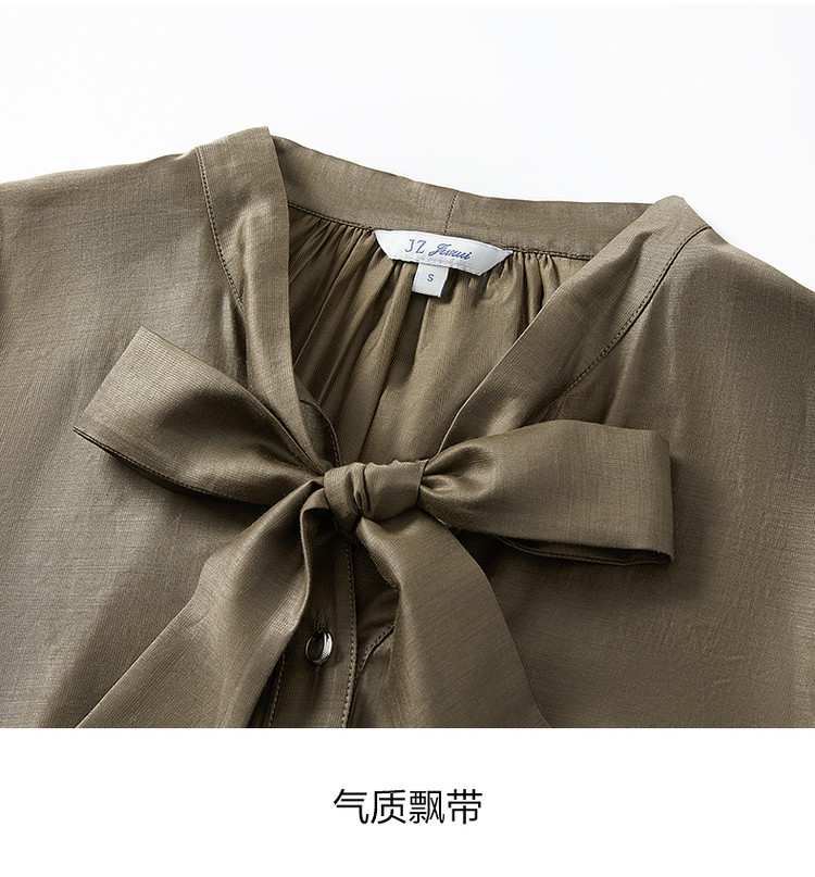 商品名称:玖姿旗下安娜蔻系列轻盈感飘带衬衫女装夏季宽松纯色单上衣 672460