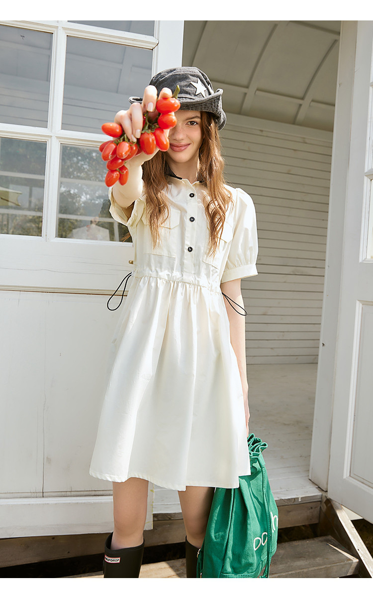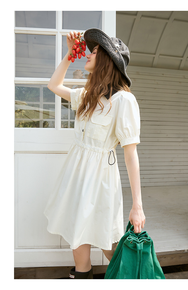 夏季学院风Polo领收腰显瘦纯色简约甜美风连衣裙 650205
