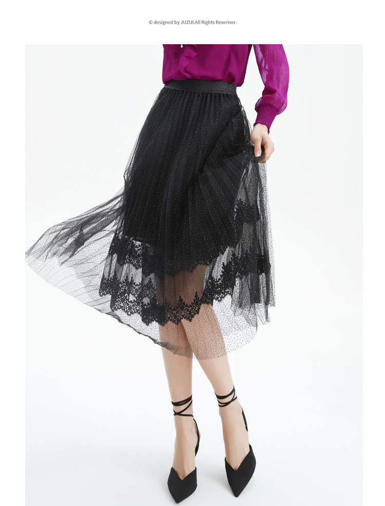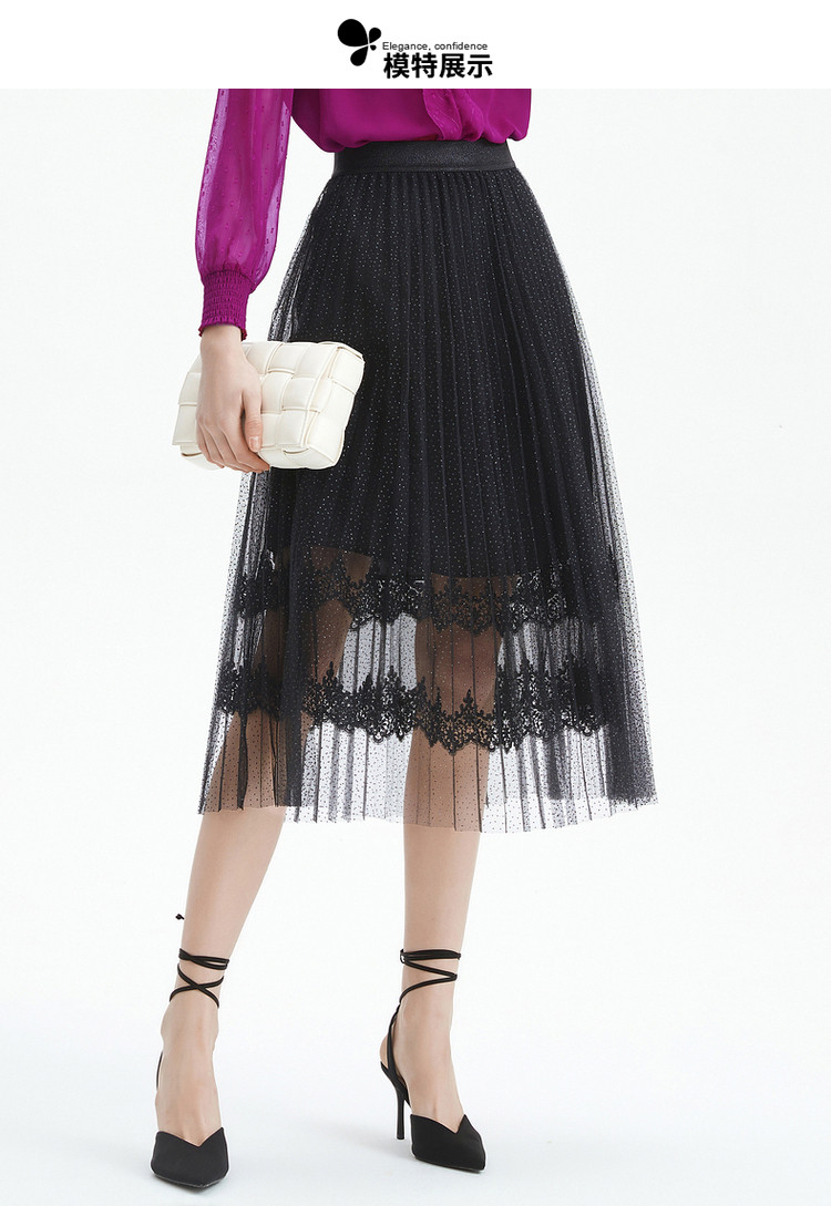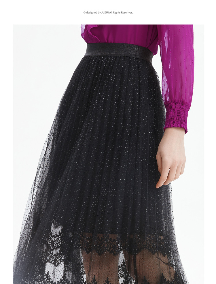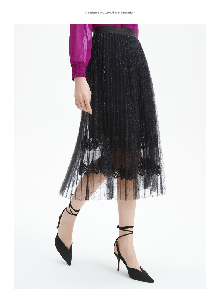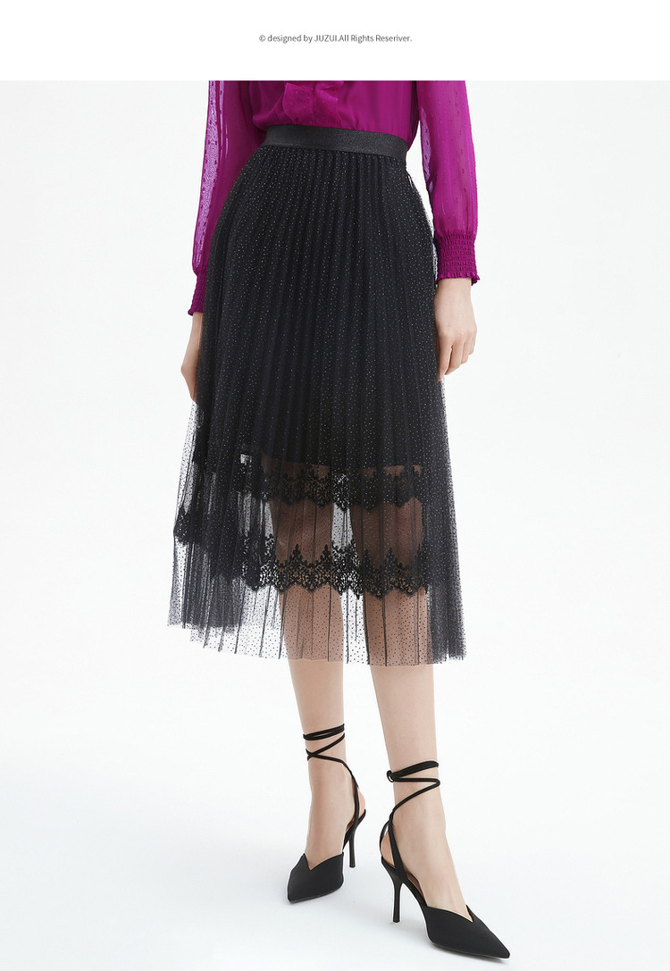 商品名称:玖姿旗下安娜蔻系列时尚浪漫网纱蕾丝百褶裙女中长半身裙 382220