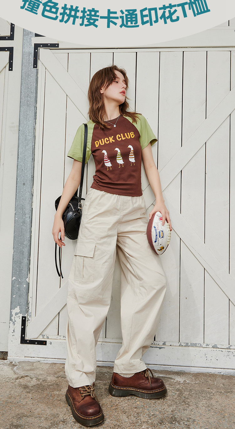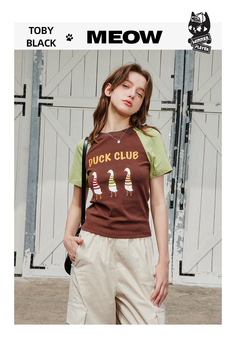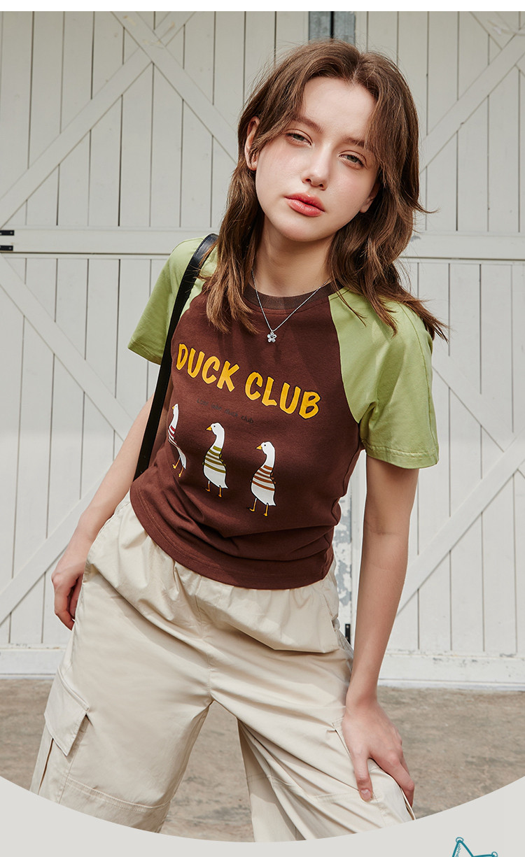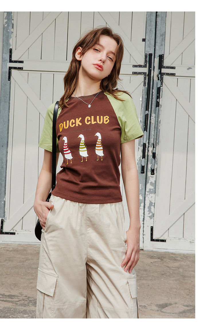 商品名称:夏季撞色拼接插肩袖短袖卡通印花休闲百搭女式T恤 425437
