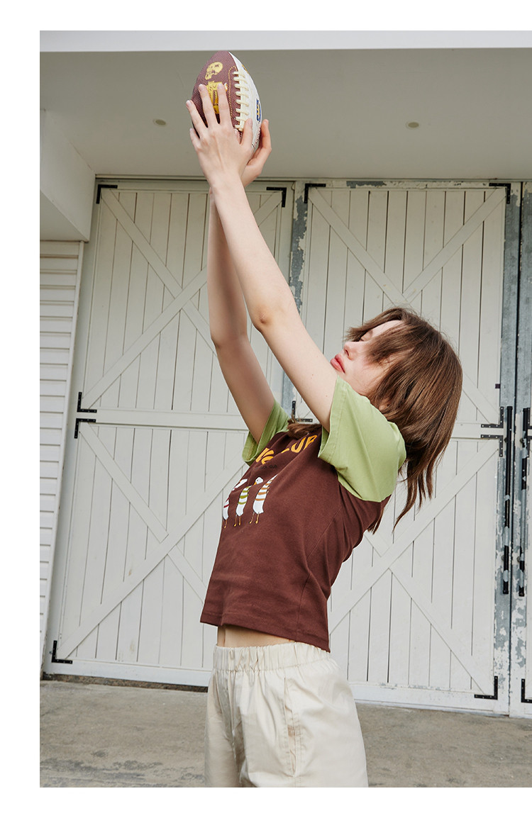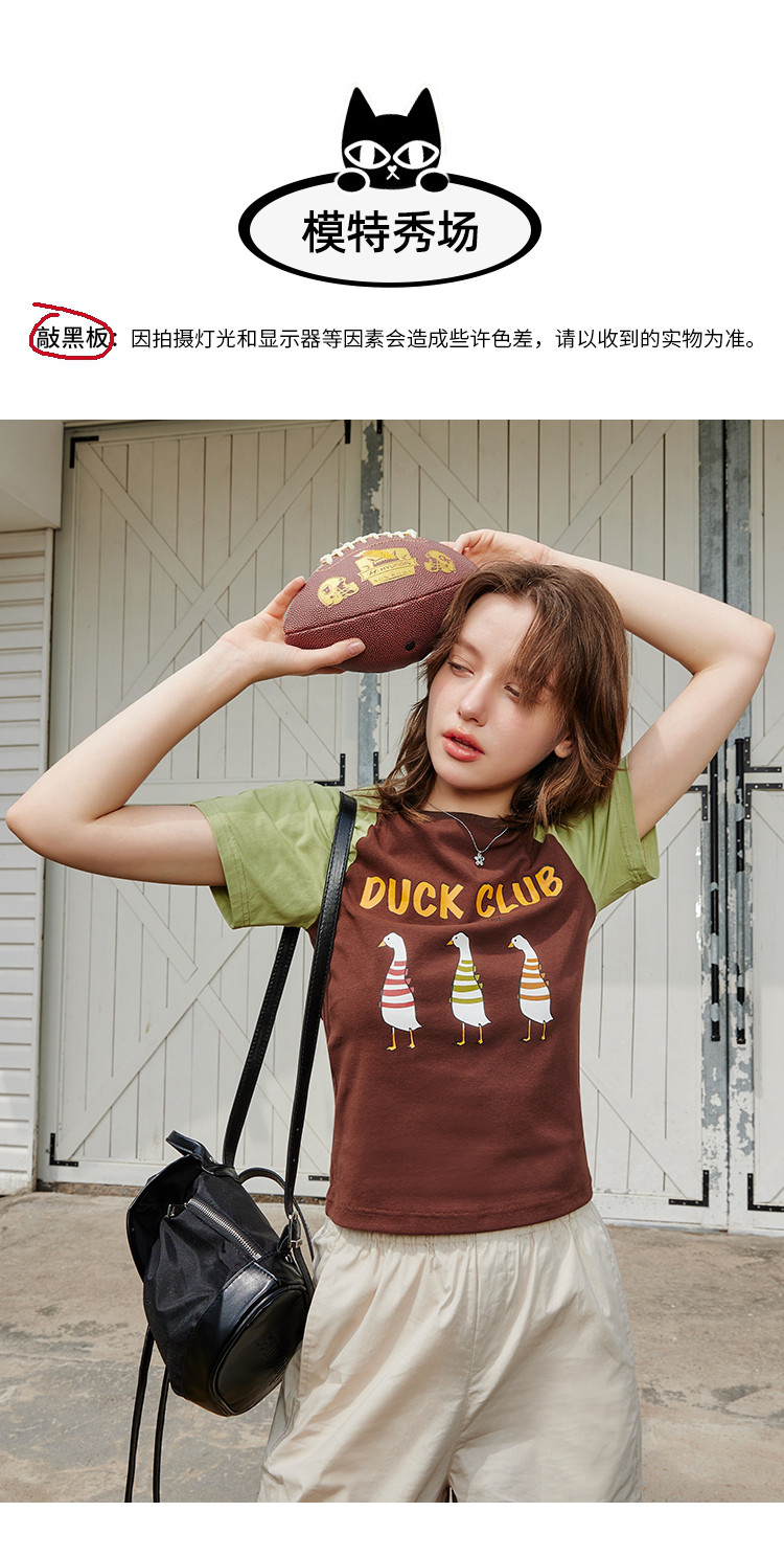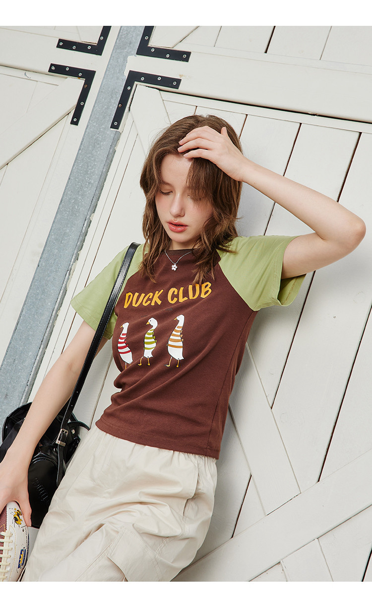 夏季撞色拼接插肩袖短袖卡通印花休闲百搭女式T恤 425437