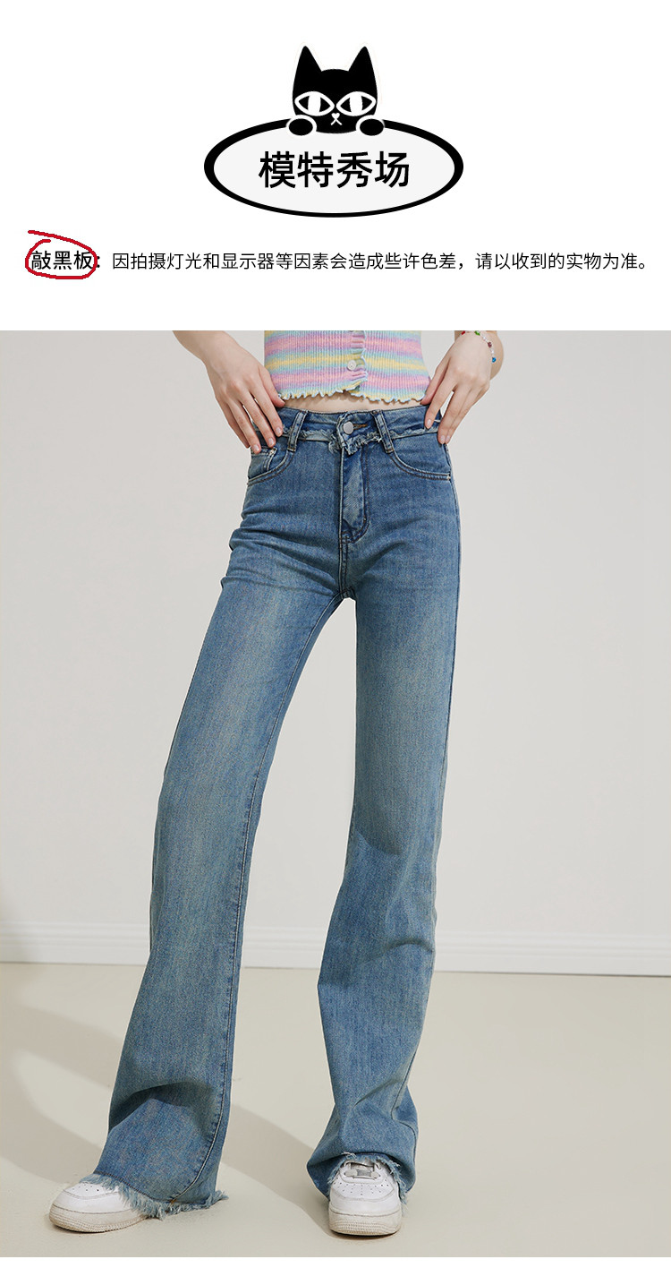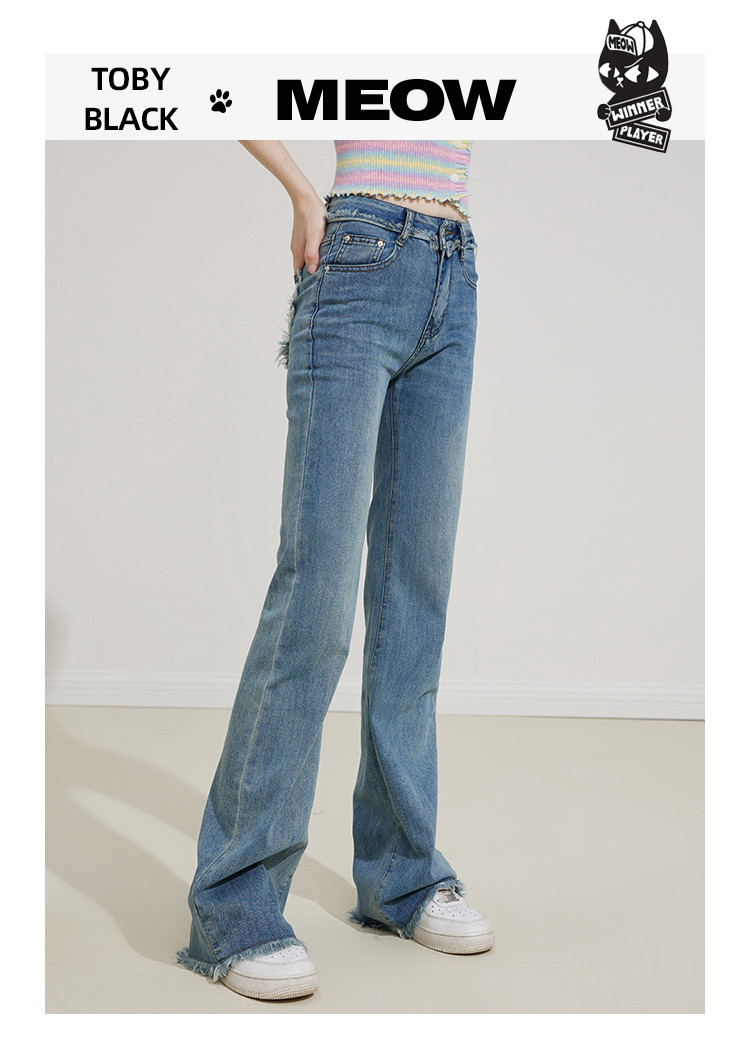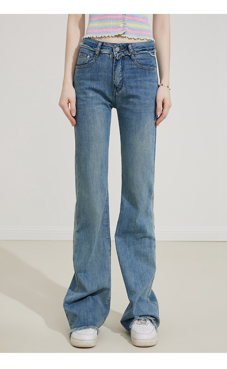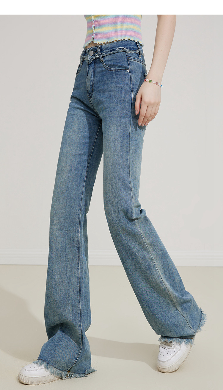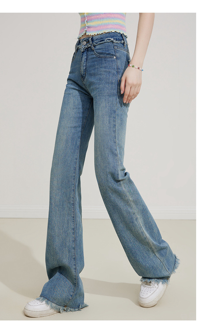 夏季裤脚毛边设计感直筒裤高腰休闲百搭女式牛仔裤 260701