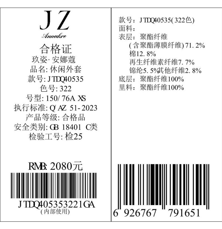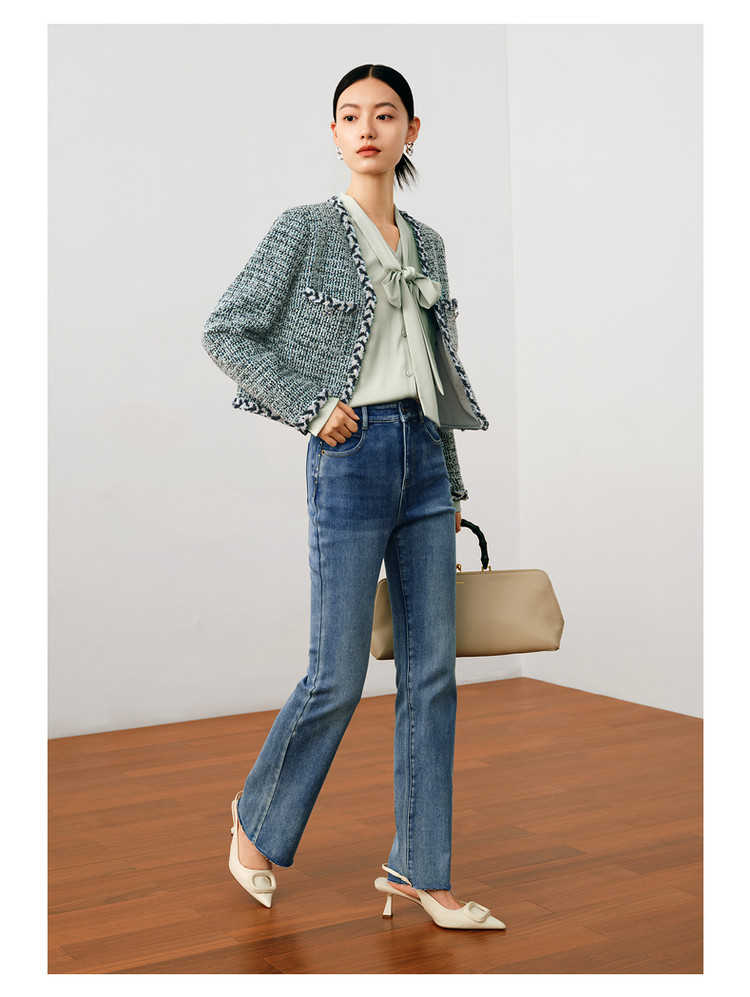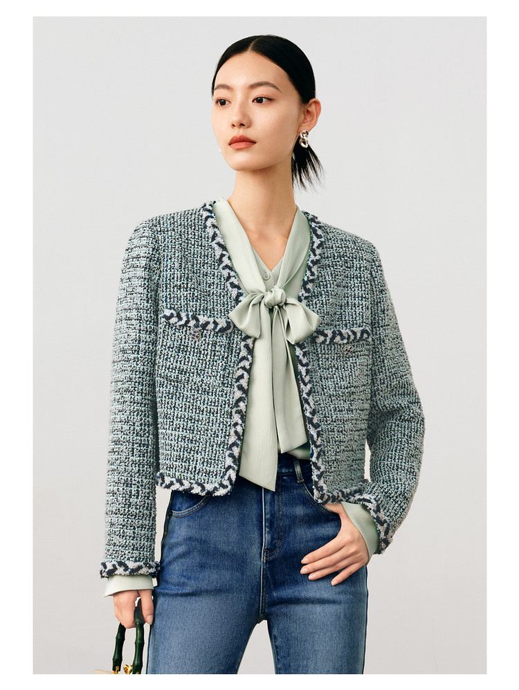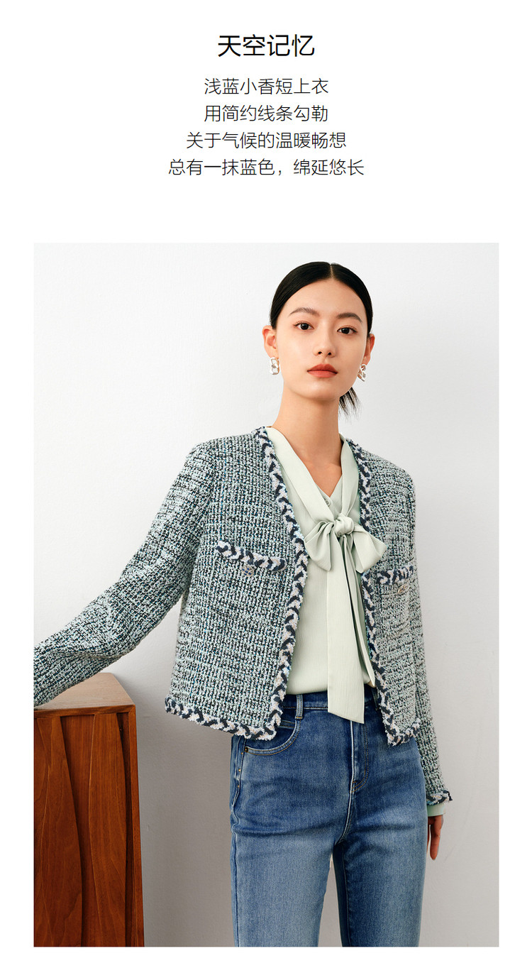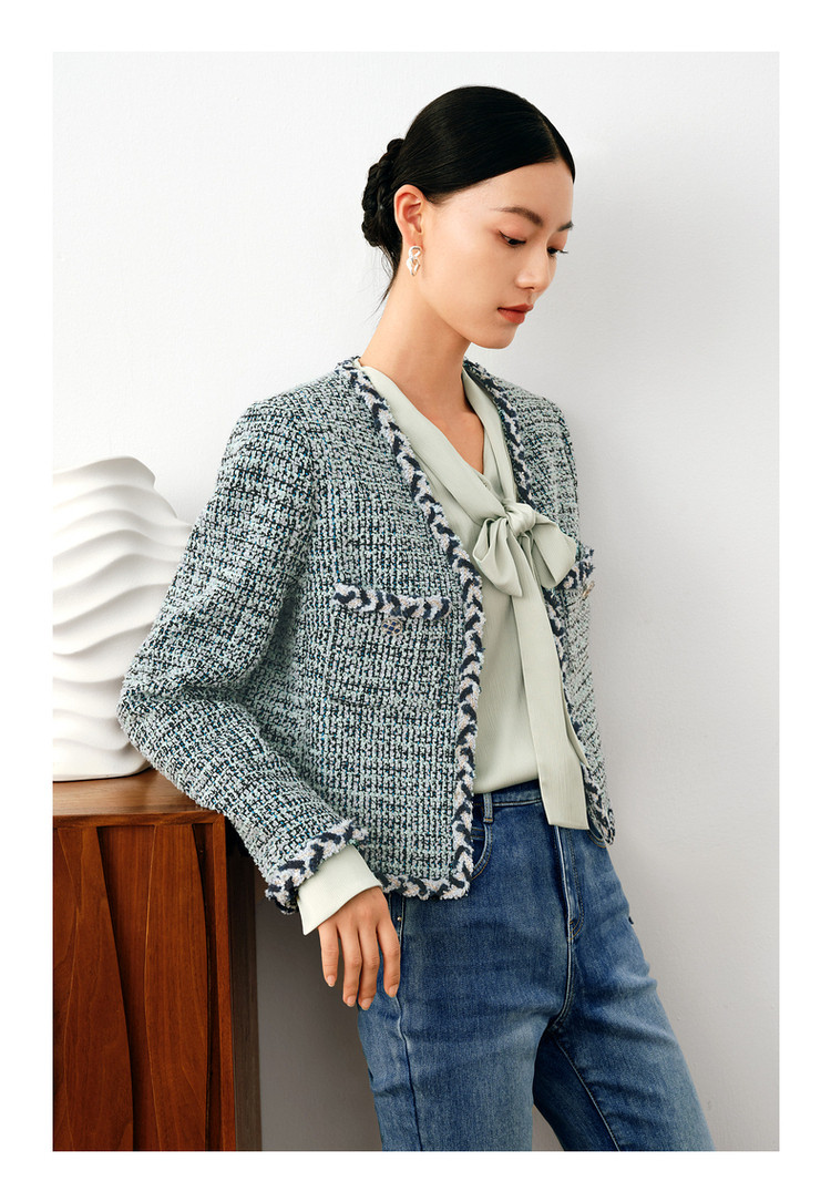 商品名称:玖姿旗下安娜蔻系列法式复古轻熟V领H型小香风长袖外套女秋季 651084