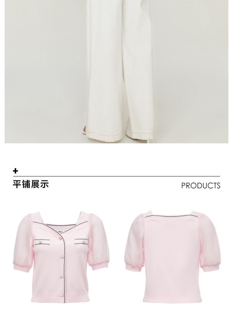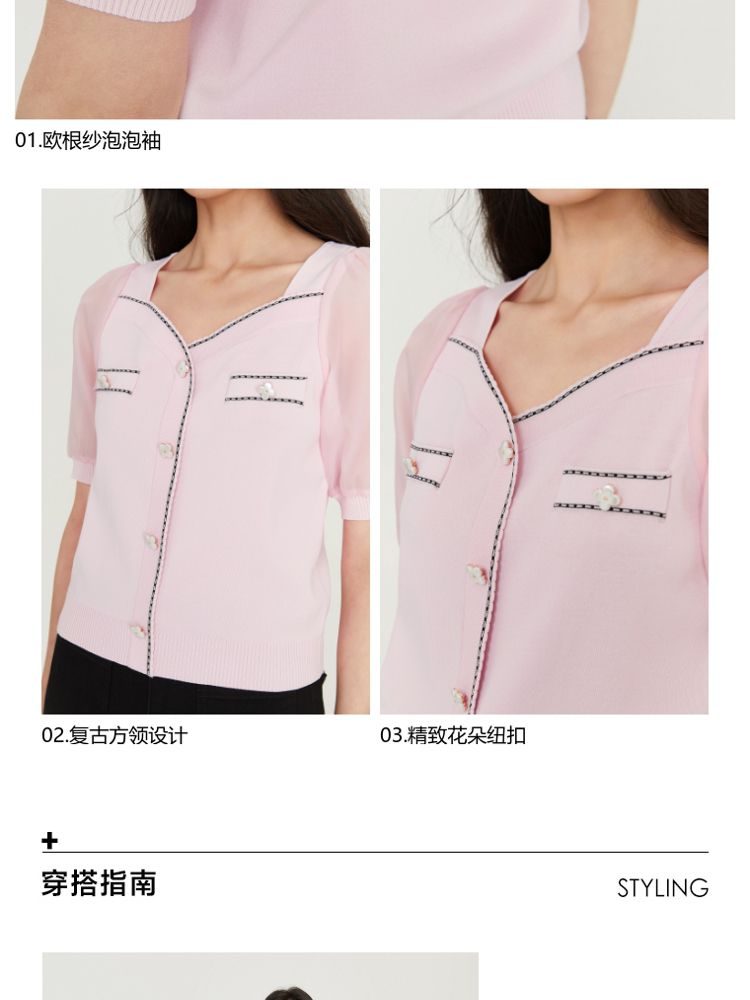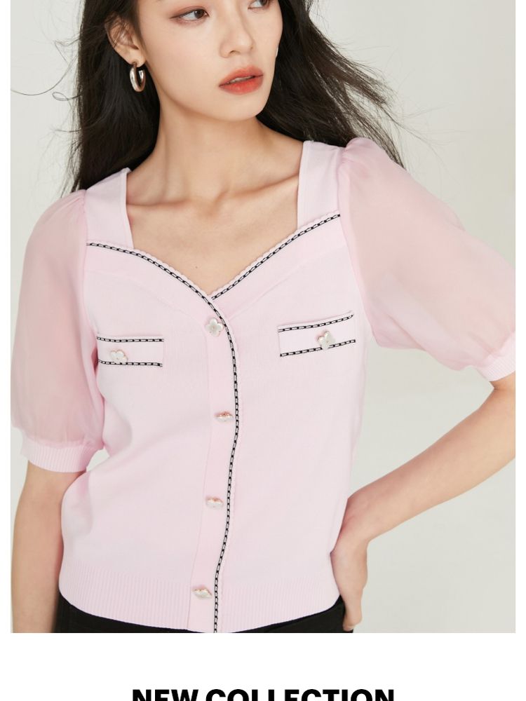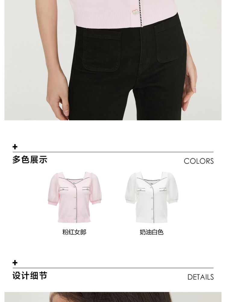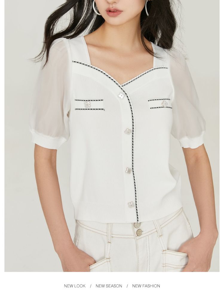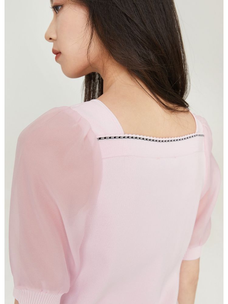 【福利特卖款】夏季休闲方领泡泡袖短袖针织衫女 725338