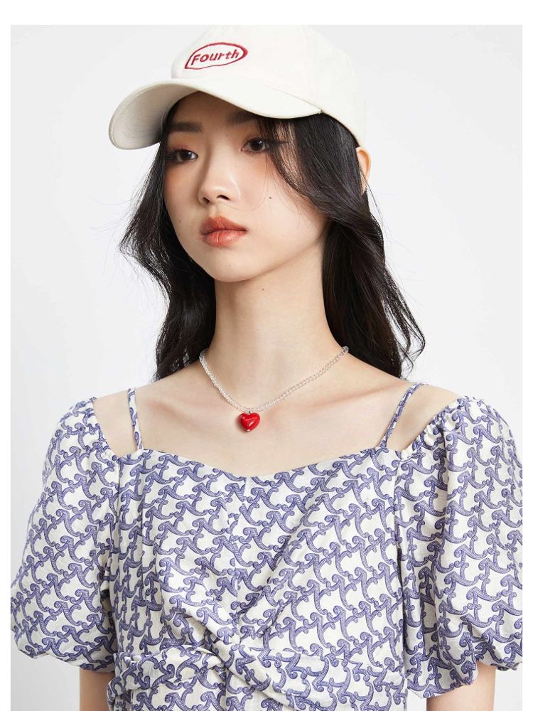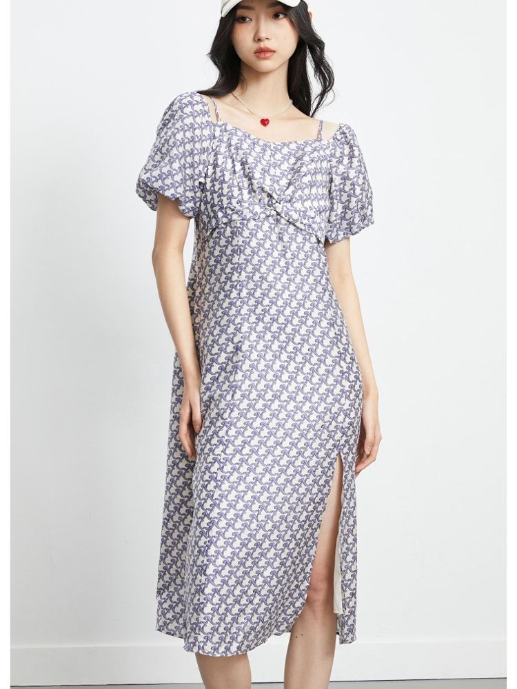 【甜美时尚】夏季泡泡袖开叉中长款连衣裙女 627546
