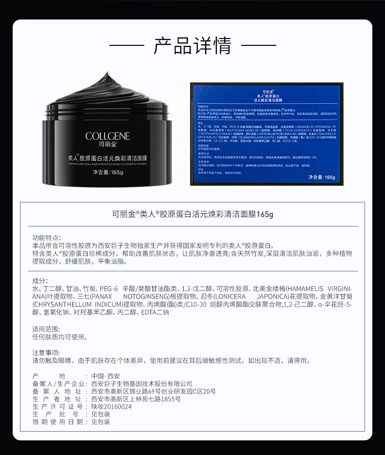 商品名称:可丽金 类人胶原蛋白涂抹式清洁面膜黑膜 165g (新版)