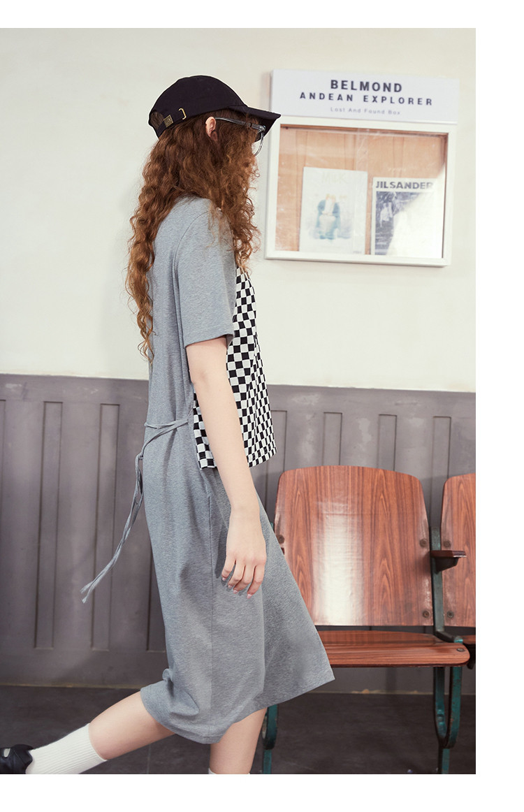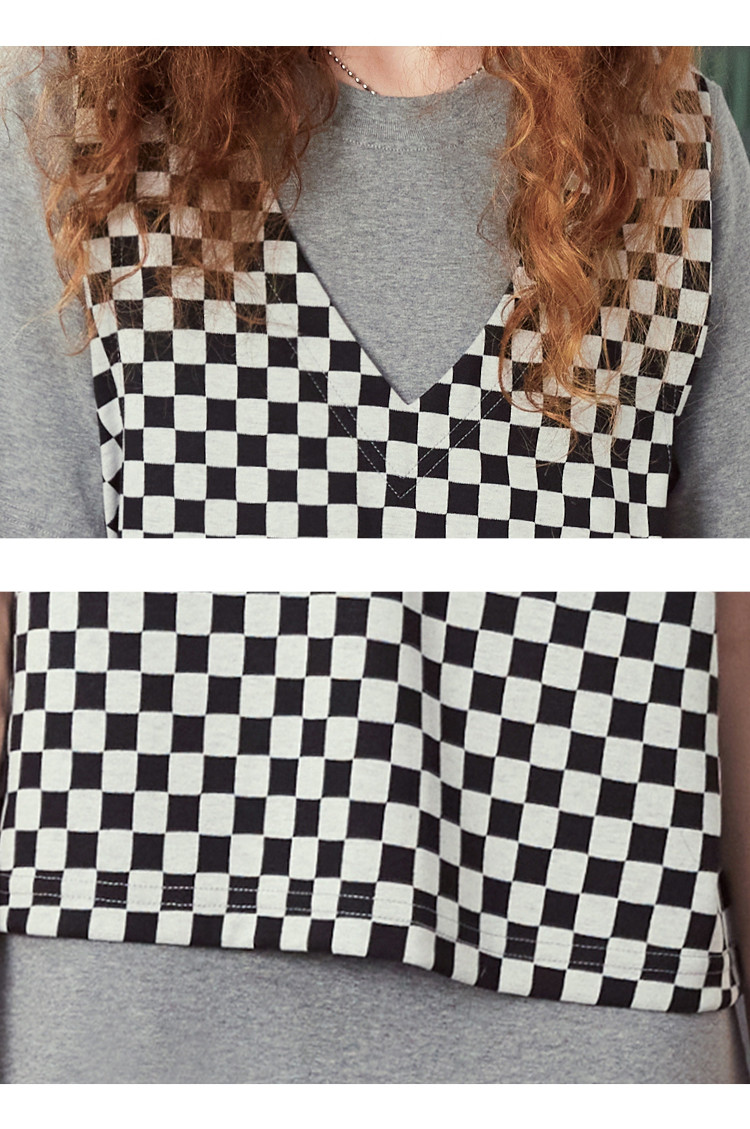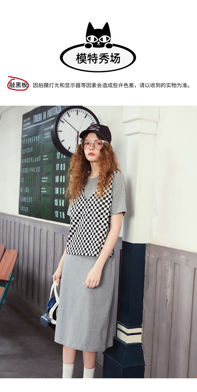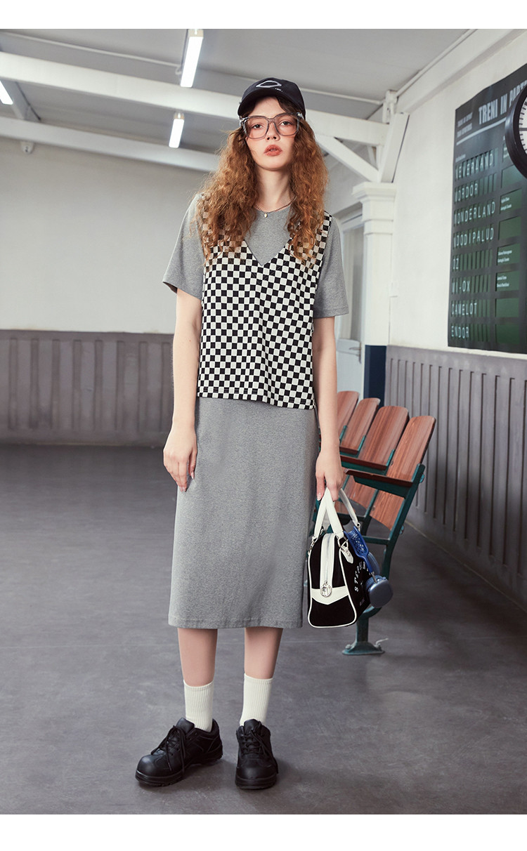 商品名称:夏季黑白格马甲拼接假两件中长款T恤裙休闲连衣裙 042717
