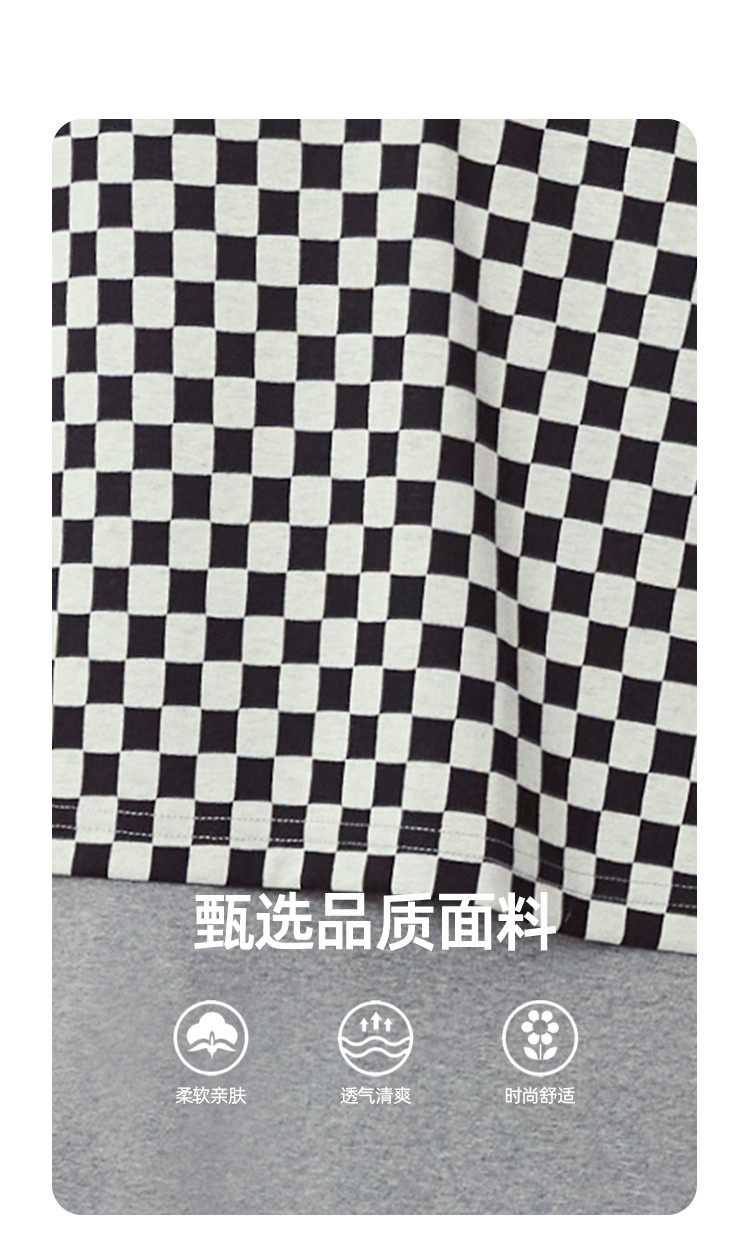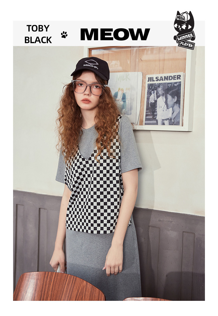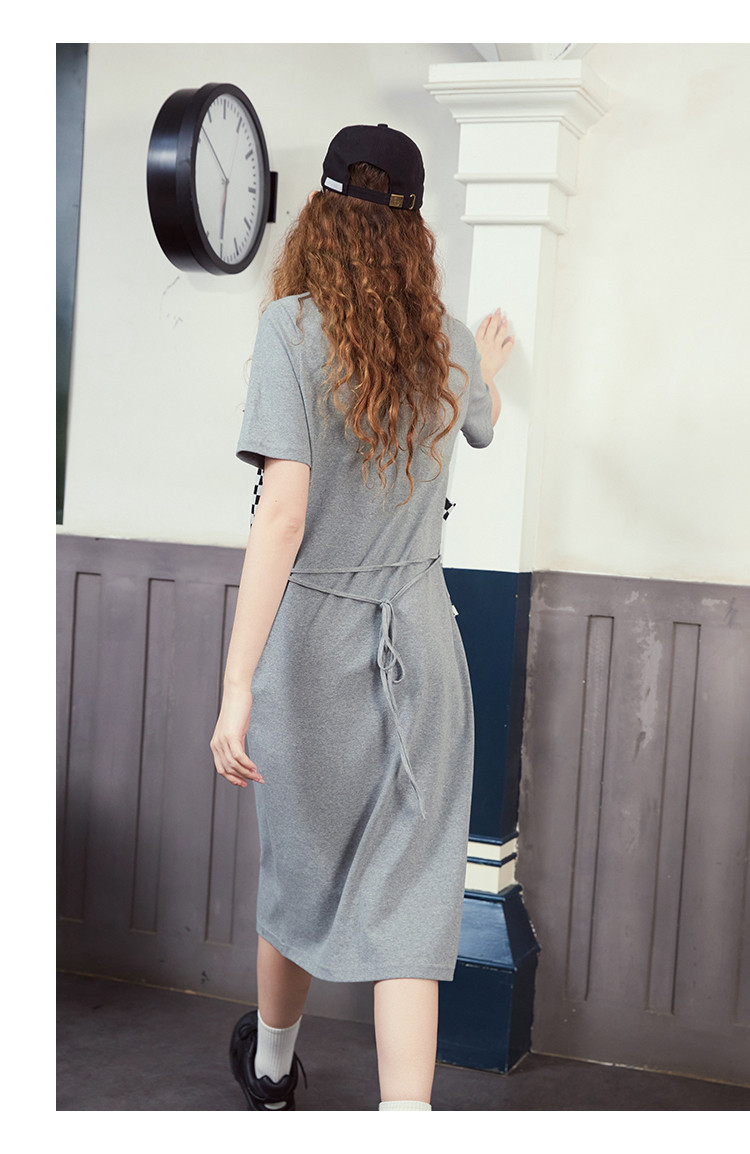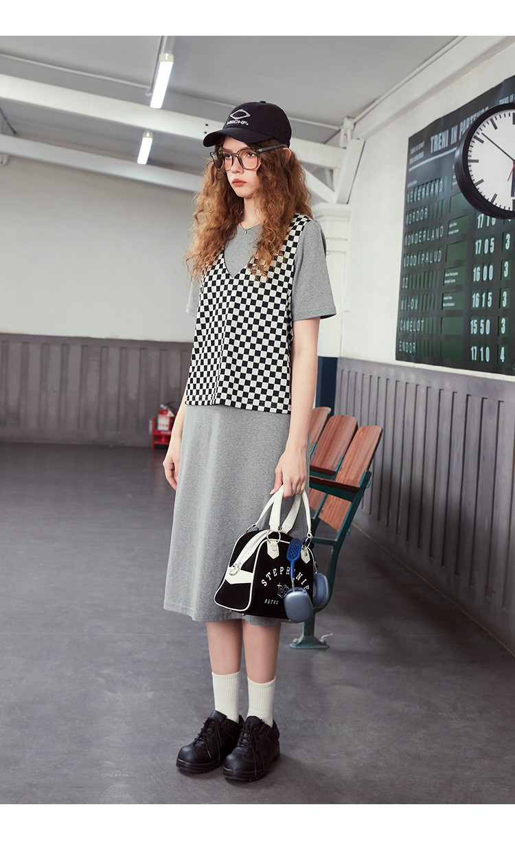 商品名称:夏季黑白格马甲拼接假两件中长款T恤裙休闲连衣裙 042717