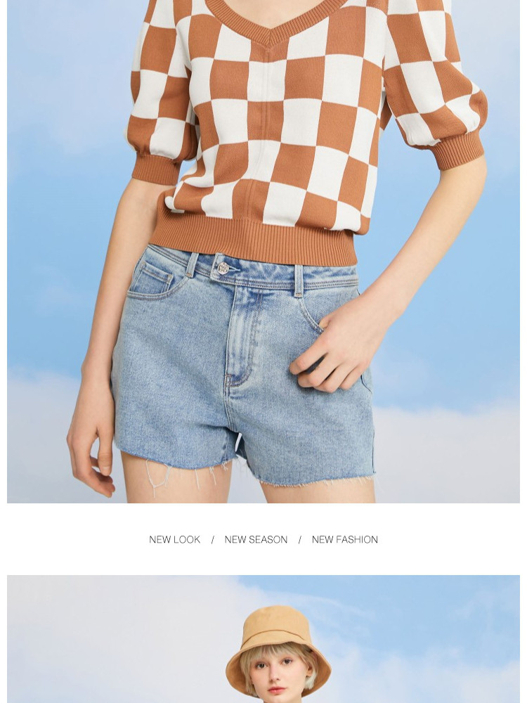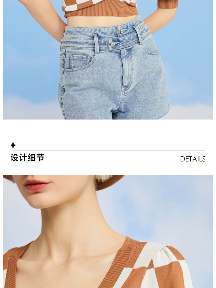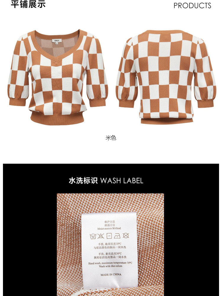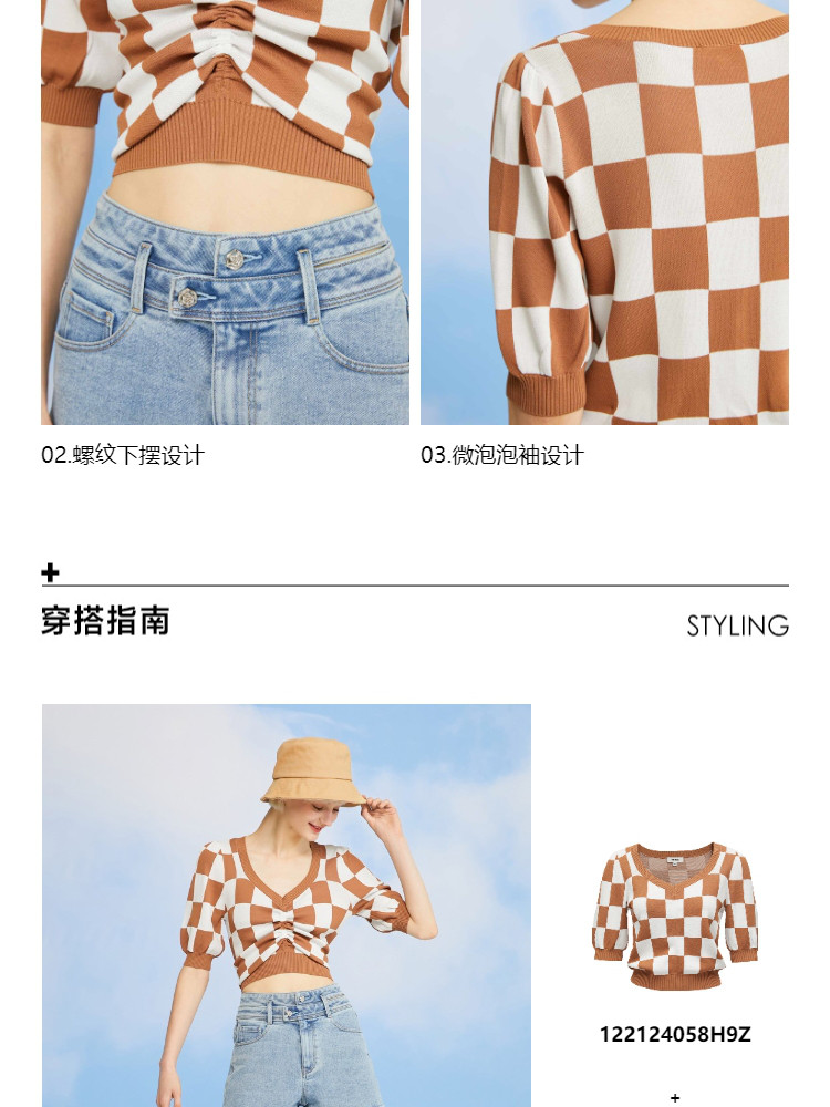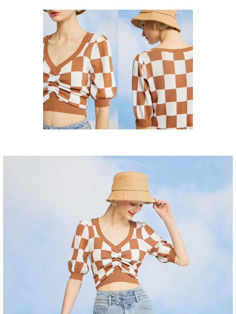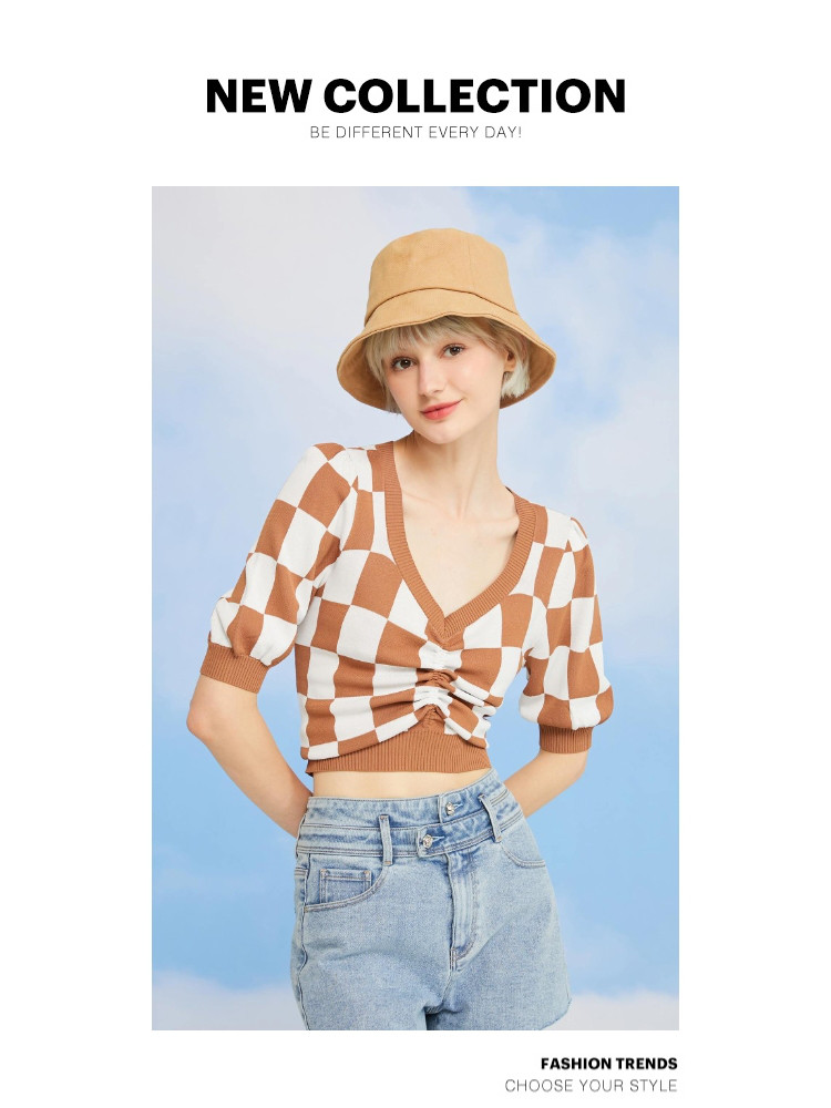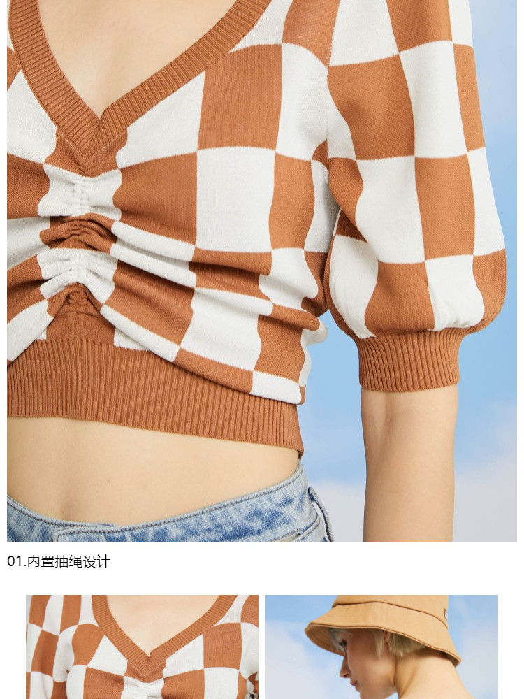 商品名称:【抽绳短款】夏季小心机V领薄款格子针织衫女 959194