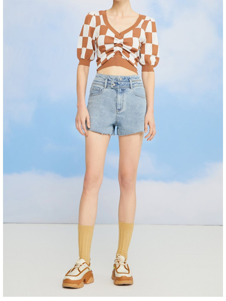 【抽绳短款】夏季小心机V领薄款格子针织衫女 959194