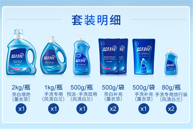 商品名称:蓝月亮 洗衣组合:2kg+1kg+500g+500g袋*3+80g*2