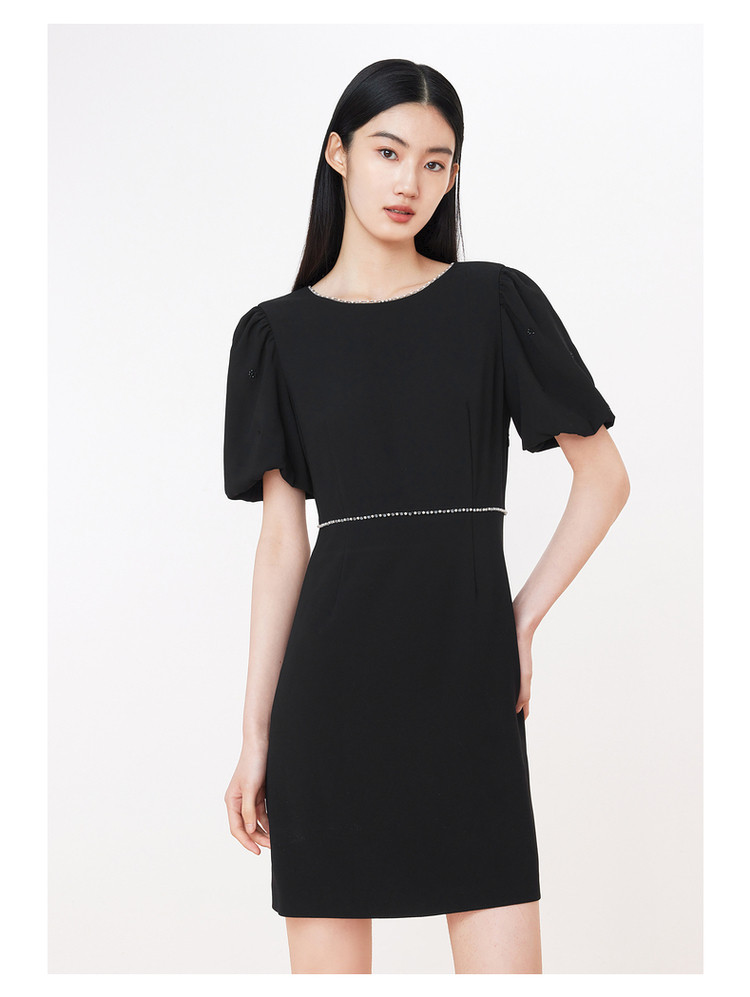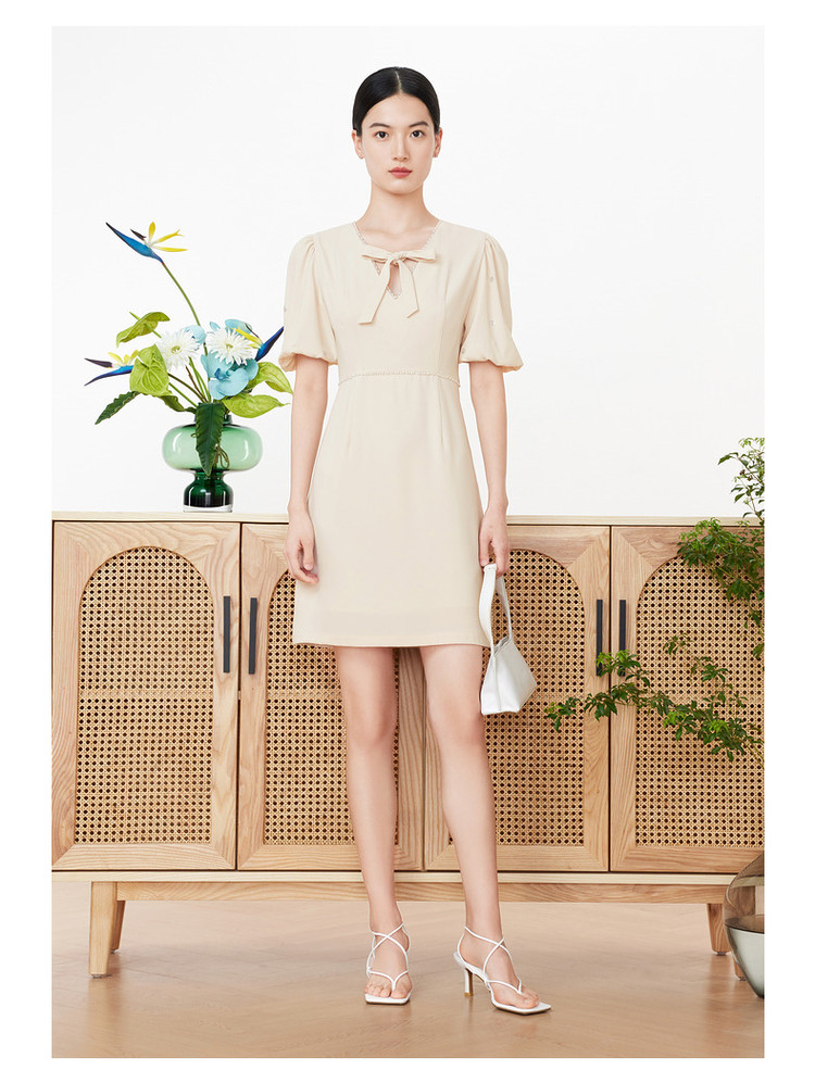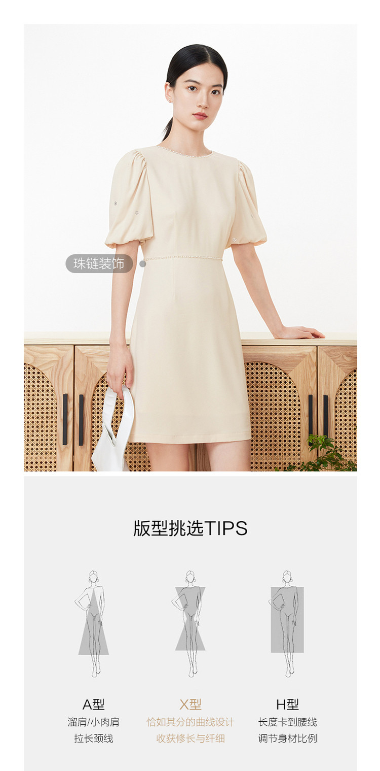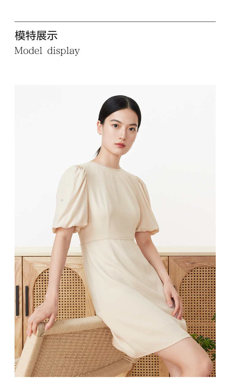 旗下安娜蔻系列洋气通勤风泡泡袖收腰醋酸中长款连衣裙女装夏新 918092