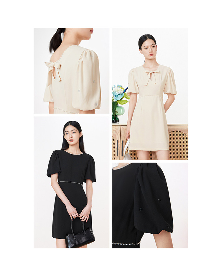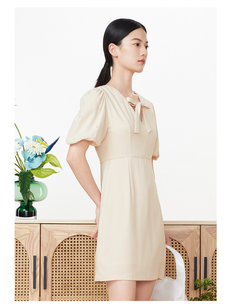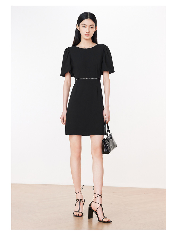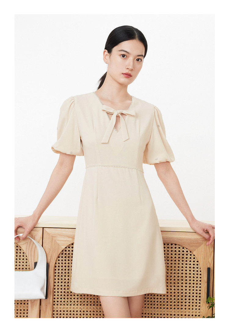 旗下安娜蔻系列洋气通勤风泡泡袖收腰醋酸中长款连衣裙女装夏新 918092