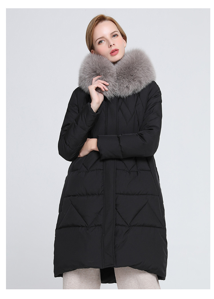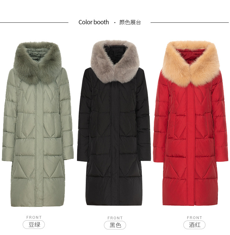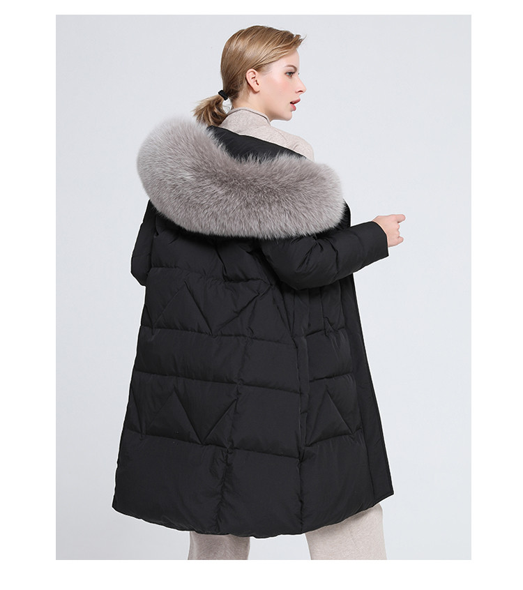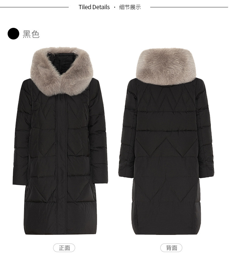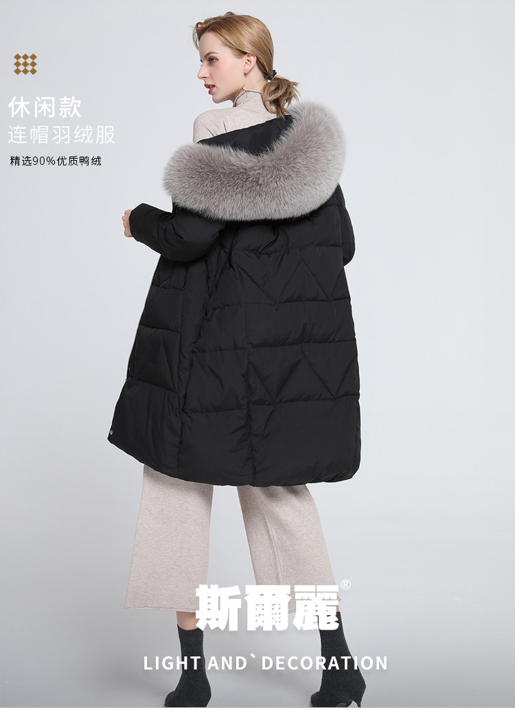 商品名称:超大狐狸毛领连帽冬季厚款收腰遮肉中长款羽绒服女士保暖休闲外套 772767
