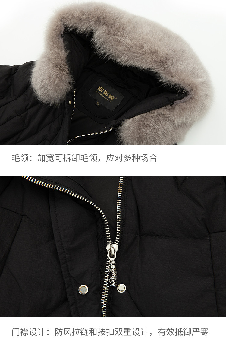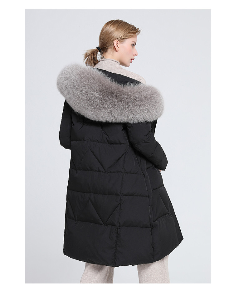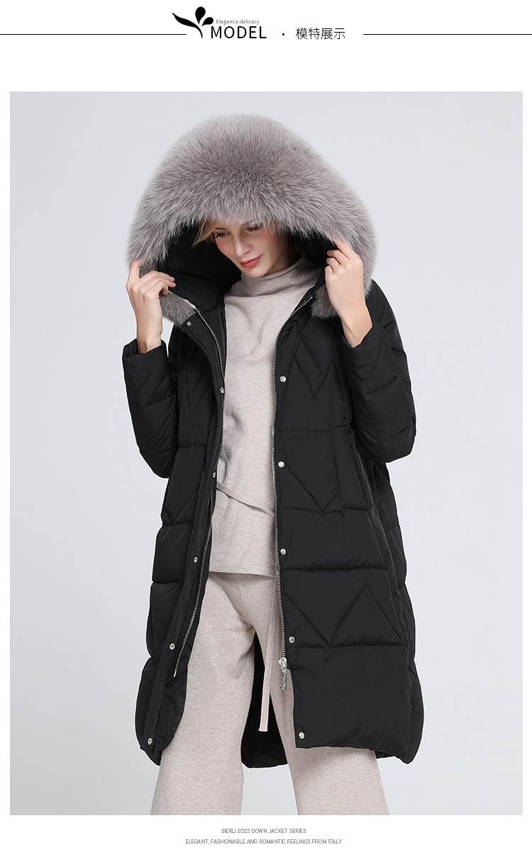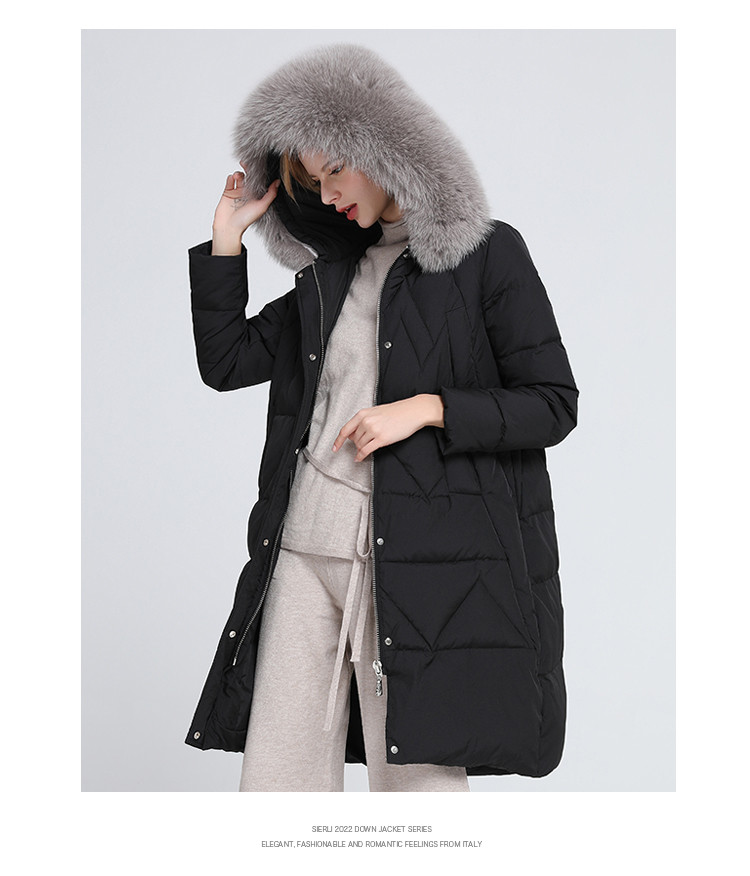 商品名称:超大狐狸毛领连帽冬季厚款收腰遮肉中长款羽绒服女士保暖休闲外套 772767