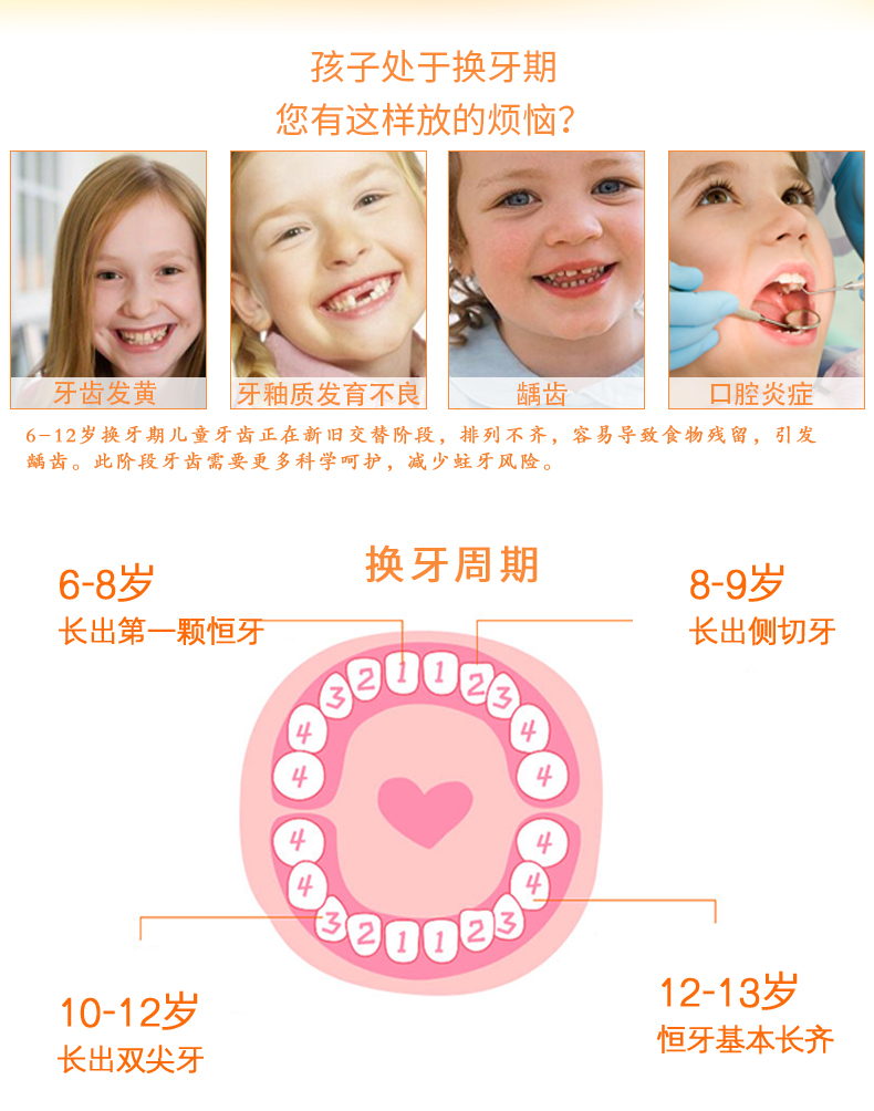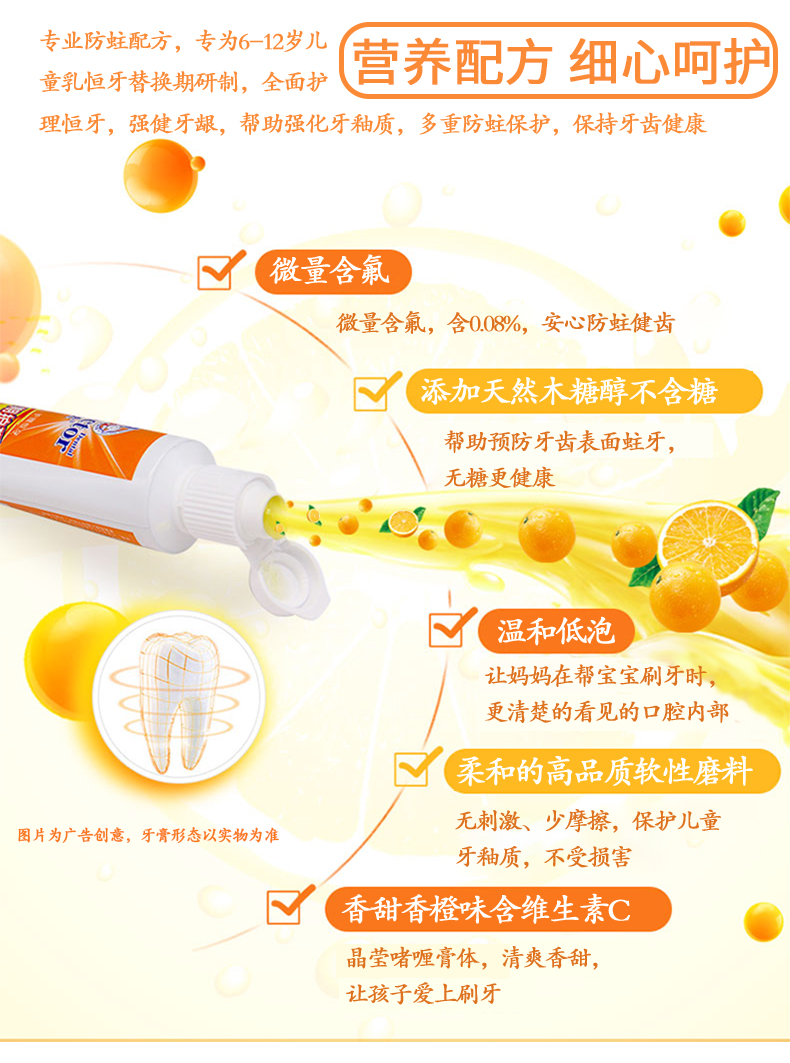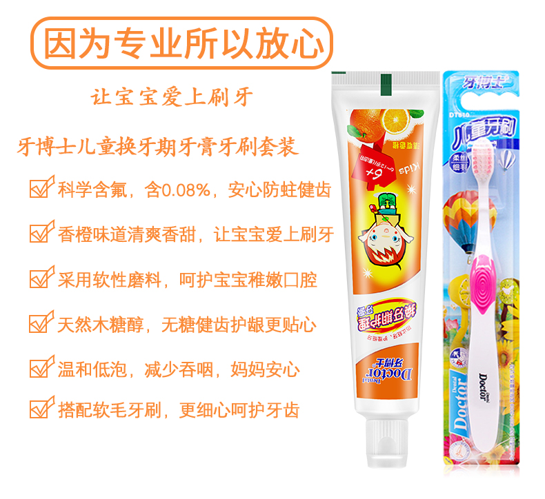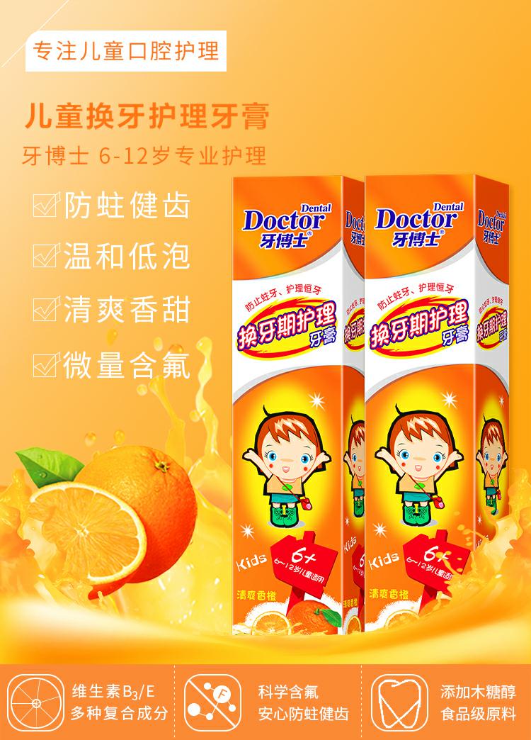 商品名称:牙博士儿童换牙期(6-12岁)套装香橙味牙膏50g*2+赠2支牙