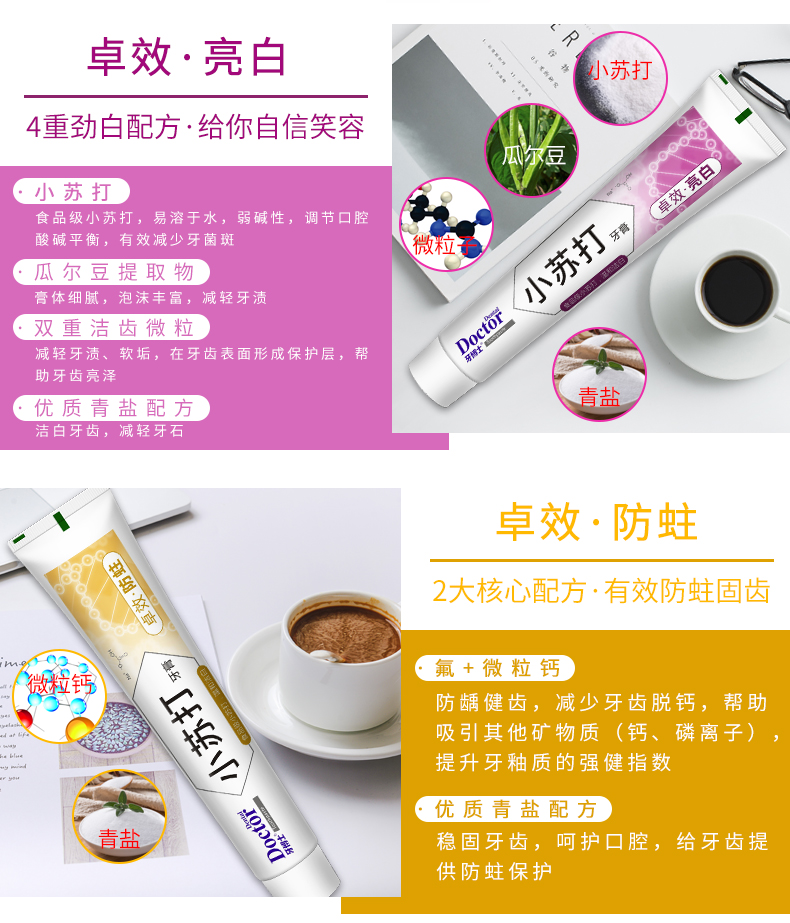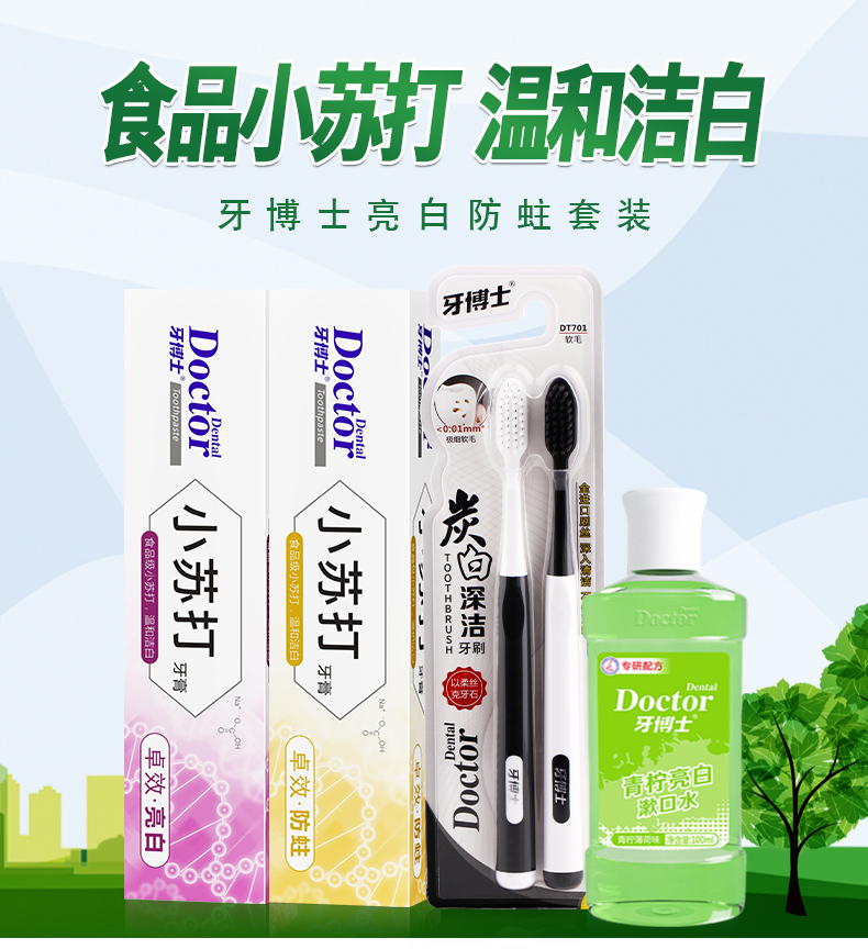 牙博士小苏打亮白防蛀套装牙膏120g*2+碳白牙刷*2+漱口水100ml