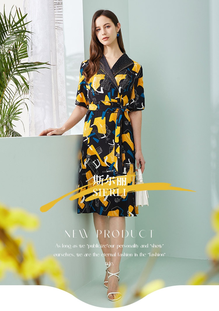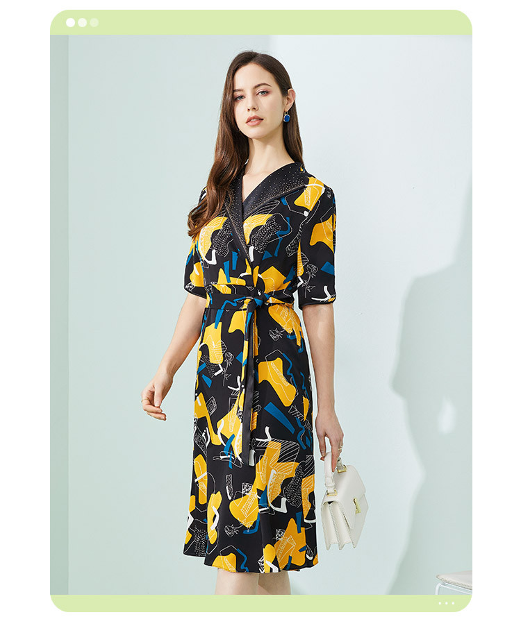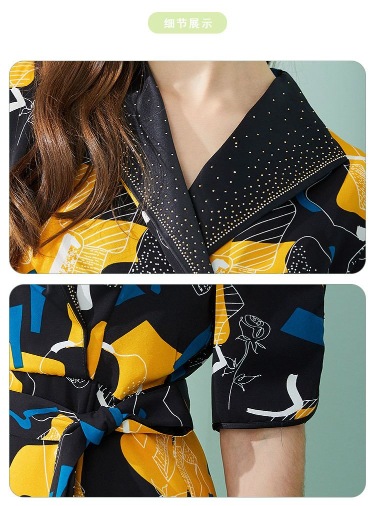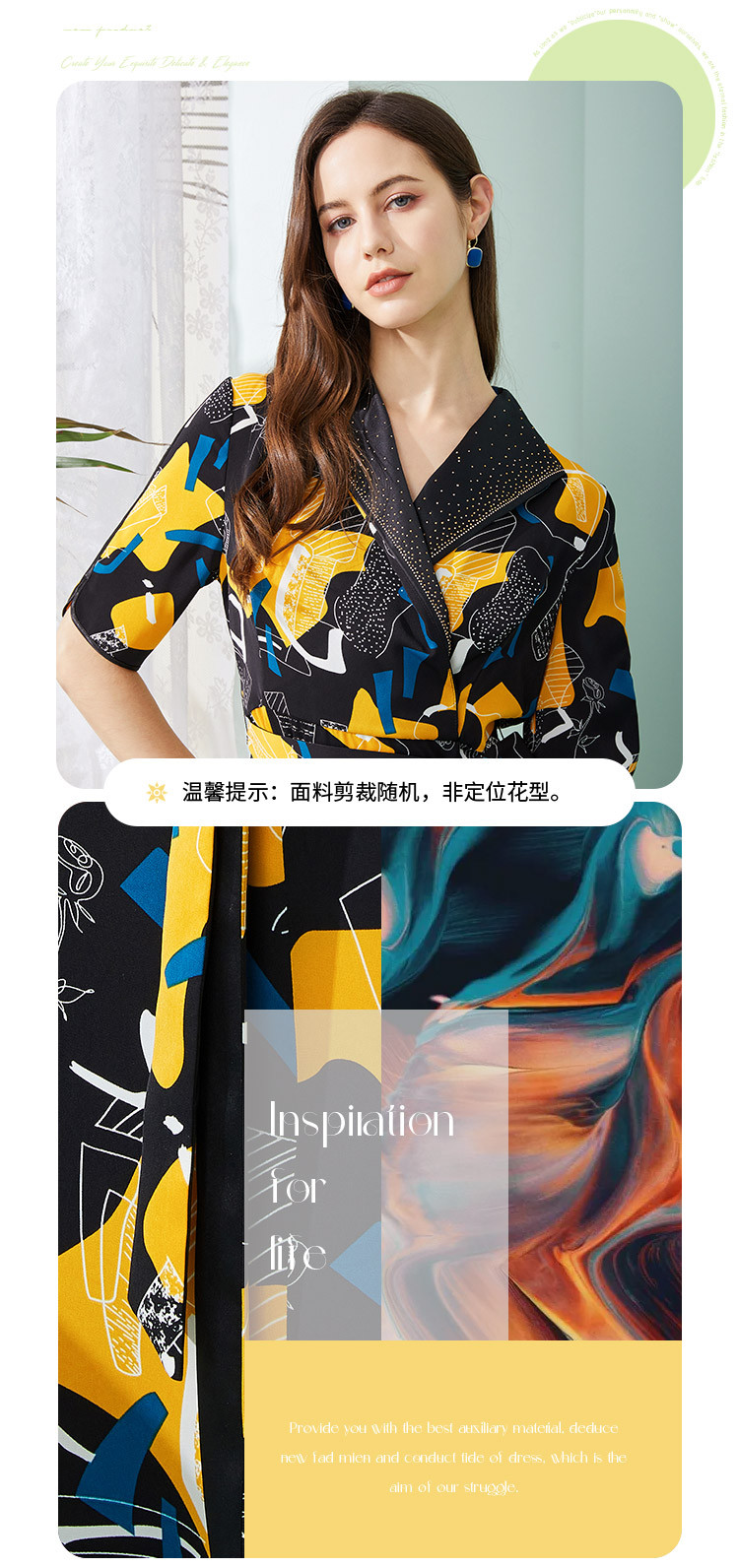 商品名称:商场同款秋季文艺不规则印花西装领撞色烫钻短袖收腰连衣裙 049567