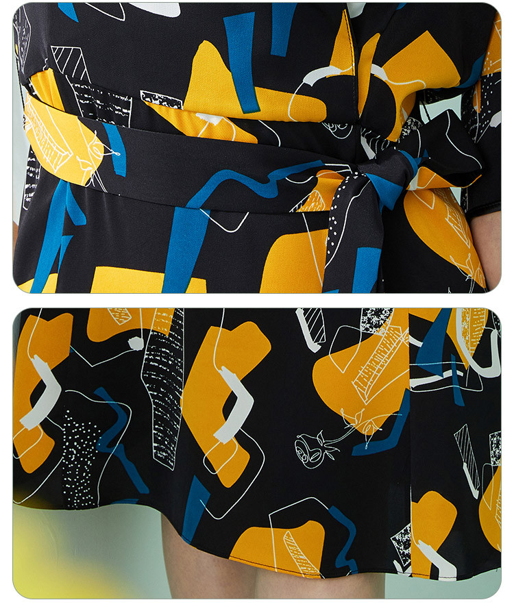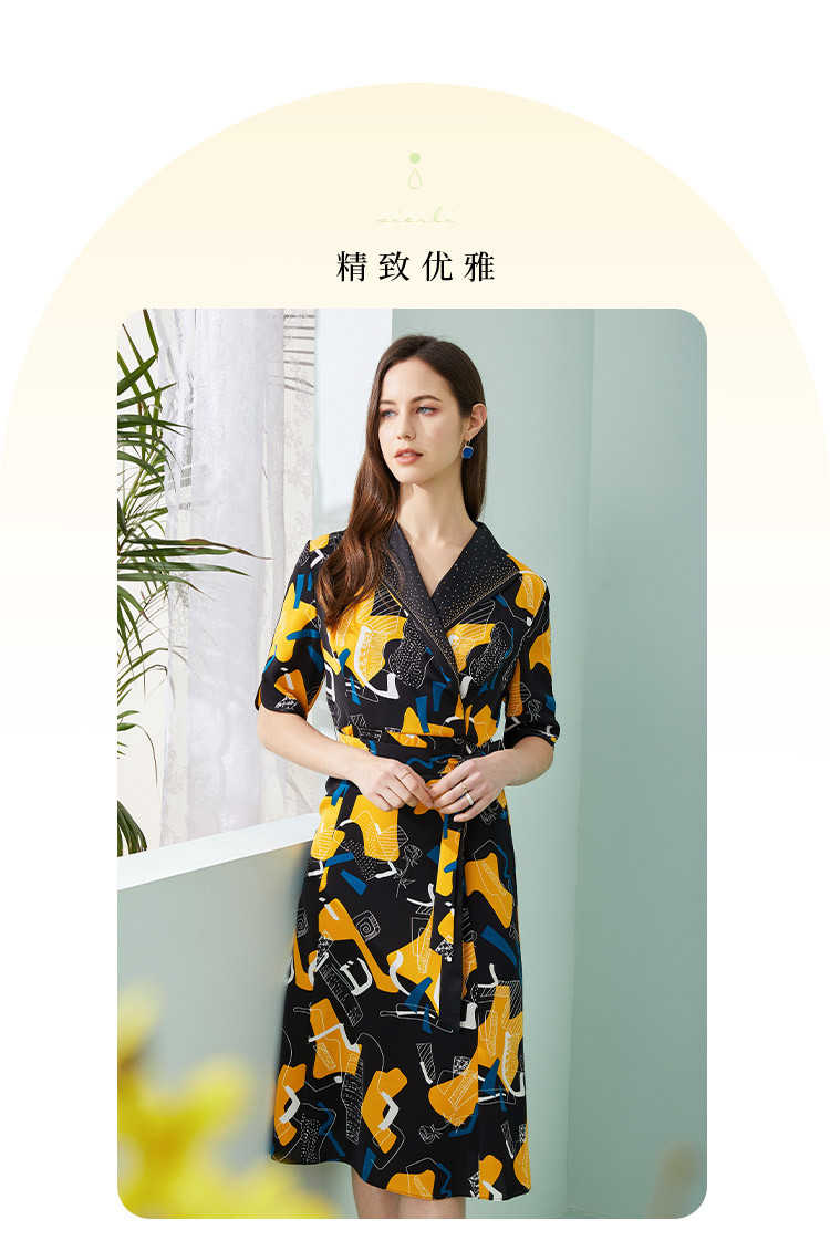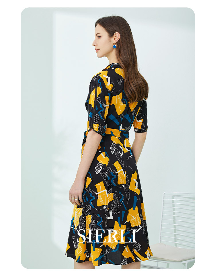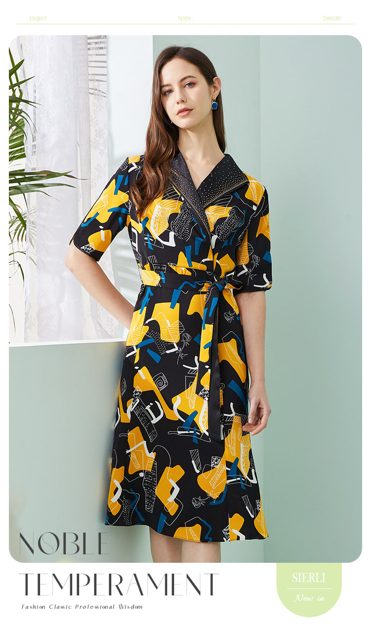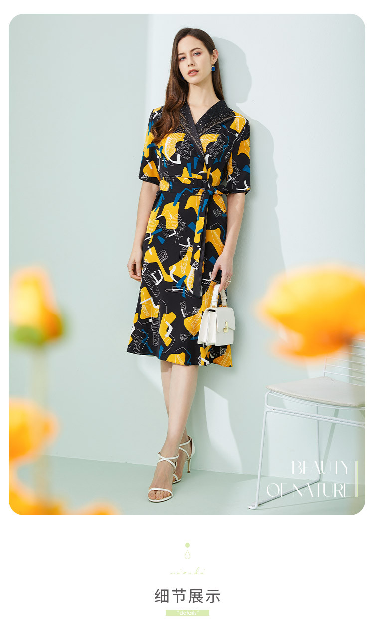 商品名称:商场同款秋季文艺不规则印花西装领撞色烫钻短袖收腰连衣裙 049567