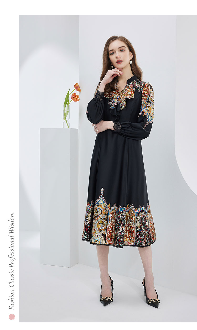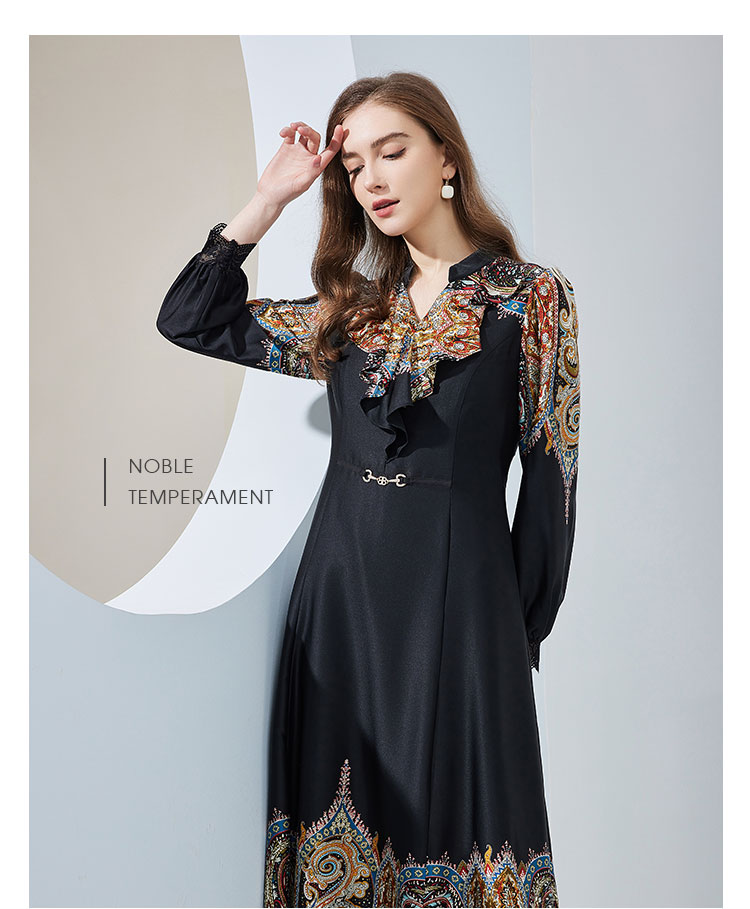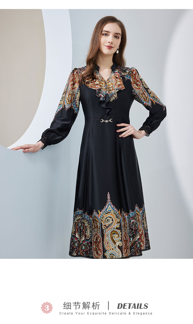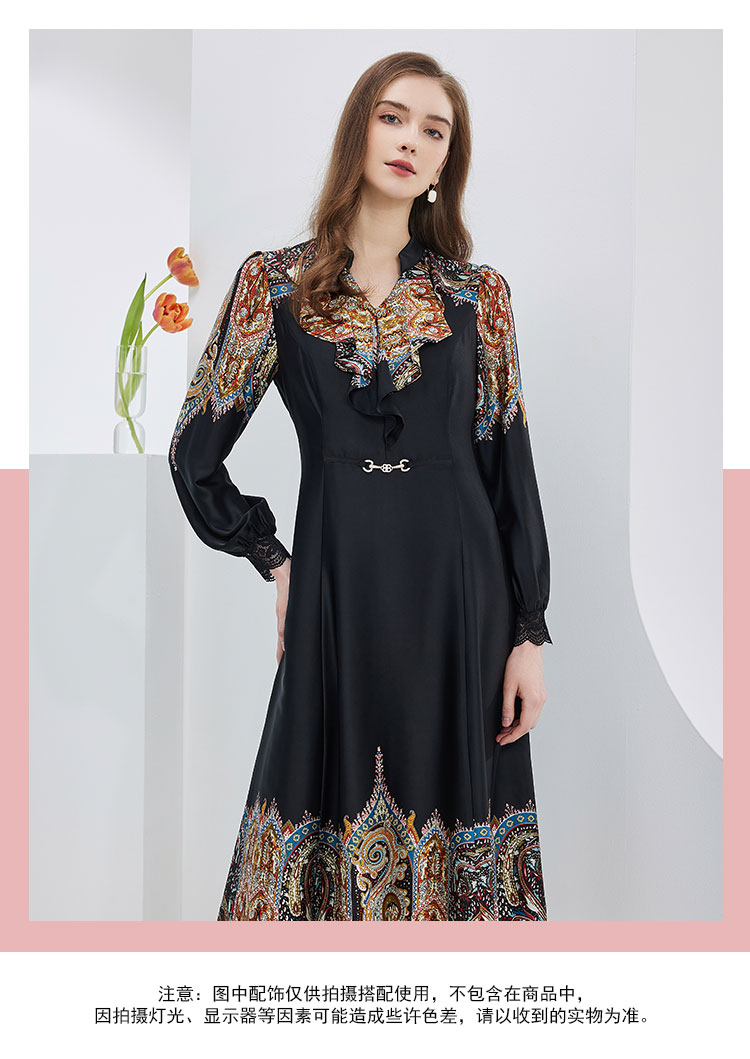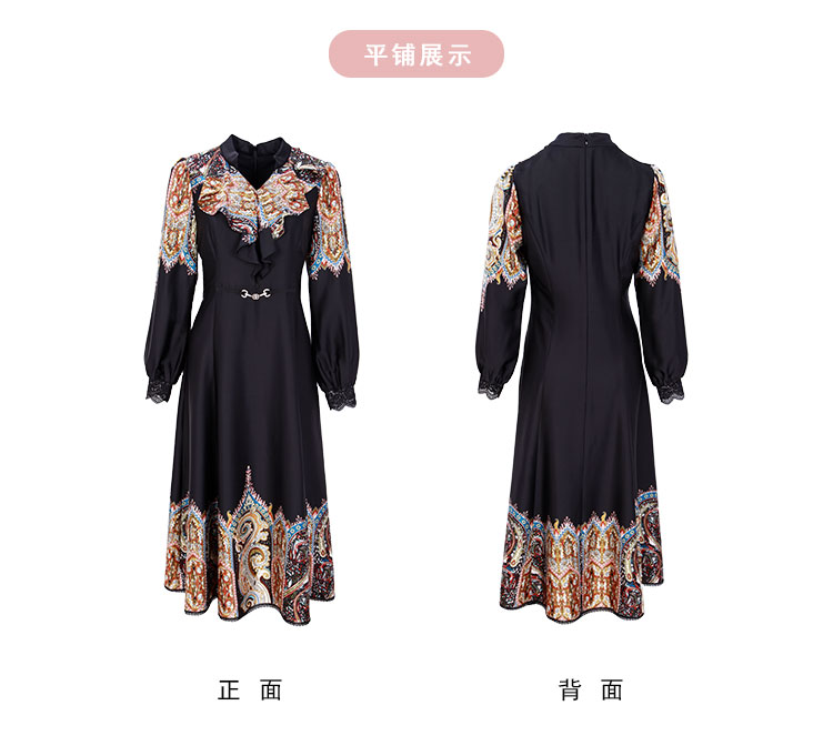 商品名称:春夏波西米亚风定位花收腰大摆长裙荷叶领浪漫感连衣裙 519135
