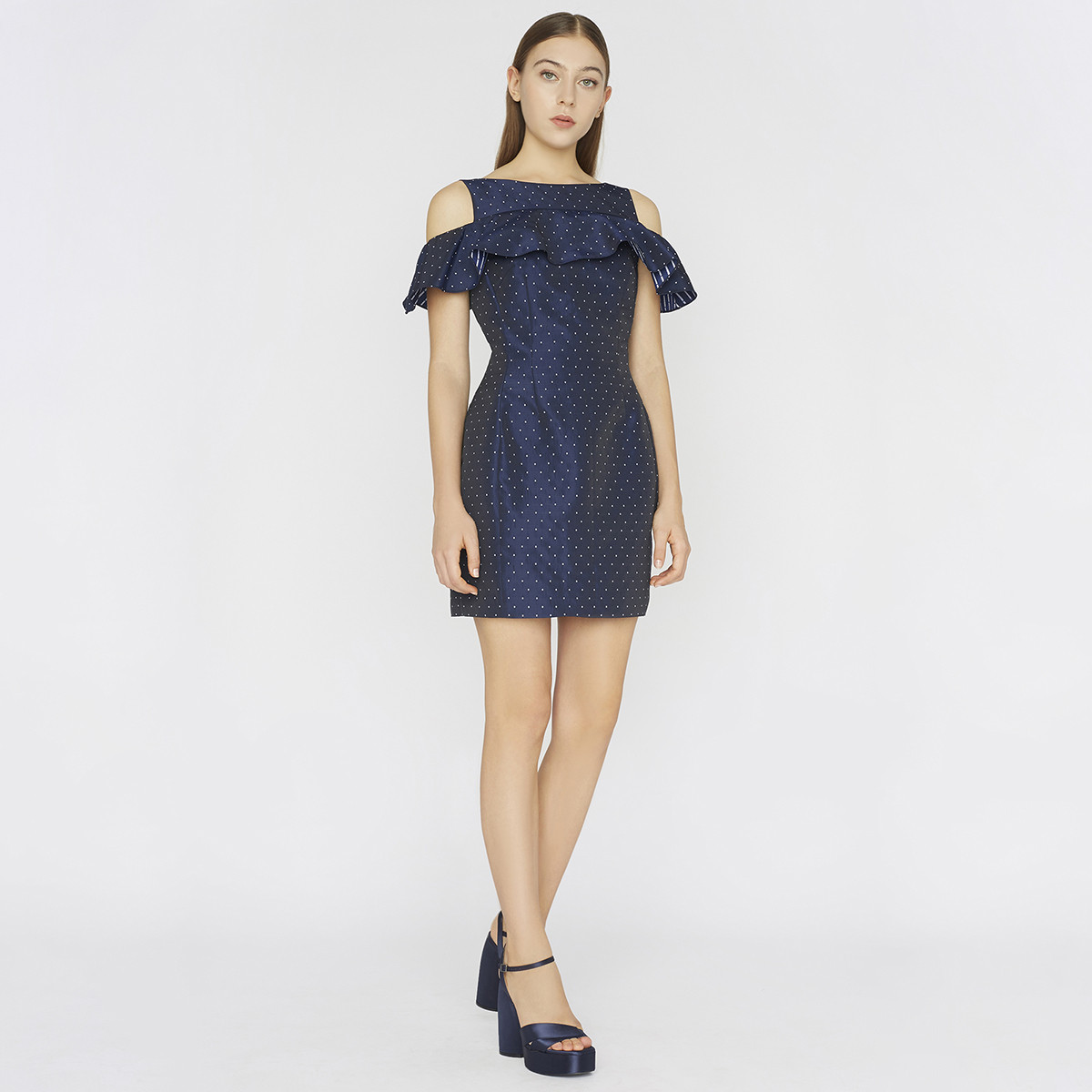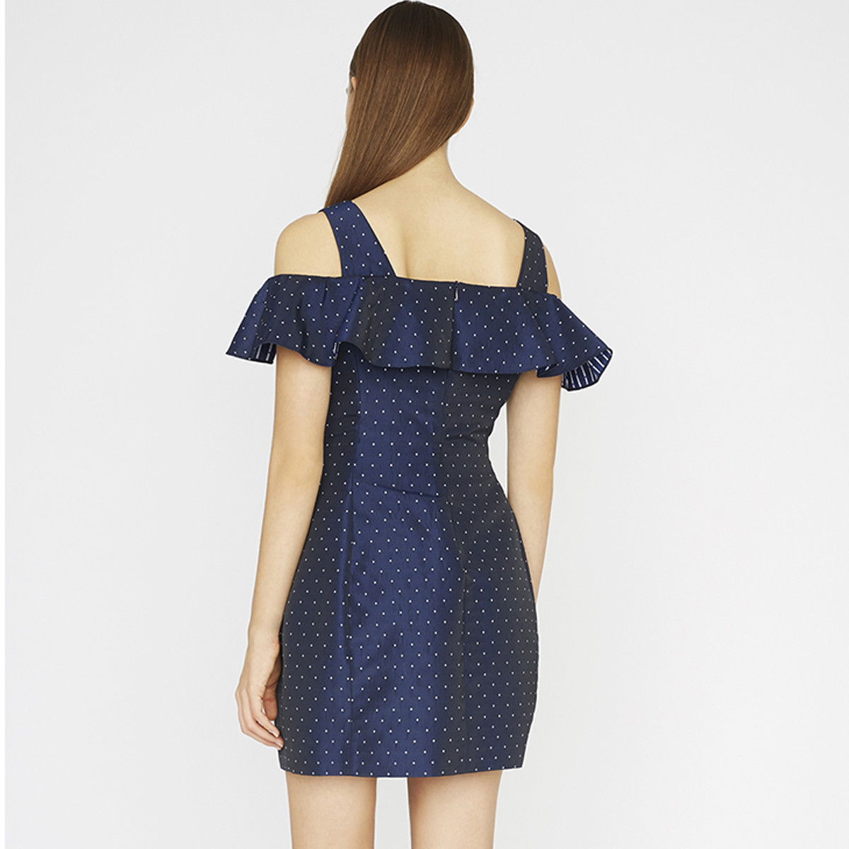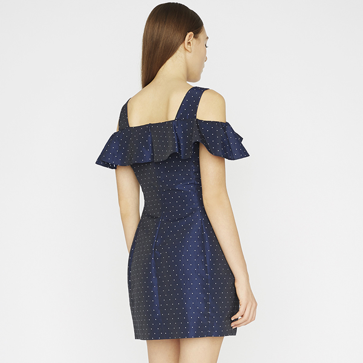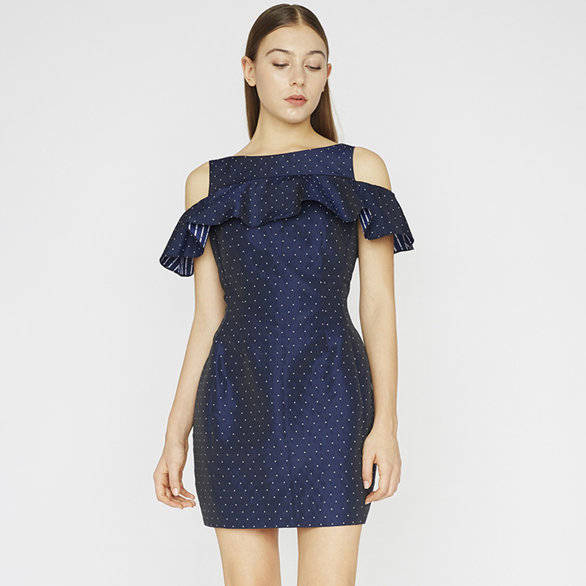 夏装V领抽皱荷叶边波点修身连衣裙 608479