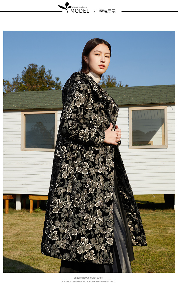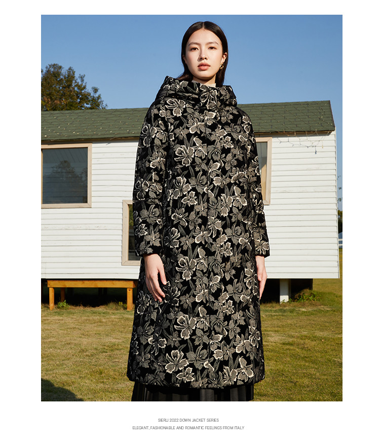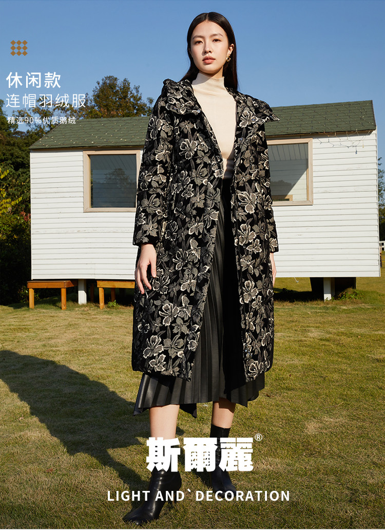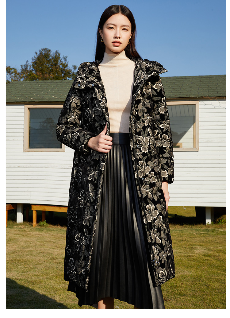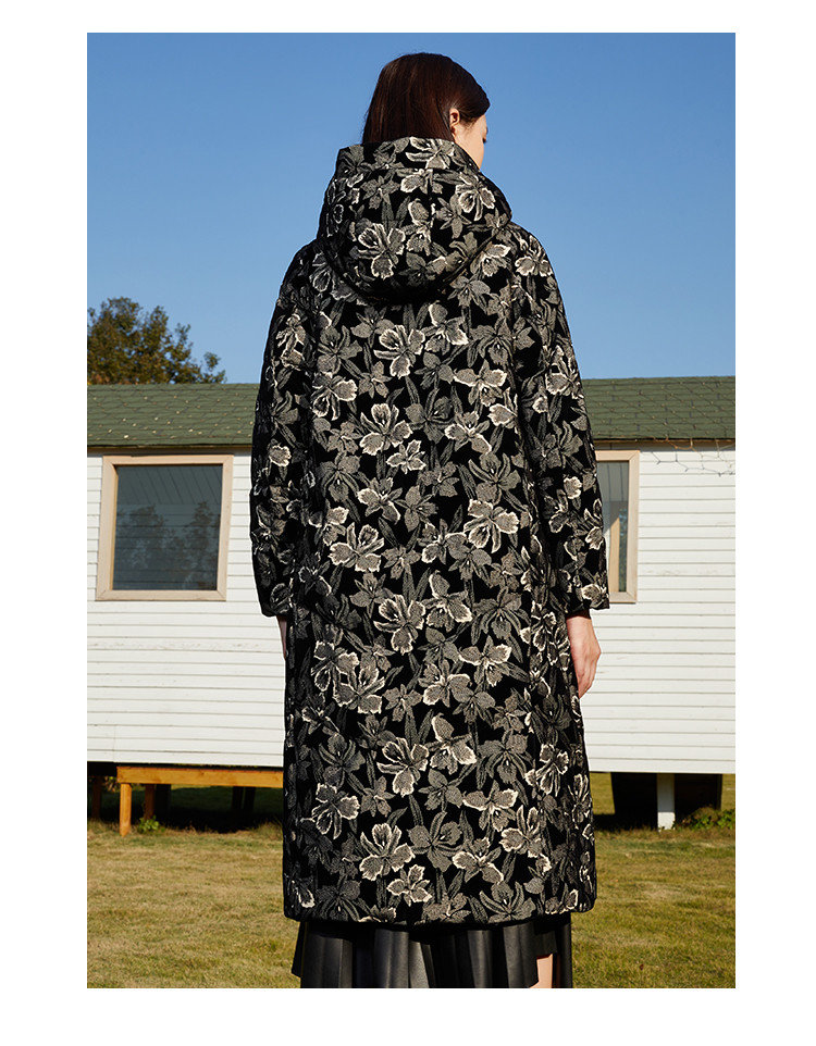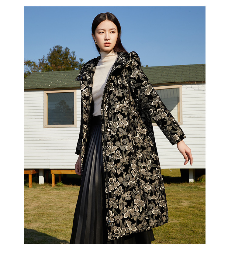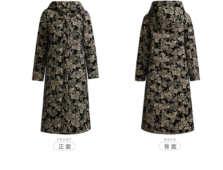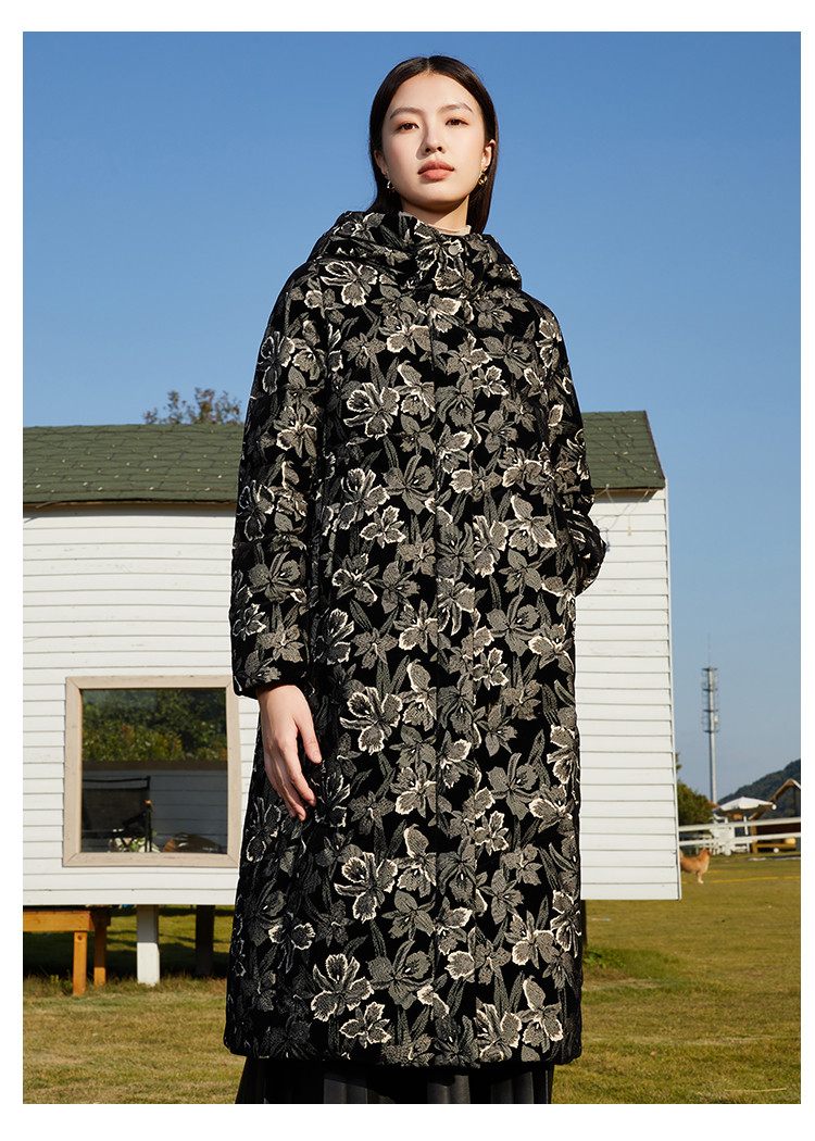 【鹅绒】时尚植绒提花女士厚款连帽过膝休闲长款羽绒服 869983